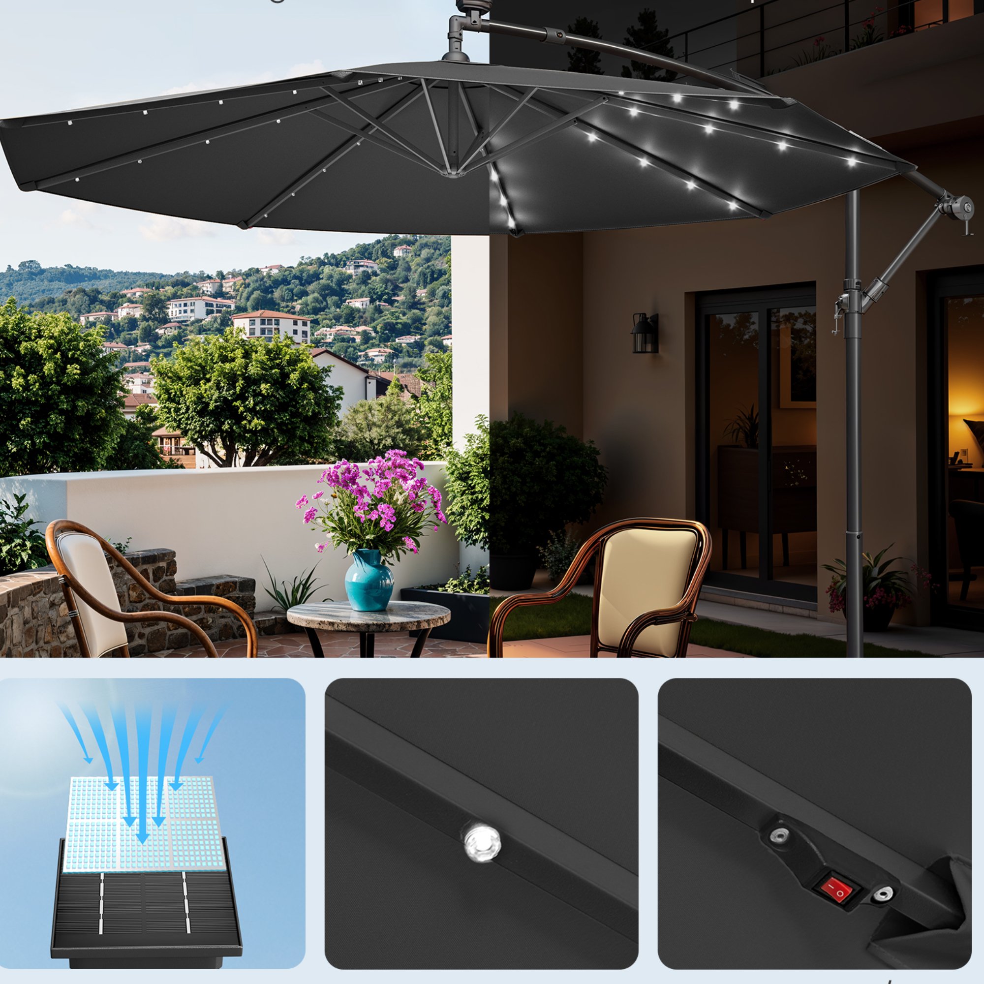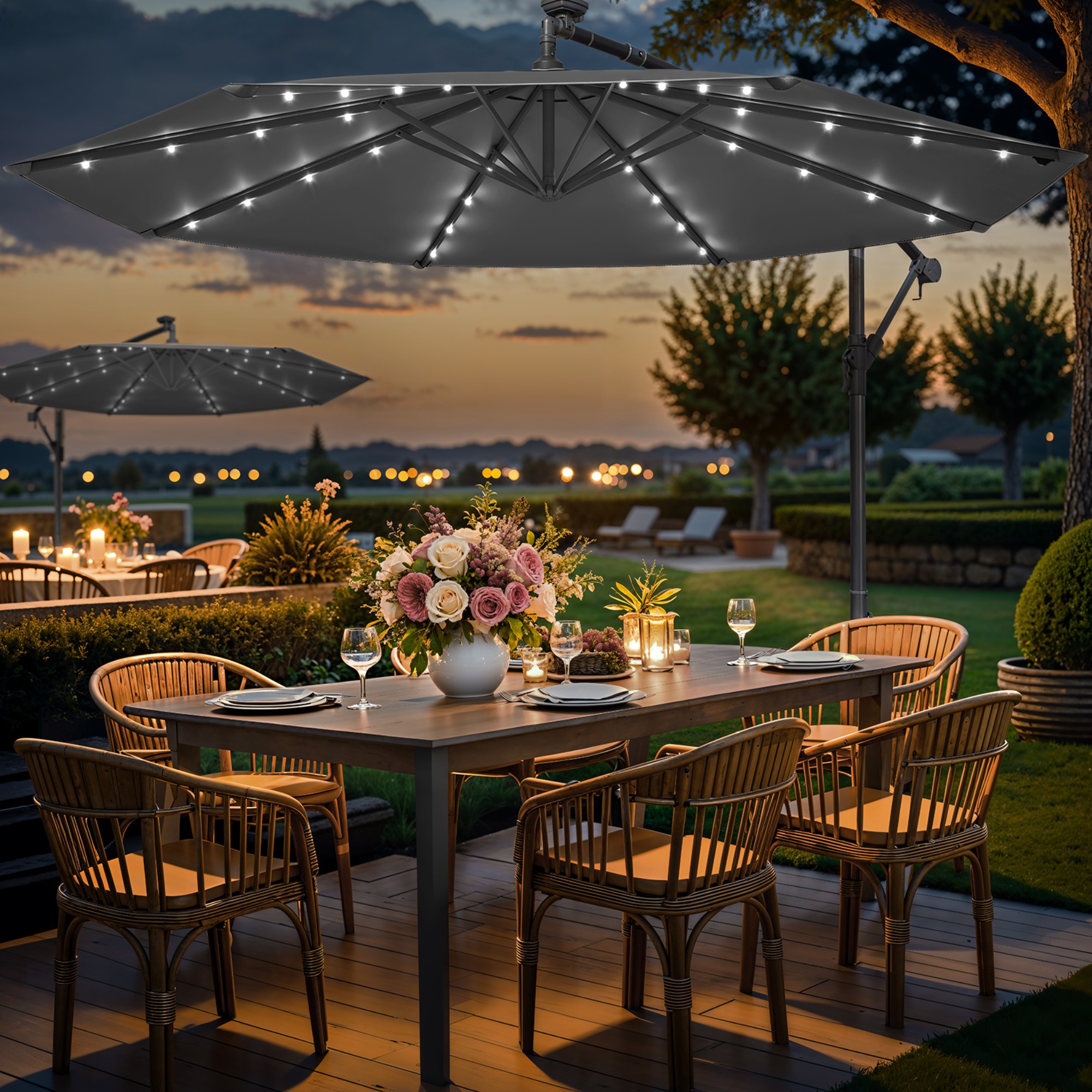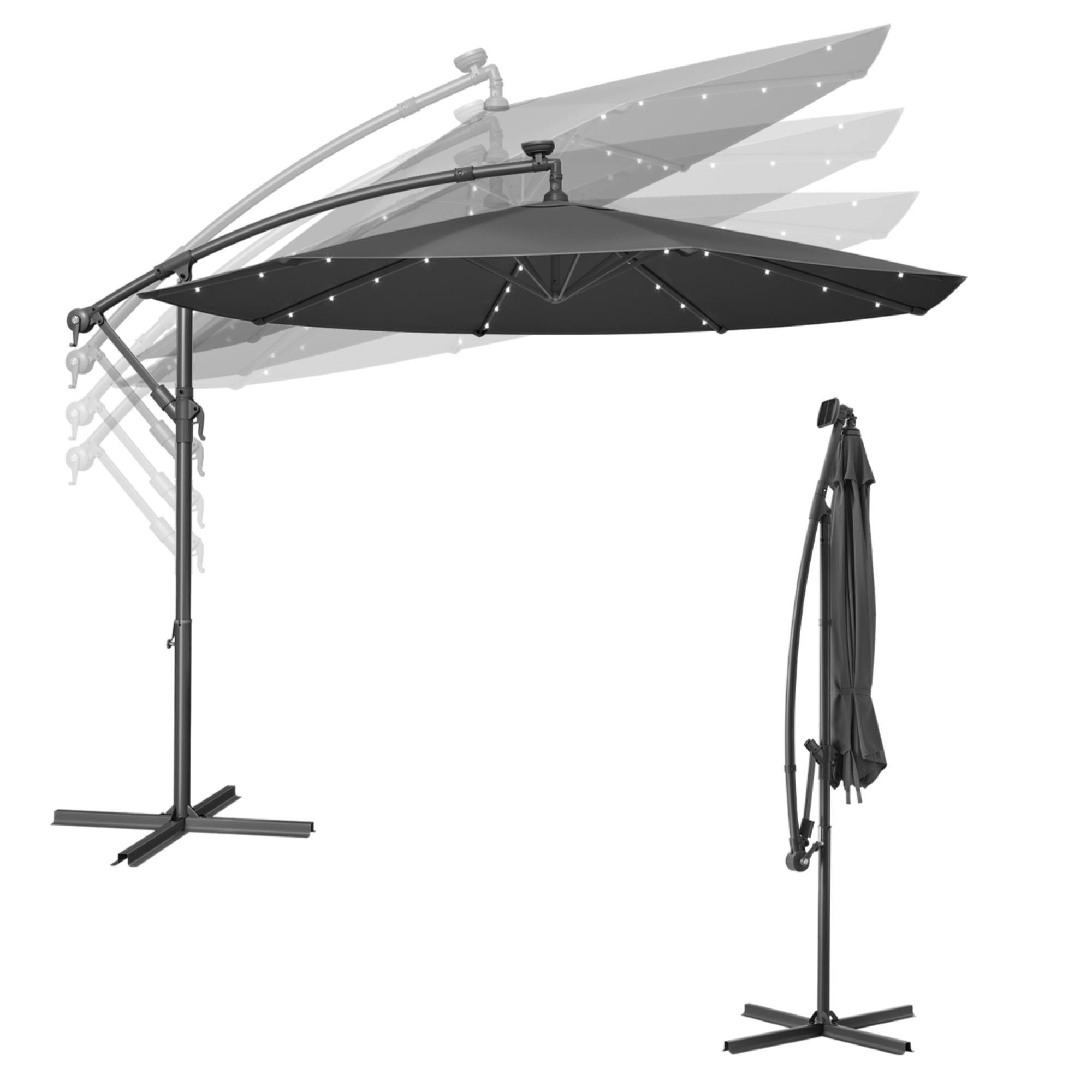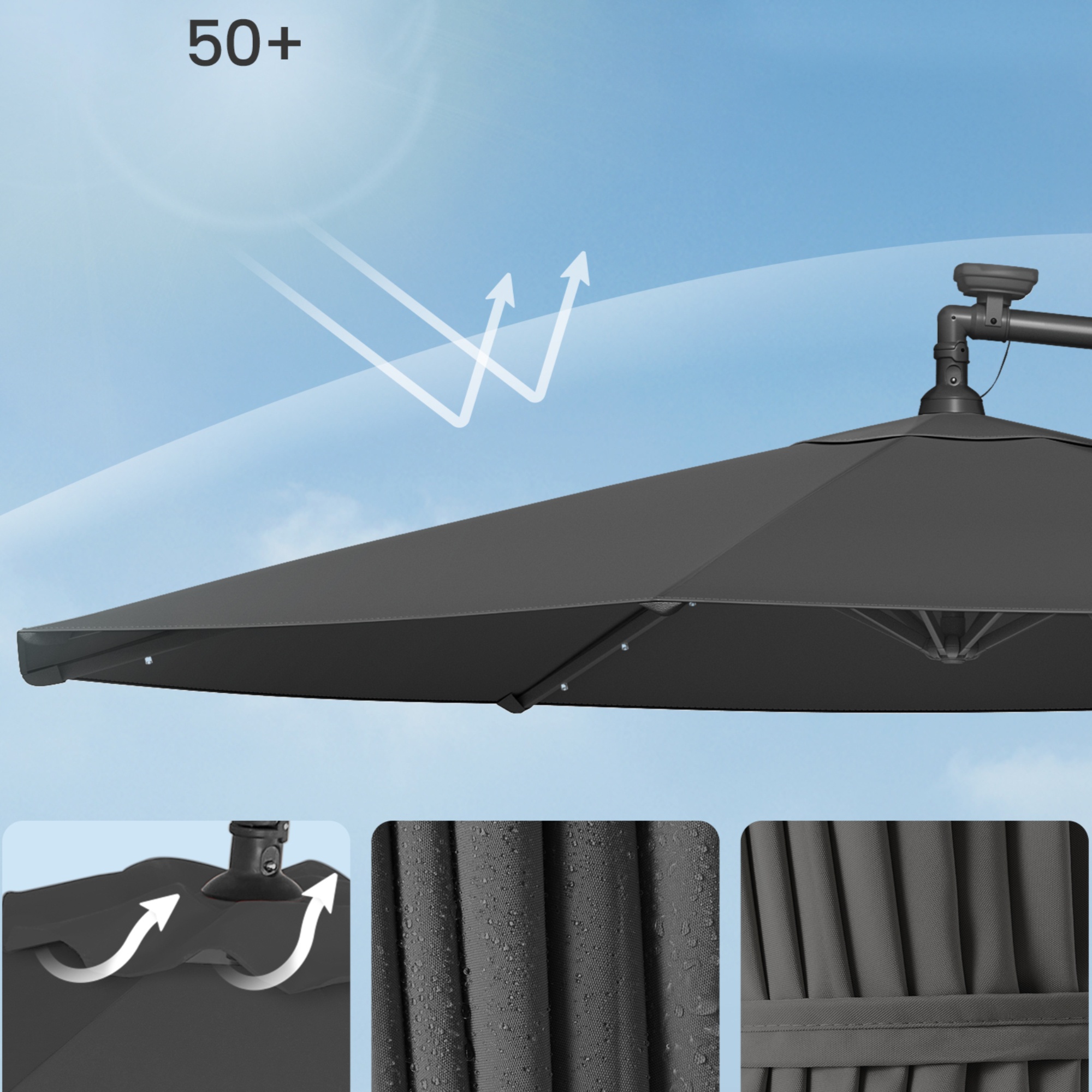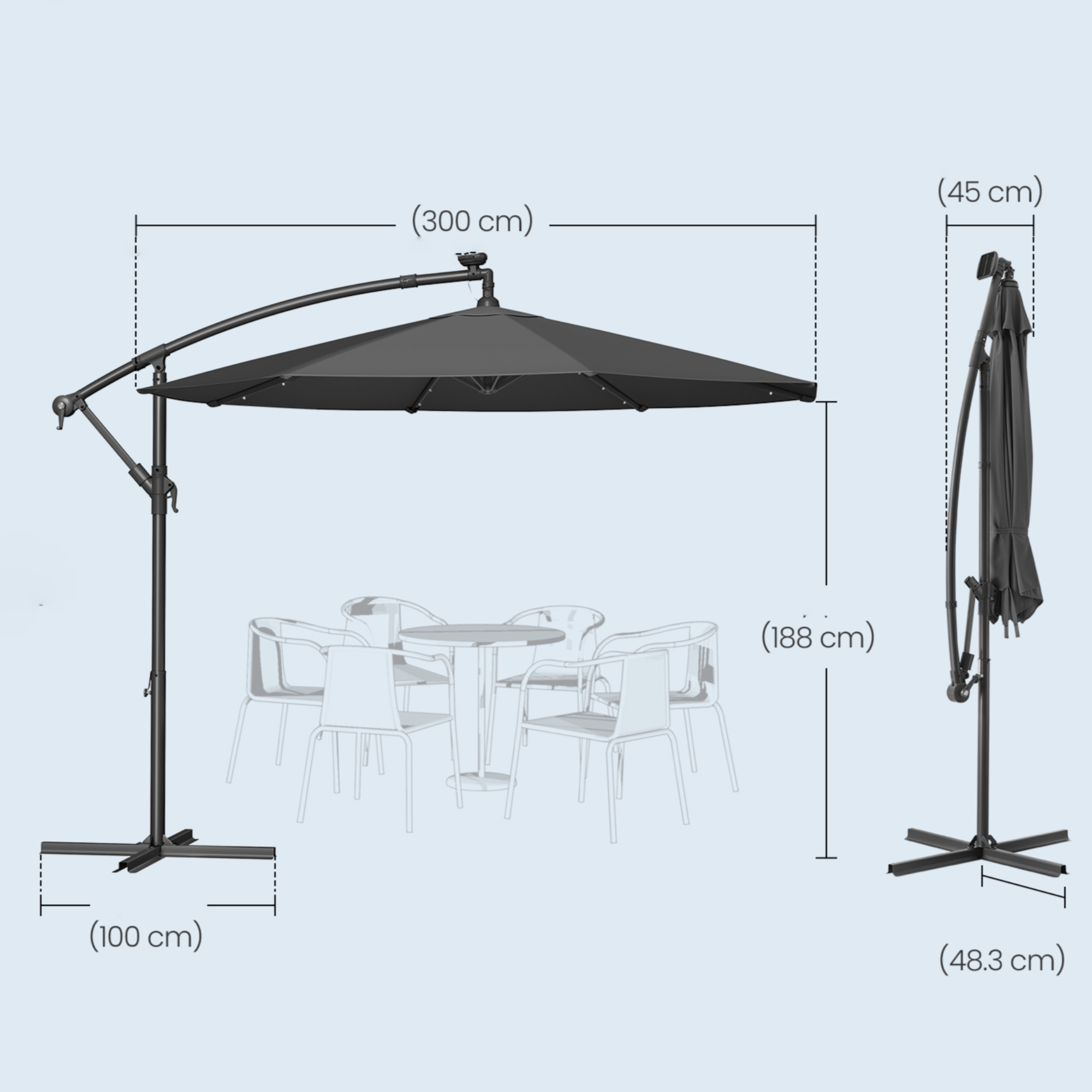 Konštrukcia slnečníka je vyrobená z kovu a jej povrch je práškovo lakovaný. Poťah je z polyesteru, ktorý ponúka ochranu proti slnečnému žiareniu s faktorom UV 50+. Súčasťou slnečníka je 32 LED svetiel napájaných slnečným svetlom, vďaka ktorým ľahko vytvoríte romantickú atmosféru až na 6 hodín.