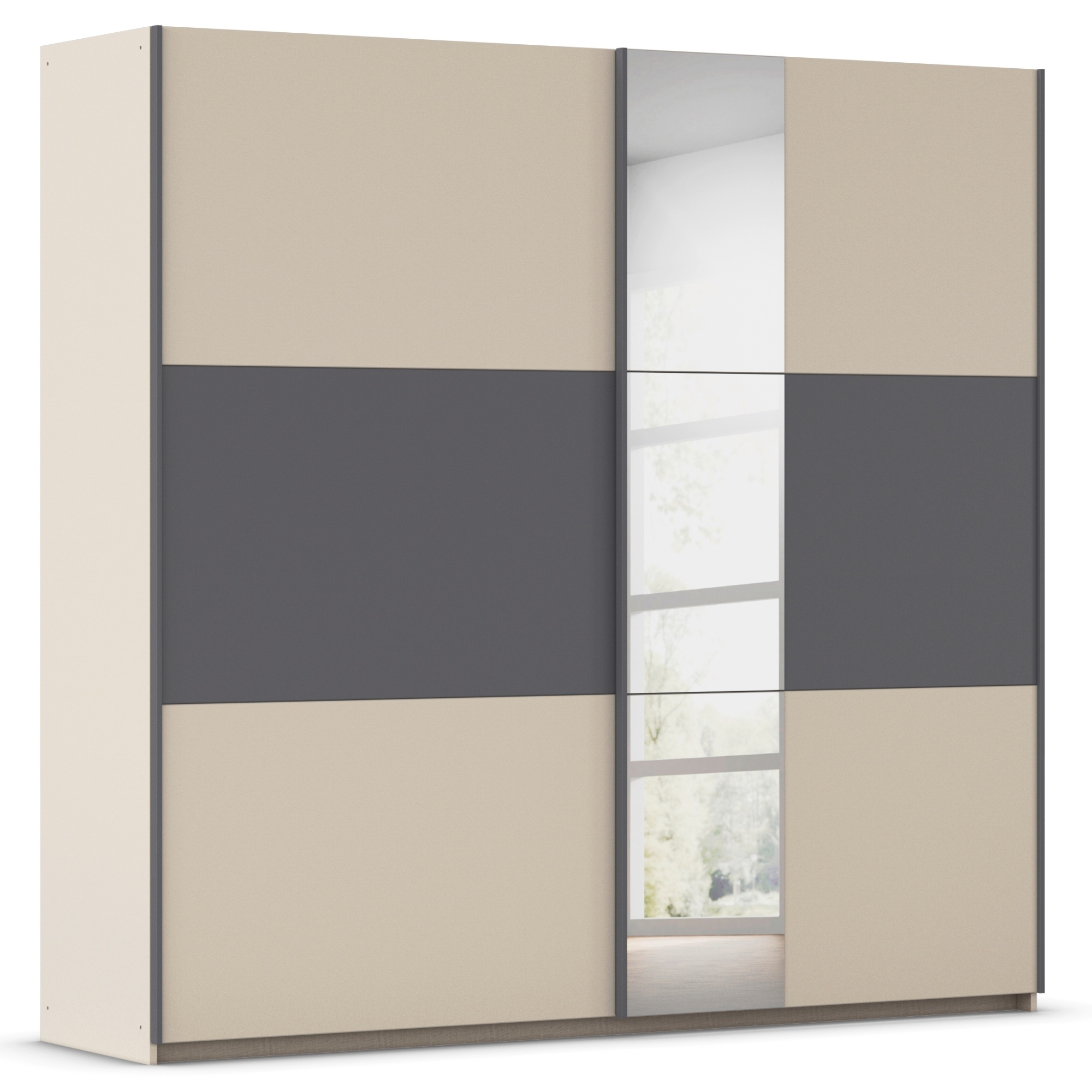 Neoddeliteľnou súčasťou spálne je aj priestranná šatníková skriňa, ktorá ponúka dostatok miesta na prehľadné uskladnenie oblečenia. Vnútorný priestor je rozdelený na 2 bloky, kedy v každom z nich sa nachádza šatníková tyč a vložená polica nad ňou. Skriňu uzatvárajú posuvné dvere šetriace miesto zvonku aj vo vnútri skrine. Jedny z nich sú navyše vybavené praktickým zrkadlom, ktoré presvetlí a opticky zväčší miestnosť.