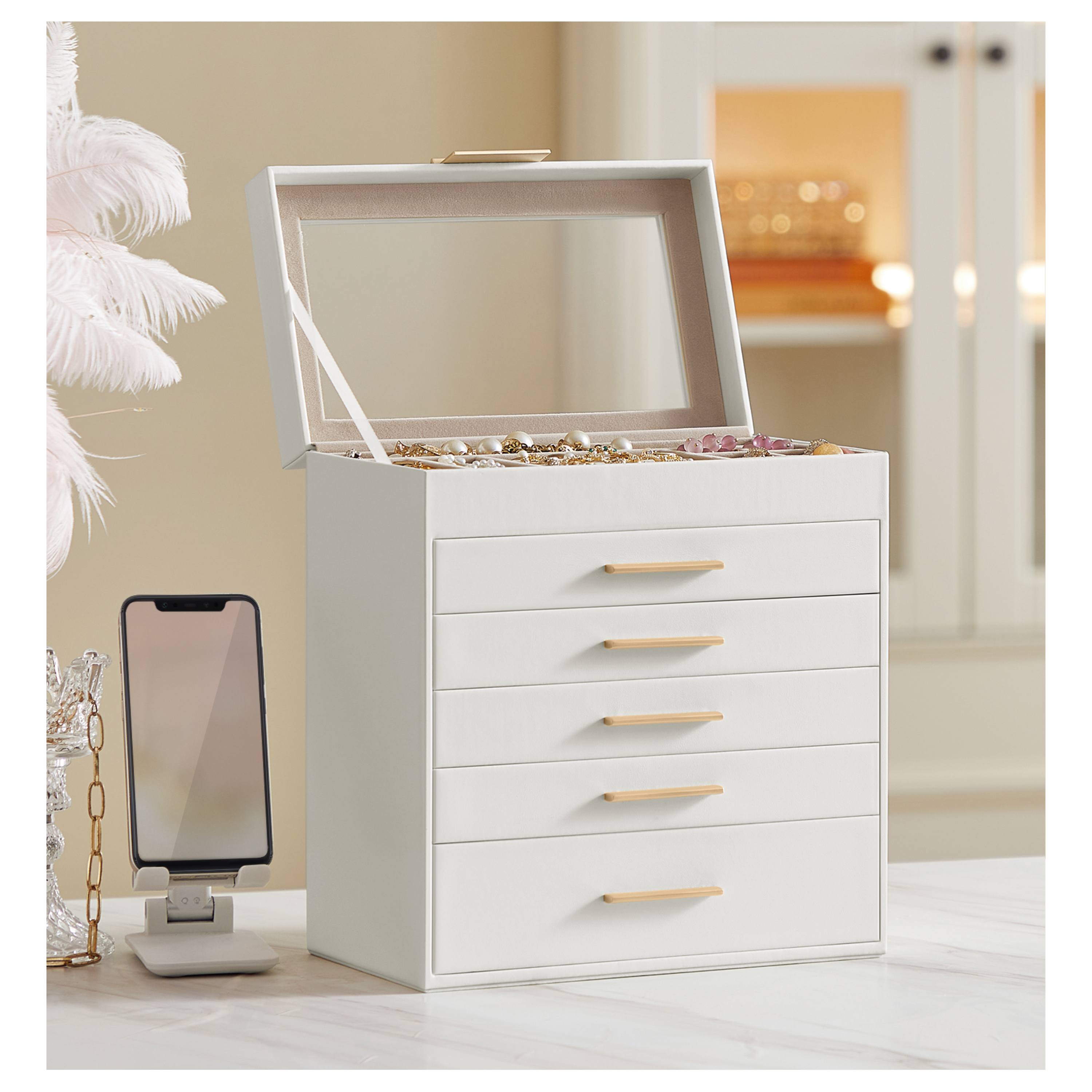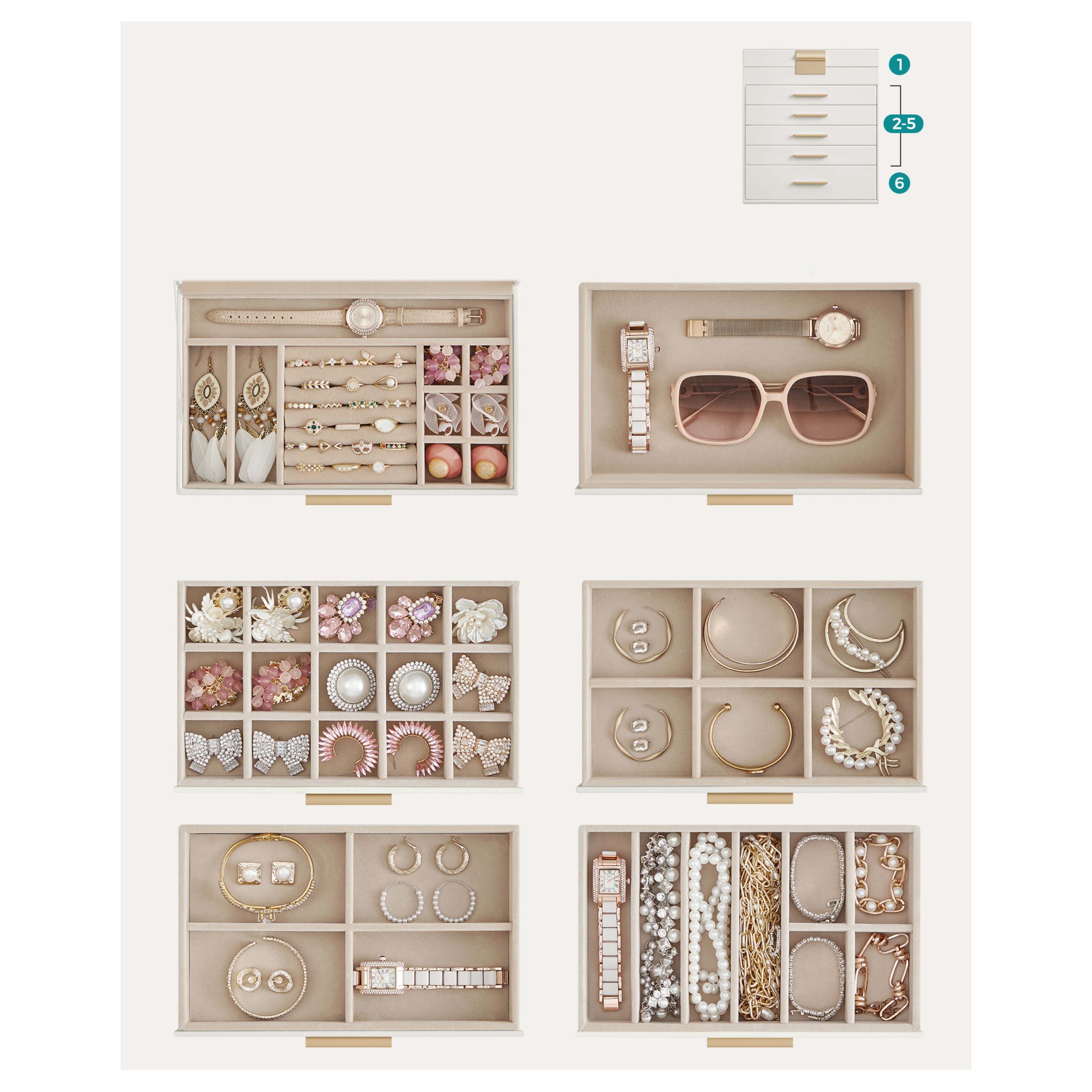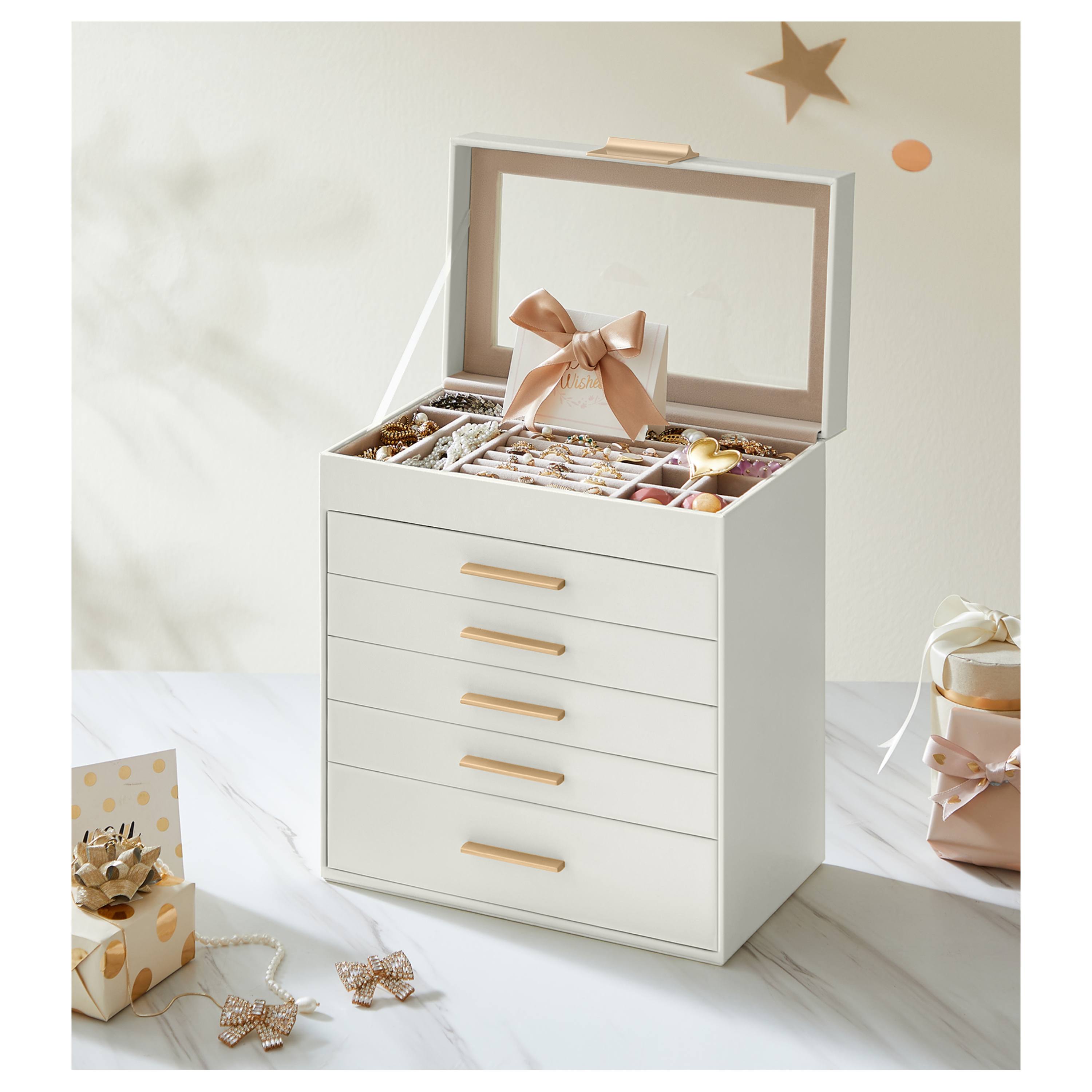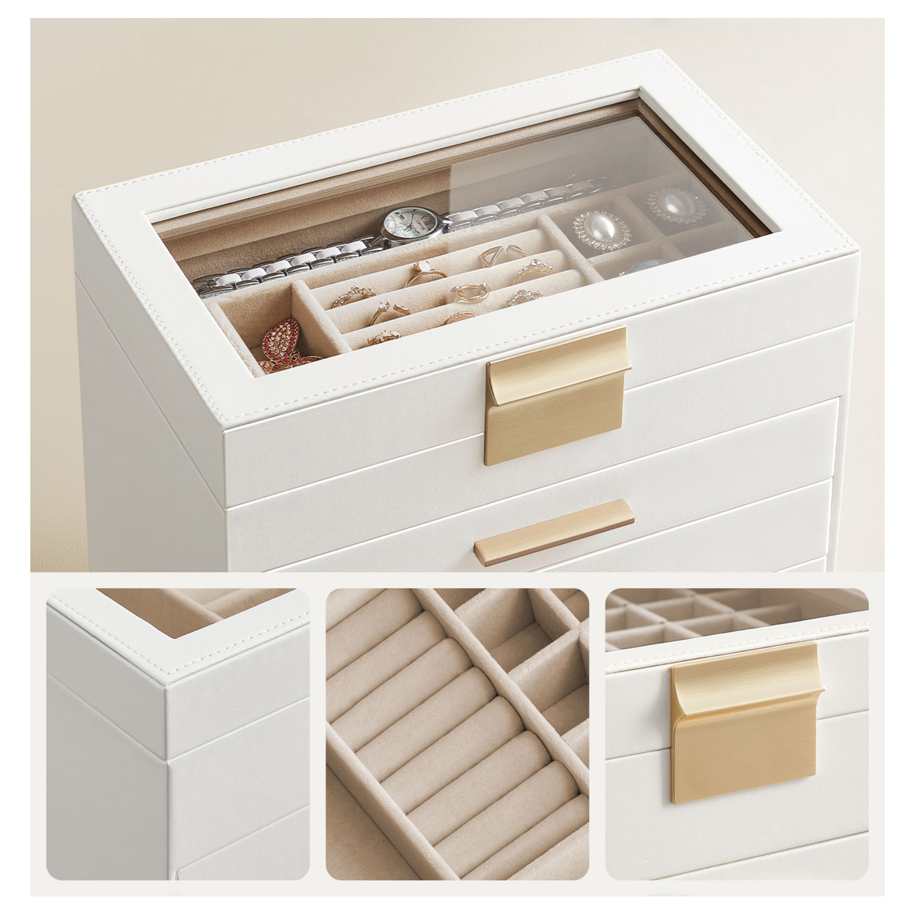 Je vybavená sklenenými dvierkami s okienkom, za ktorými sa nachádzajú priehradky s miestom na uloženie rôznych druhov šperkov. Disponuje 4 menšími zásuvkami, ktoré možno usporiadať podľa potreby. Zásuvky majú rôzne priehradky na uloženie náušníc, náramkov a hodiniek. Má 1 väčšiu zásuvku, ideálnu na ďalšie doplnky, ako sú slnečné okuliare. Vaše šperky budú šetrne uložené v interiéri vystlanom tkaninou so zamatovým vzhľadom.