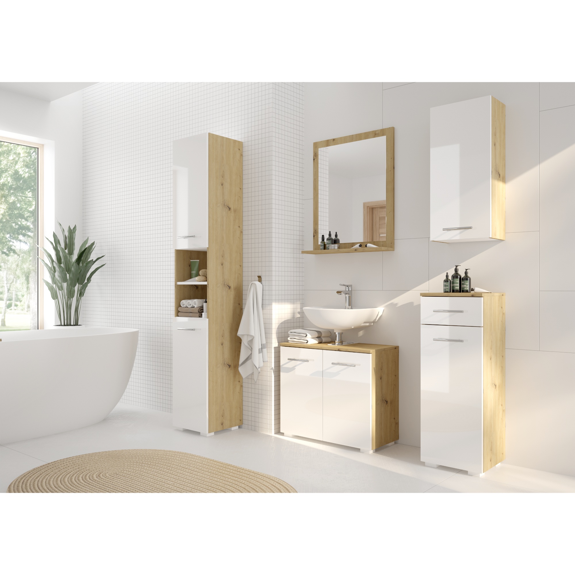 Kúpeľňová skrinka SANTINO je ideálnym riešením krytého úložného priestoru. Predná plocha v neutrálnej farbe a vo vysokom lesku v kombinácii s prírodným dekorom pristane moderne zariadenej kúpeľni.