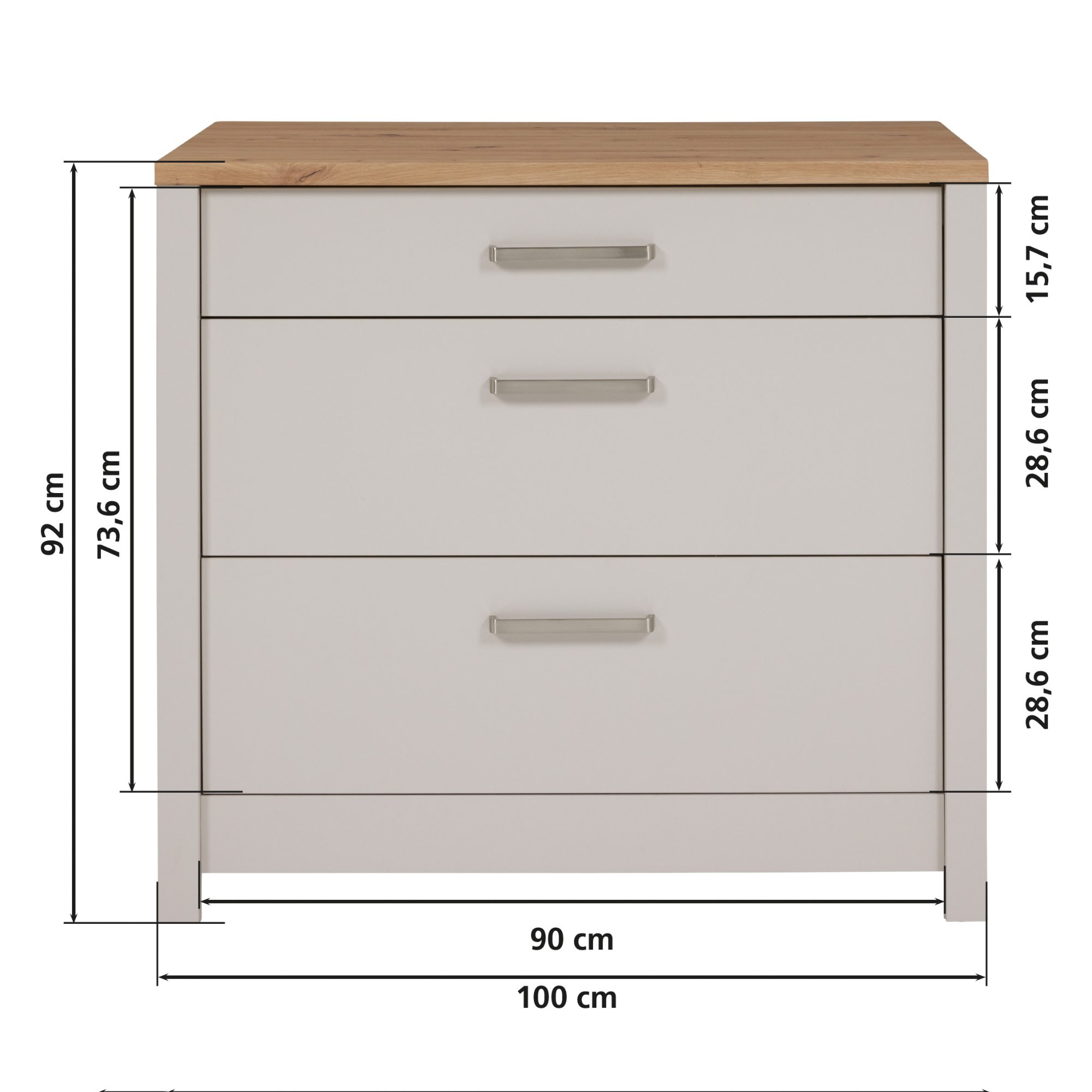 Je vybavená 3 zásuvkami s robustnými úchytkami a systémom tichého dovierania pre jednoduchú manipuláciu. Veľká pracovná doska ponúka priestor na umiestnenie varnej dosky so šírkou 60 alebo 90 cm. Zásuvky sú vybavené skrytými plnovýsuvnými pojazdmi so spodnou montážou, ktoré umožňujú plné vysunutie.