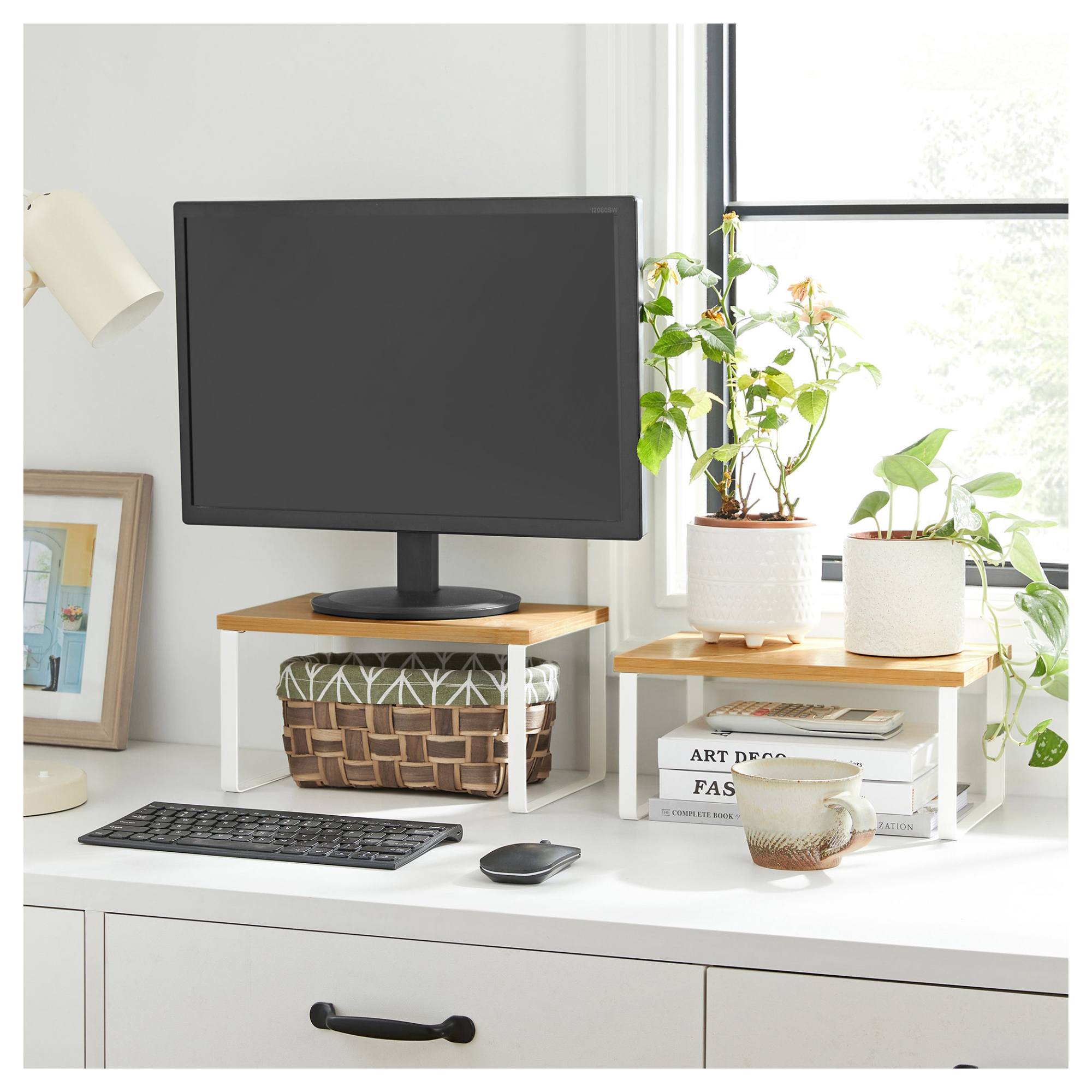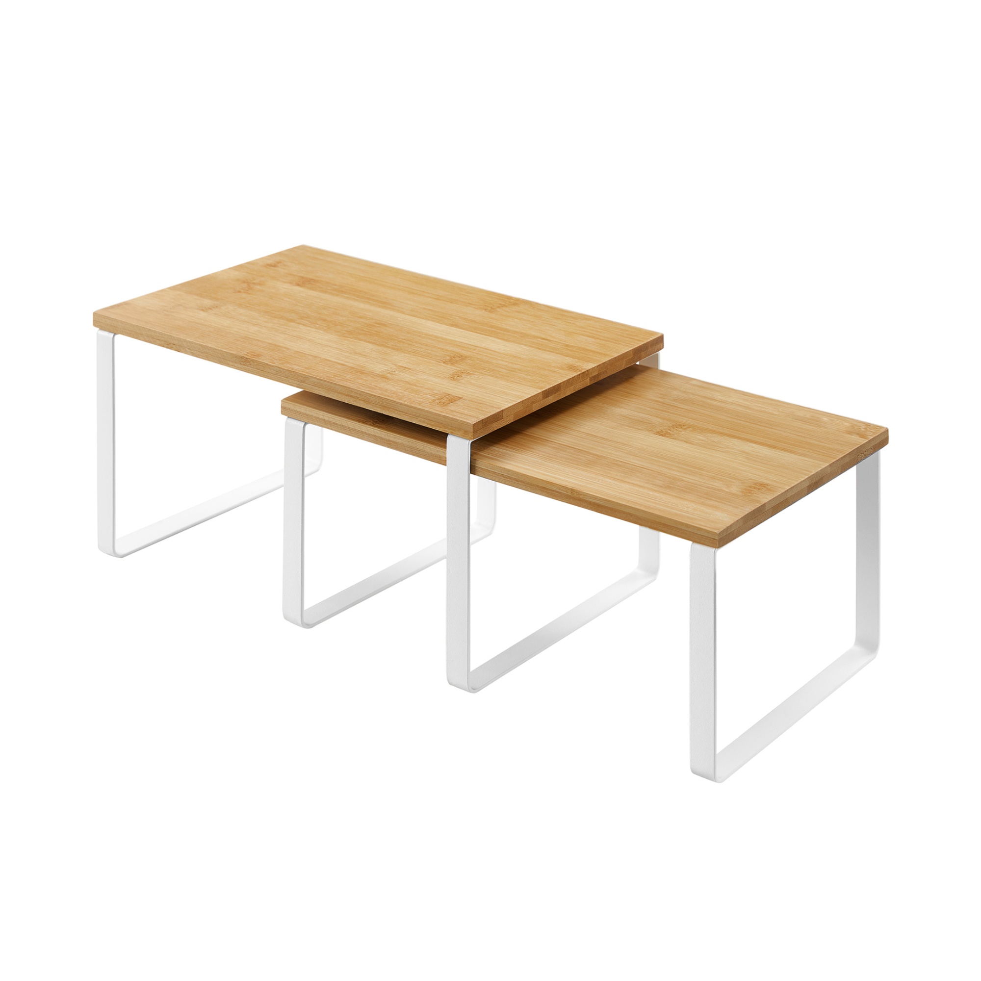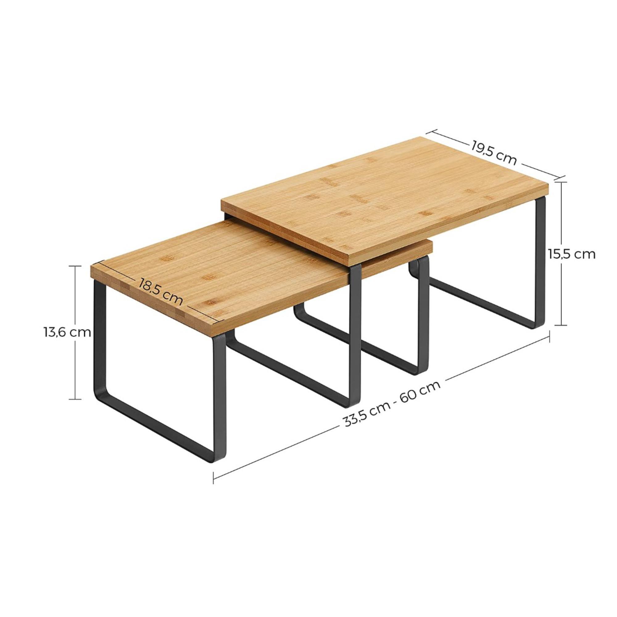 Dva robustné bambusové stojany s kovovou konštrukciou je možné využívať ako celok alebo aj samostatne. Môžete ich umiestniť do skrinky a úložný priestor tak ľahko a rýchlo predeliť umelým vytvorením ďalšieho poschodia. Stojany vás zaujmú svojou multifunkčnosťou, pretože ich môžete využiť aj v iných častiach vášho domova. Stanú sa štýlovými a praktickými pomocníkmi aj v obývacej izbe alebo domácej kancelárii.