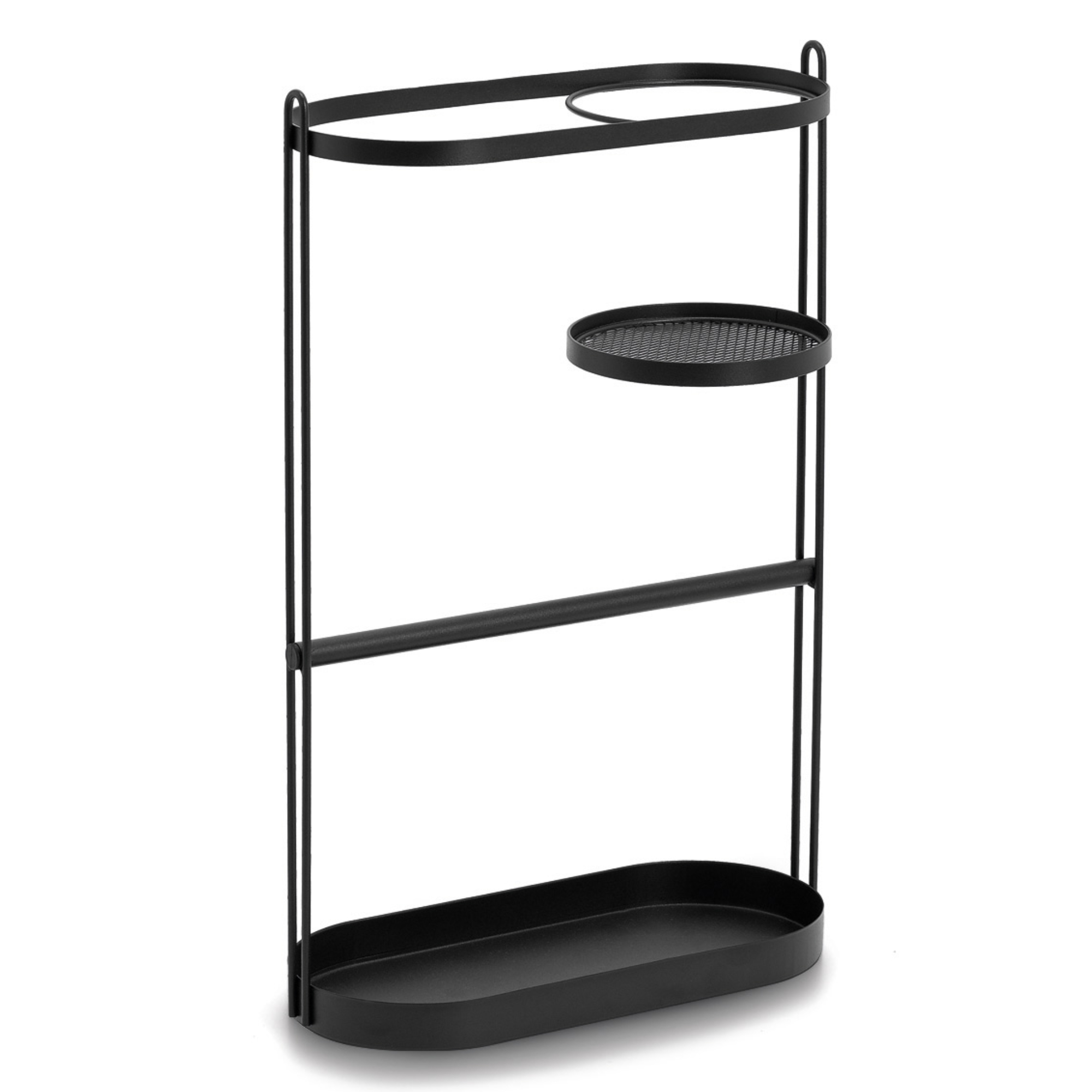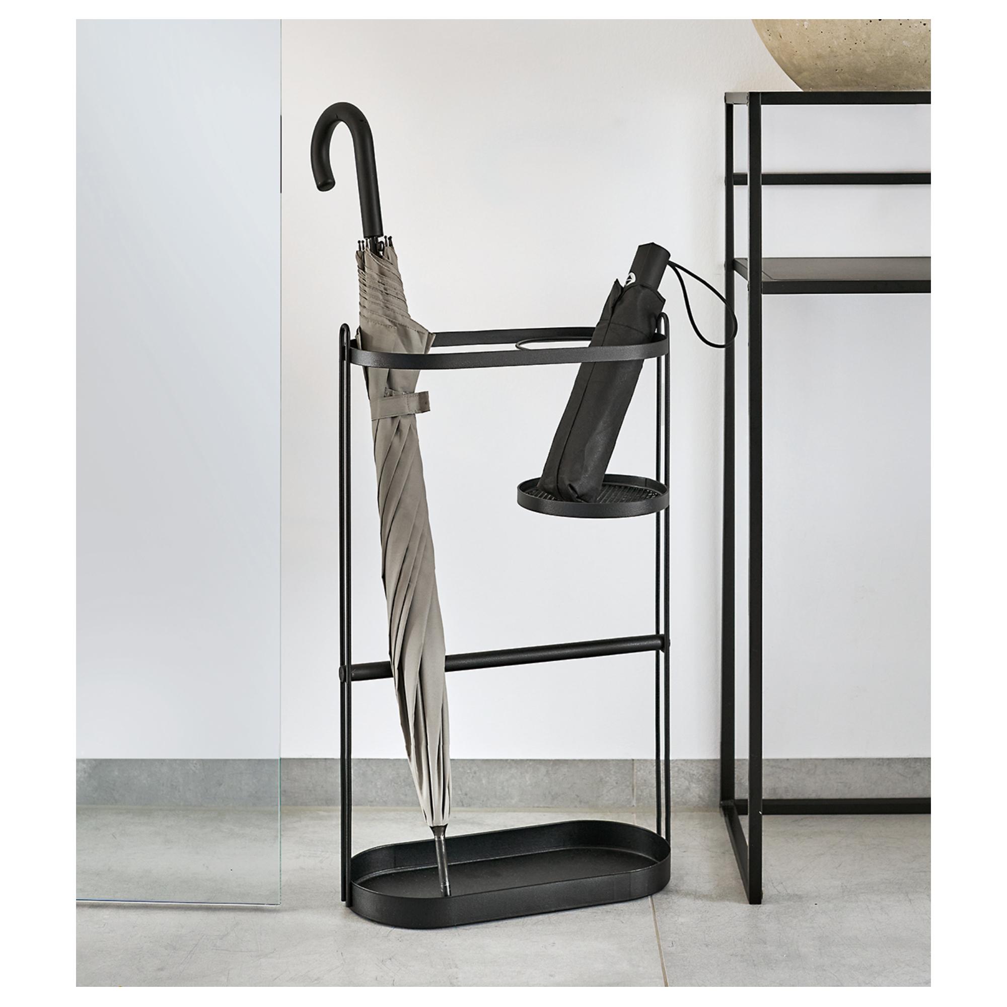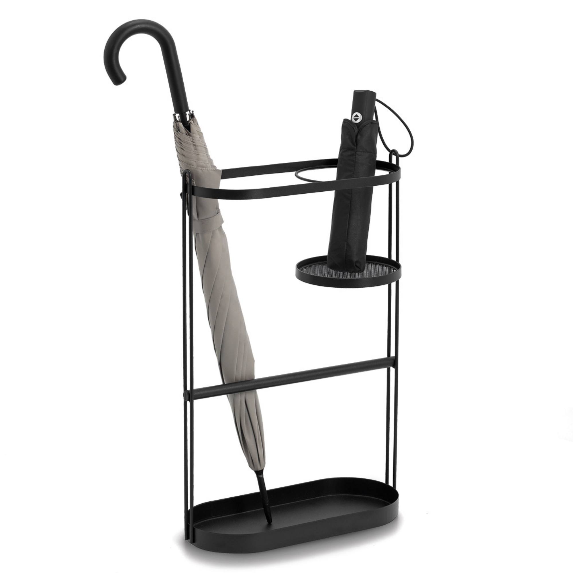 Má kovovú konštrukciu v čiernej farbe v oválnom vyhotovení. Vďaka tomu šetrí miesto a zapadne aj do menších miestností. Disponuje 1 policou, ktorá je určená na malé skladacie dáždniky. Polica je perforovaná, takže voda ľahko odkvapkáva dole do misky. Praktické vyhotovenie poskytuje priestor aj na veľké dáždniky, ktoré stačí vložiť dovnútra a oprieť o konštrukciu. O zachytenie vody z dáždnikov sa postará odkvapkávacia miska, ktorá udrží vašu predsieň v suchu a čistote.