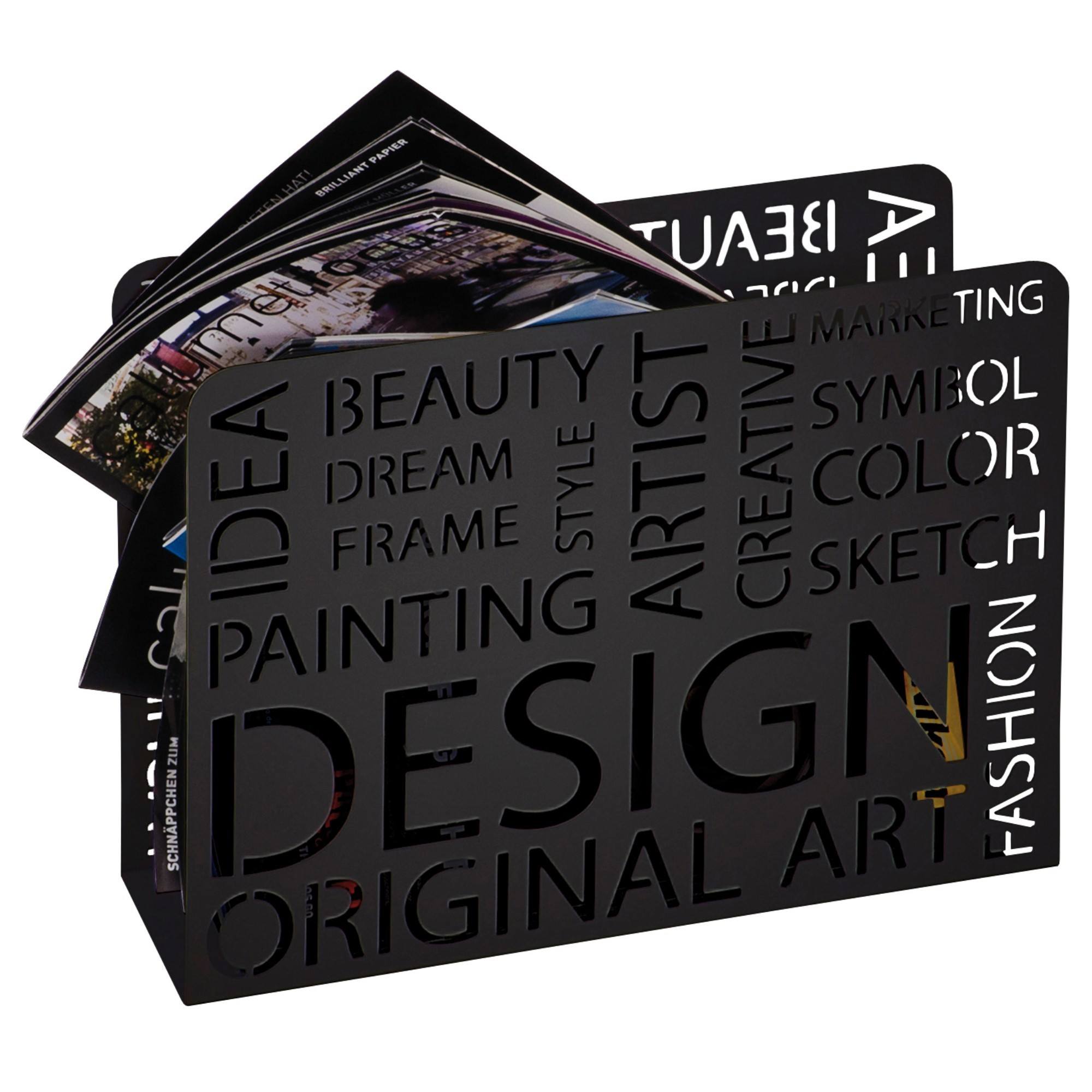 Stojan na noviny POLOS disponuje kovovou konštrukciou, ktorá je ozdobená kreatívnymi nápismi. Vďaka svojmu vyhotoveniu nájde miesto najmä v moderne zariadenom interiéri. Praktický doplnok poslúži ako pomocník na odloženie časopisov a kníh.