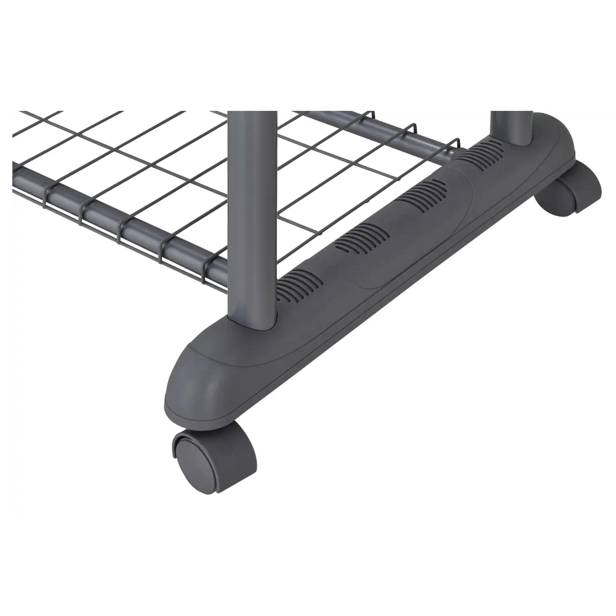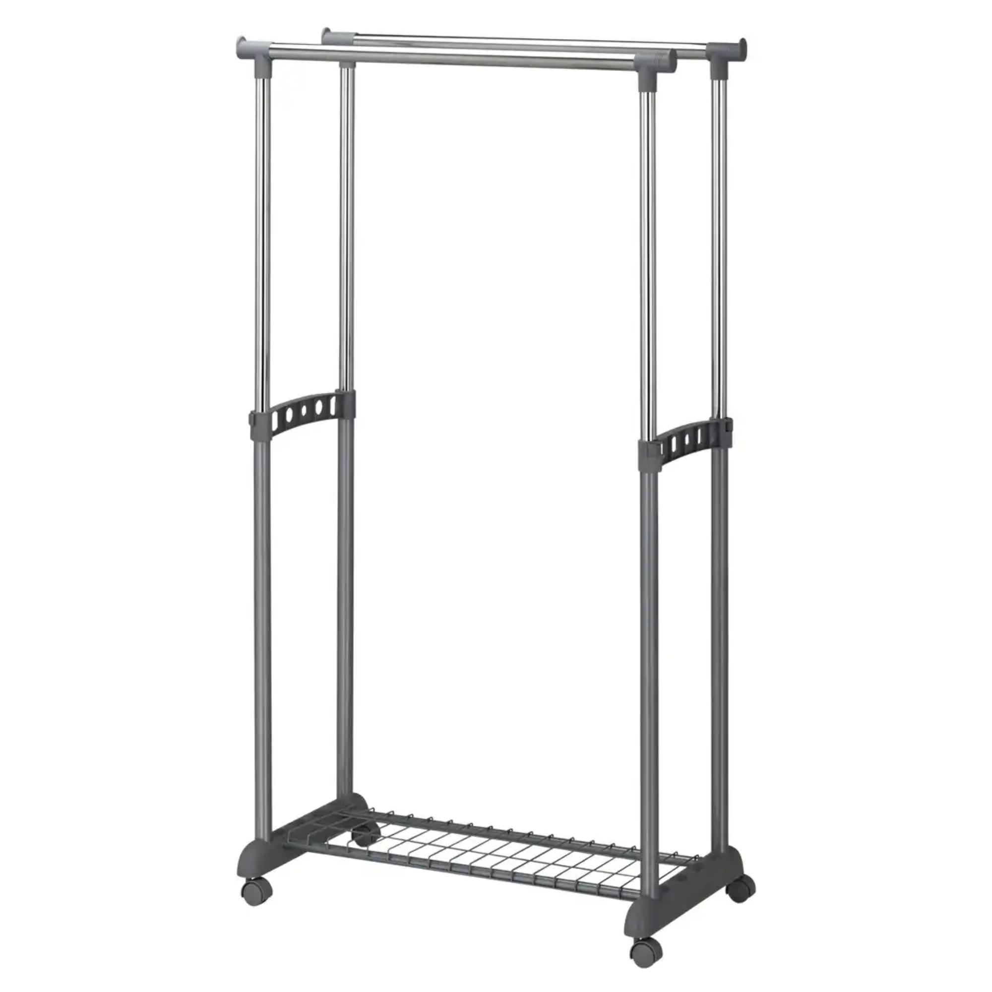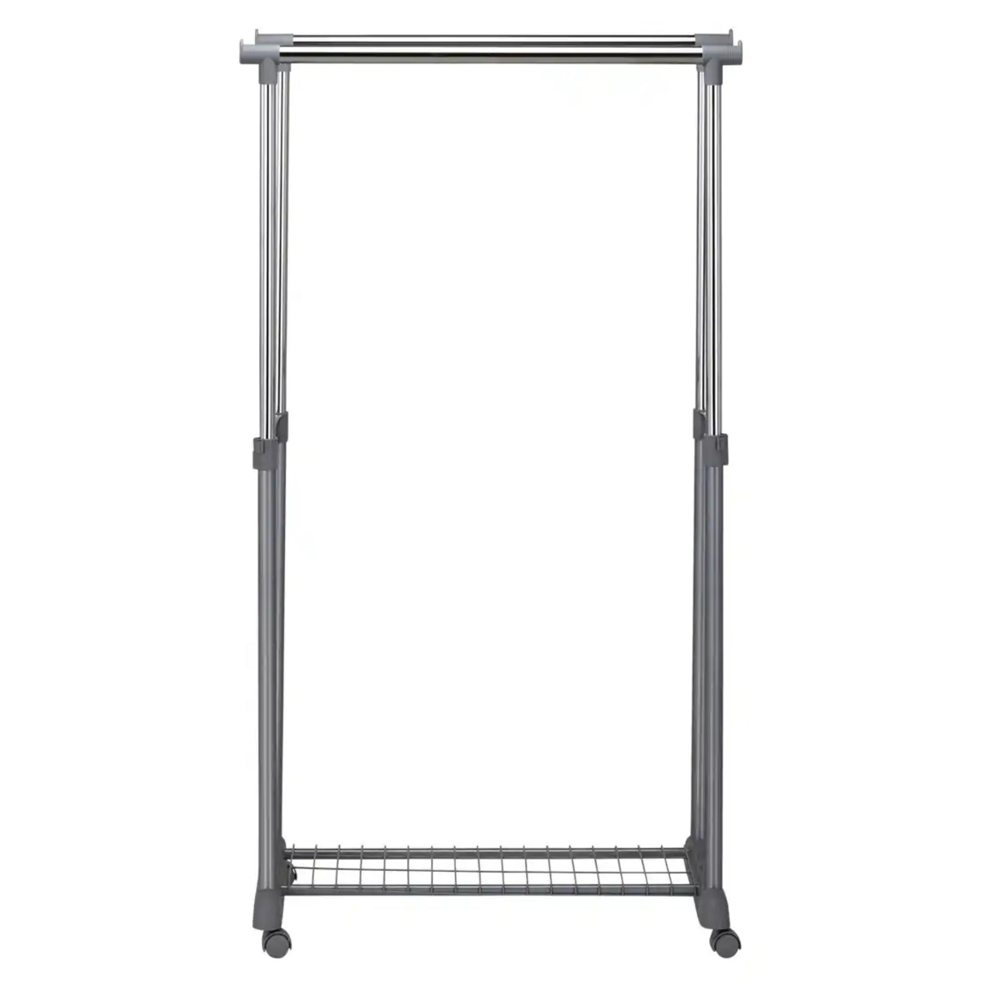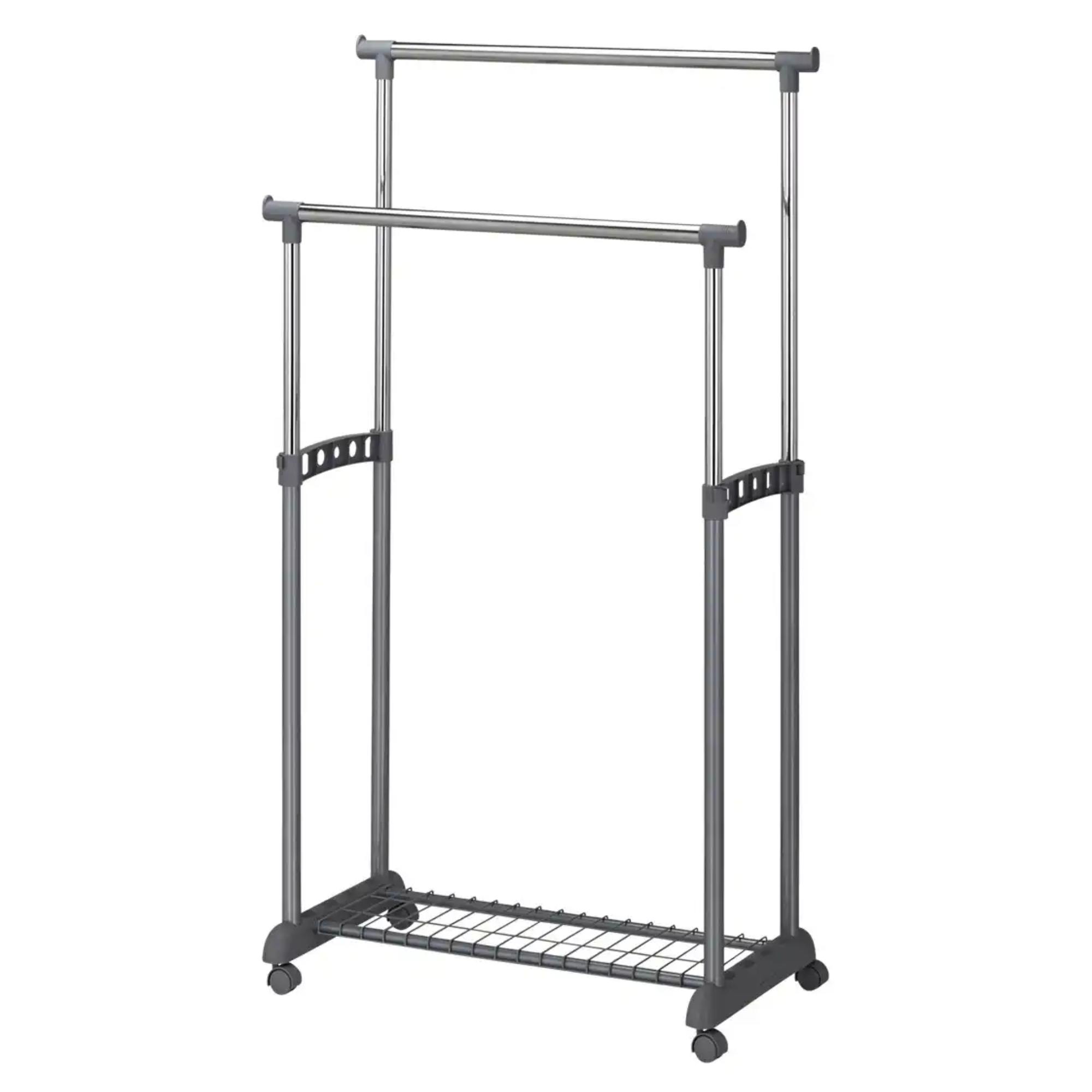 Pevná konštrukcia je vyrobená z pochrómovaného kovu a doplnená o plastové detaily. Stojan je vybavený 2 šatníkovými tyčami ktorých výšku môžete nastaviť v rozmedzí 92-164 cm. Odkladací rošt v spodnej časti je ideálny na uloženie obuvi, kabeliek a ďalších doplnkov. Vďaka praktickým kolieskam stojan ľahko presuniete kamkoľvek bude treba.