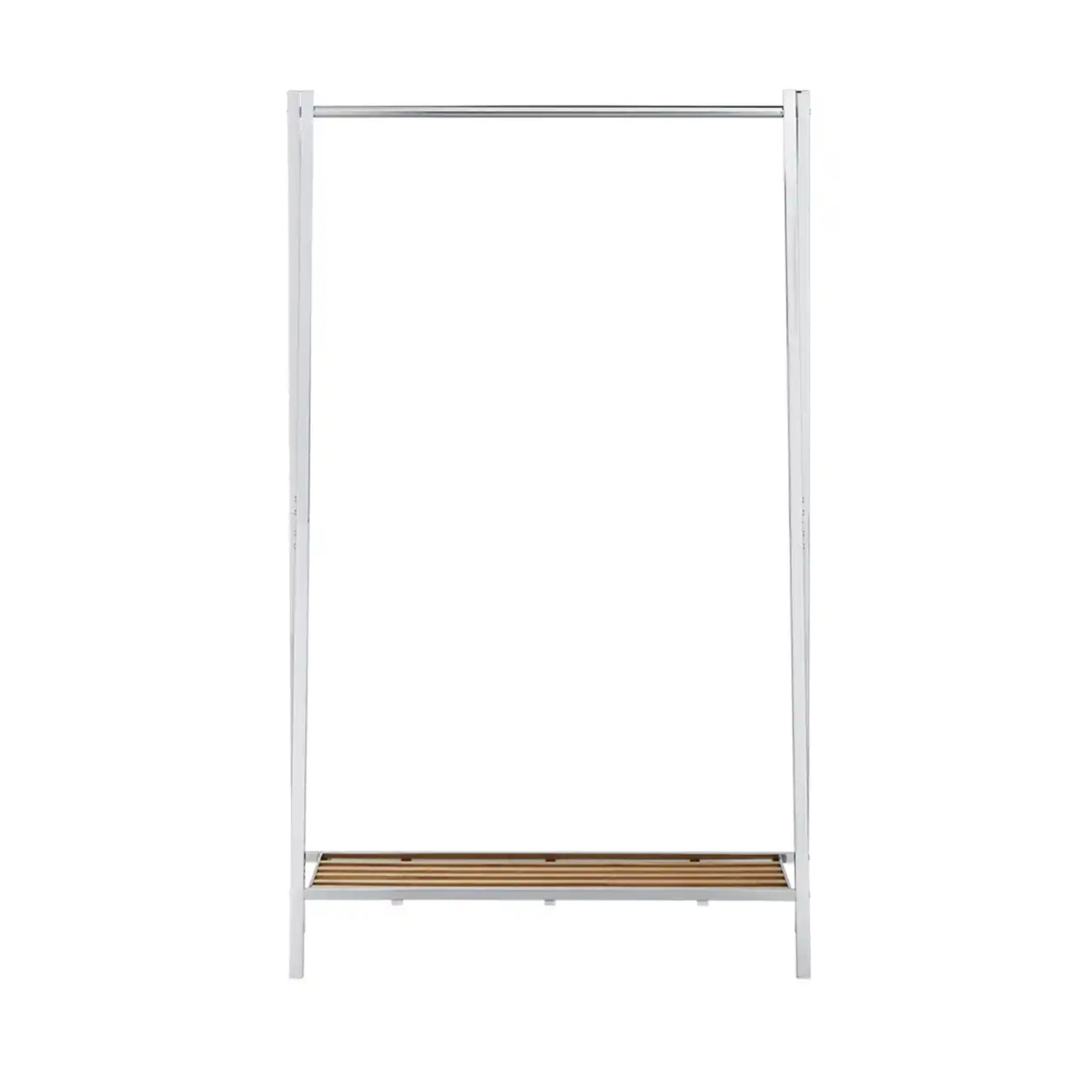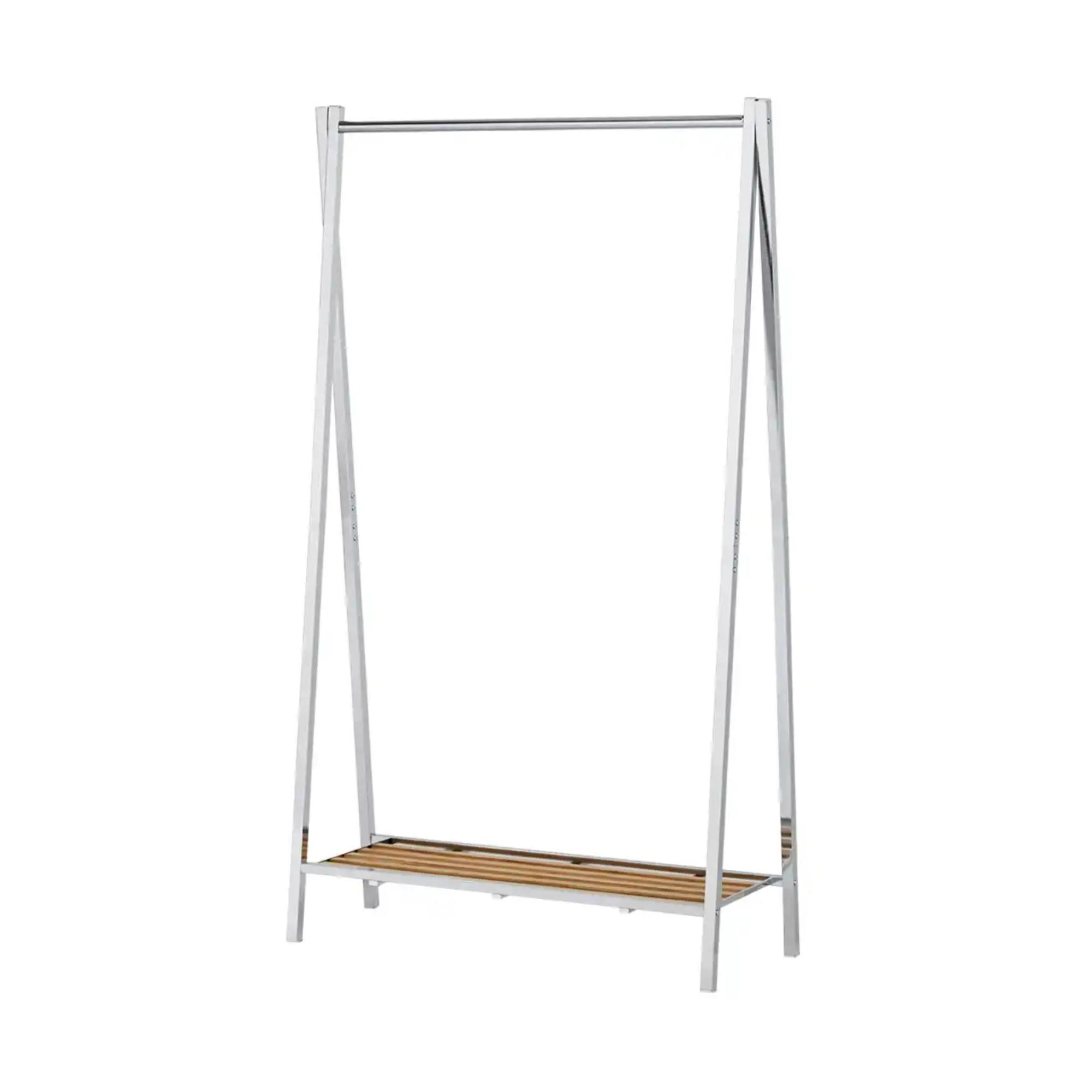 Stojan má kovovú konštrukciu v chrómovej farbe, ktorá zaisťuje dostatočnú stabilitu. Disponuje 1 šatníkovou tyčou s priestorom na zavesenie kabátov, košieľ alebo šiat. Súčasťou stojana je 1 praktická spodná polica na odloženie tašiek, topánok alebo úložných boxov. Polica je vyhotovená z bambusových lamiel, ktoré oživujú jeho dizajn. Bude ideálny do predsiene, šatne či spálne. Vďaka svojmu modernému nadčasovému dizajnu zapadne do mnohých interiérov.
