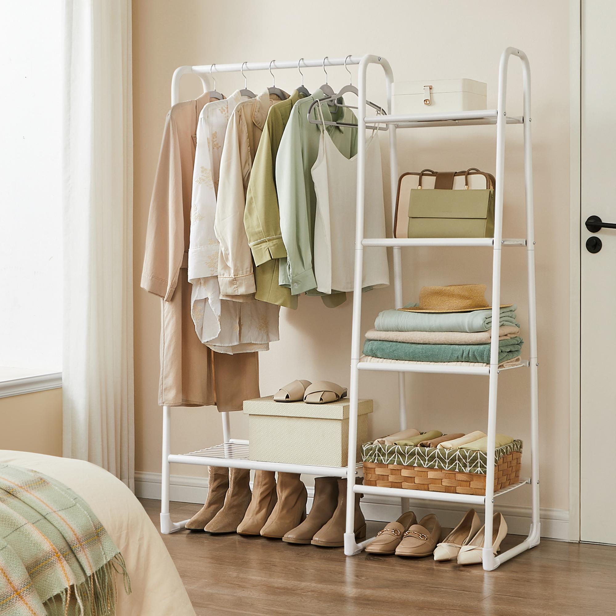 Stojan má jednoduchú kovovú konštrukciu v bielej farbe. Disponuje 1 šatníkovou tyčou s nosnosťou 25 kg, ktorá ponúka priestor na zavesenie kabátov, košieľ alebo šiat. V ľavej spodnej časti stojana sa nachádza praktická odkladacia polica, ideálna na topánky, tašky alebo úložné boxy. V pravej časti sú k dispozícii 4 police na ďalšie odevy či doplnky. Konštrukcia je doplnená praktickými plastovými nadstavcami, ktoré zaisťujú stabilitu. Pre vyššiu bezpečnosť odporúčame pripevniť k stene pomocou sady proti prevráteniu.