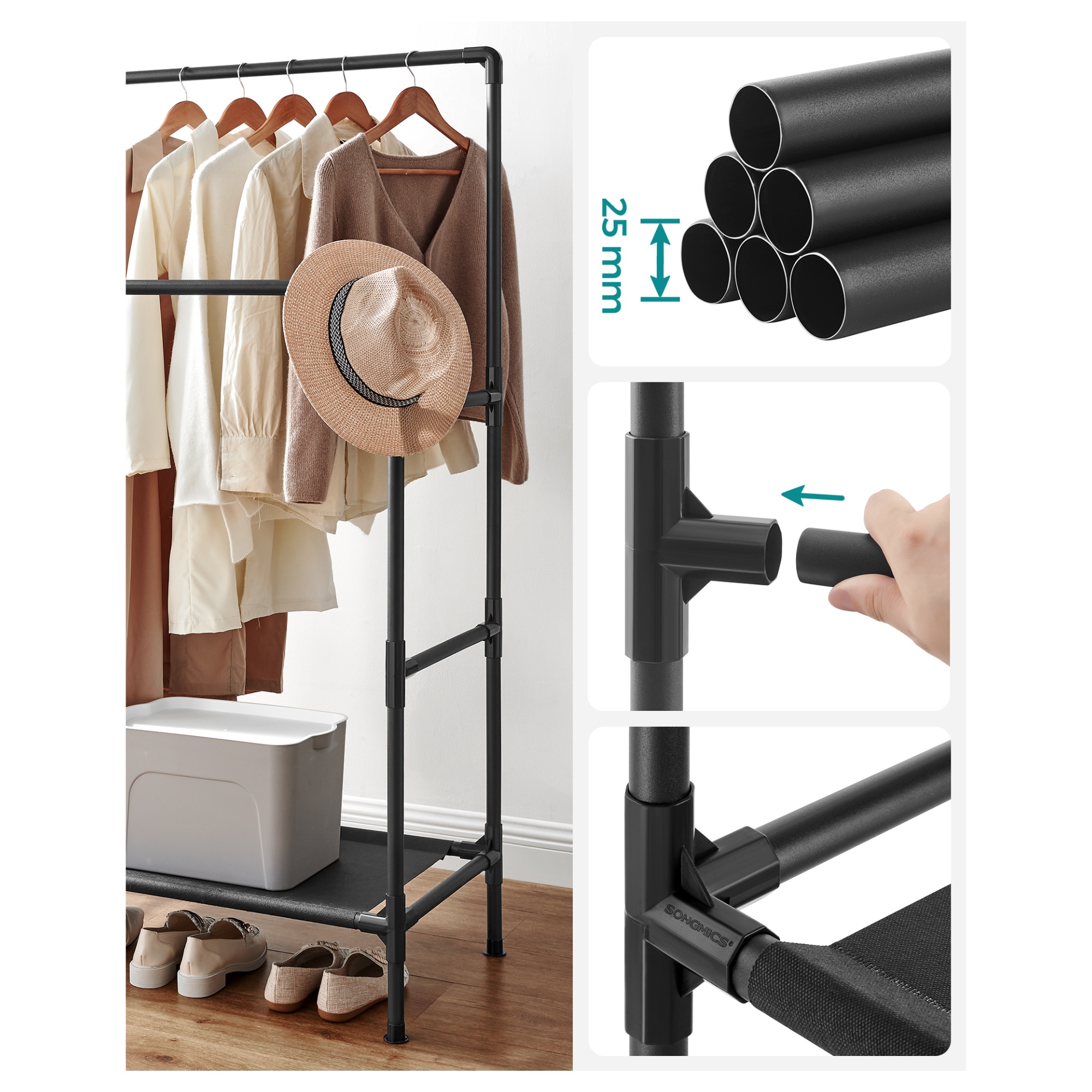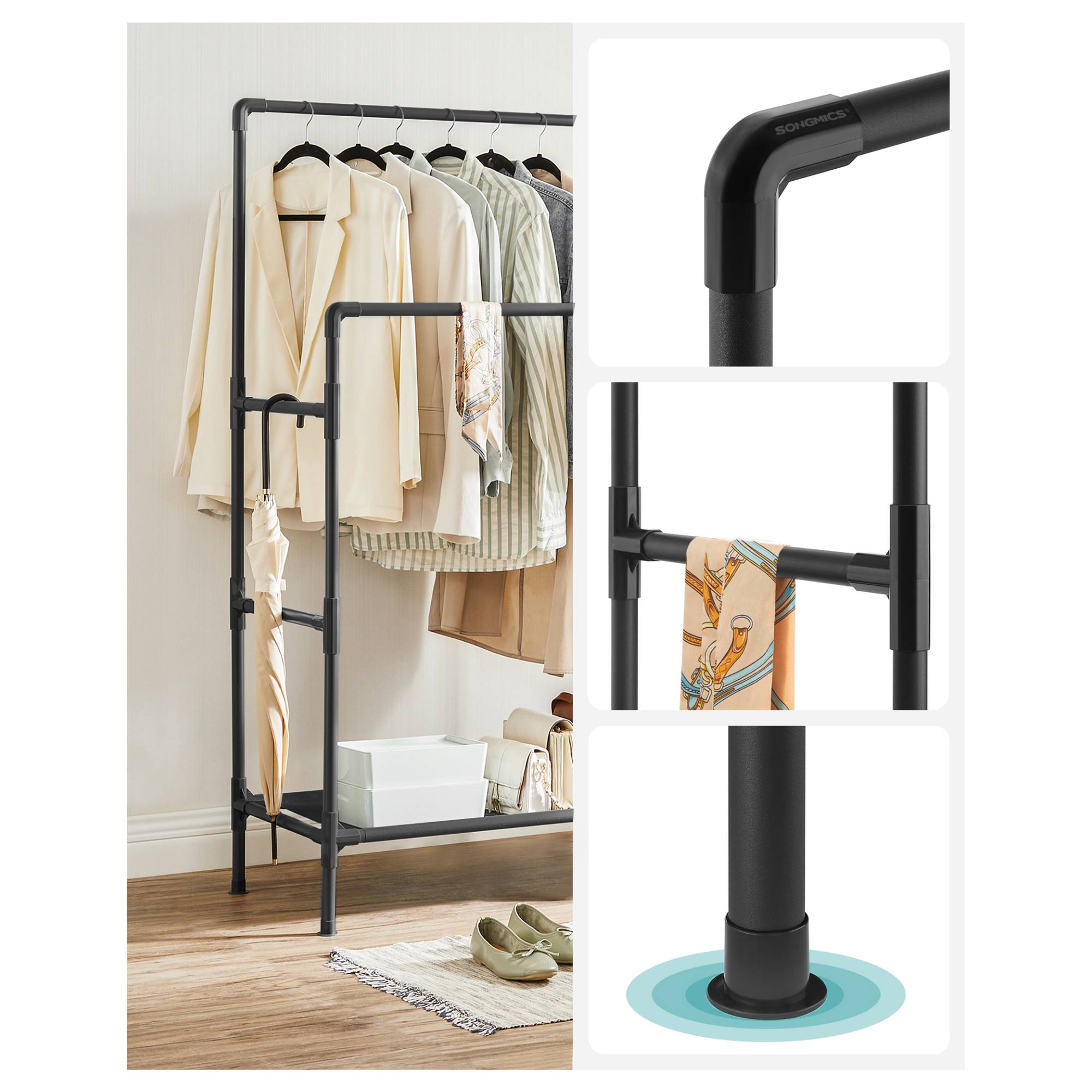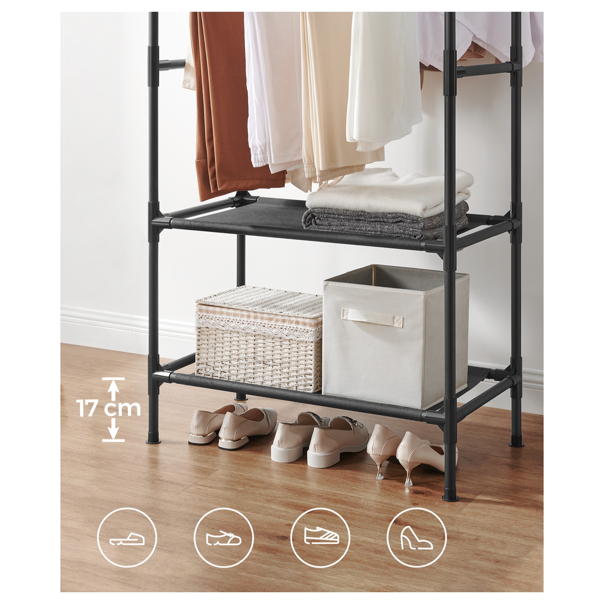 Stojan má jednoduchú kovovú konštrukciu v čiernej farbe s 2 šatníkovými tyčami so šírkou 85 cm. Tyče ponúkajú priestor na zavesenie kabátov, košieľ, šiat a ďalších odevov. V spodnej časti stojana je praktická textilná odkladacia polica na úložné boxy či doplnky. Obuv jednoducho umiestnite pod stojan. Vďaka zasúvaciemu systému zabezpečuje jednoduchú montáž.