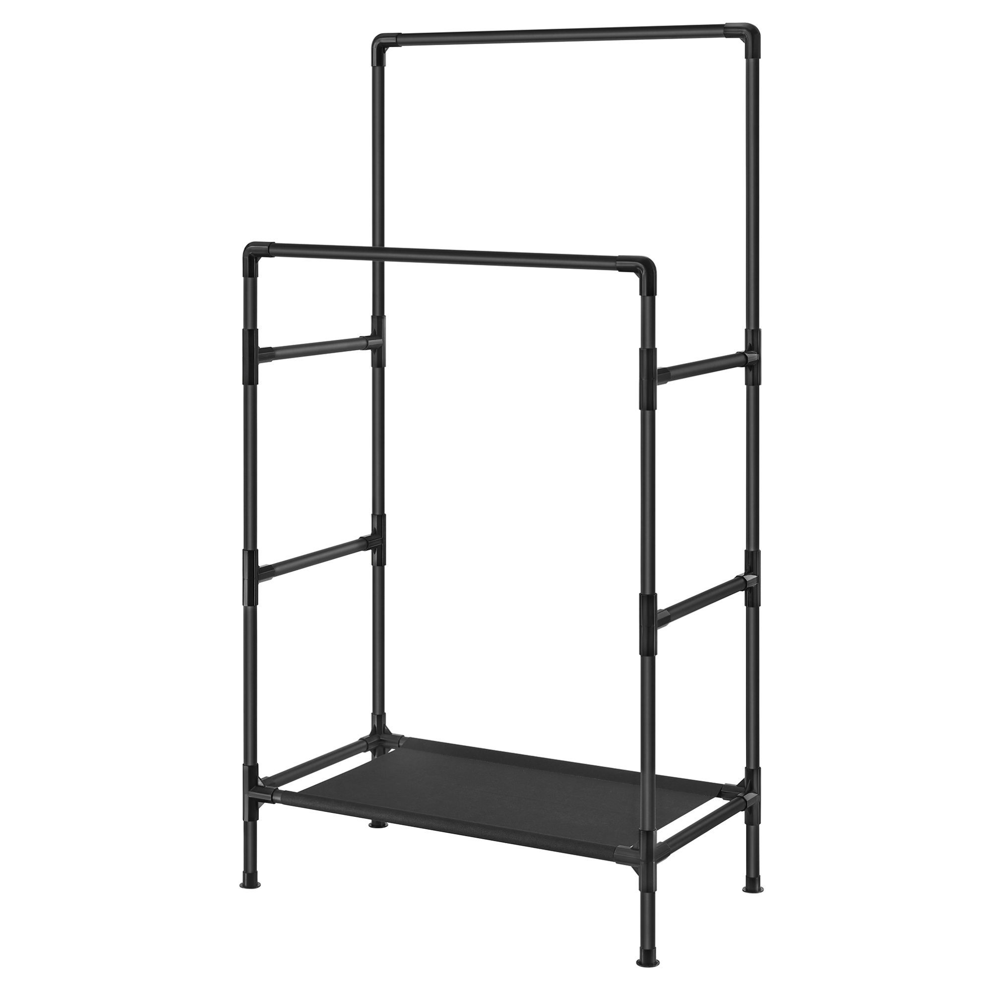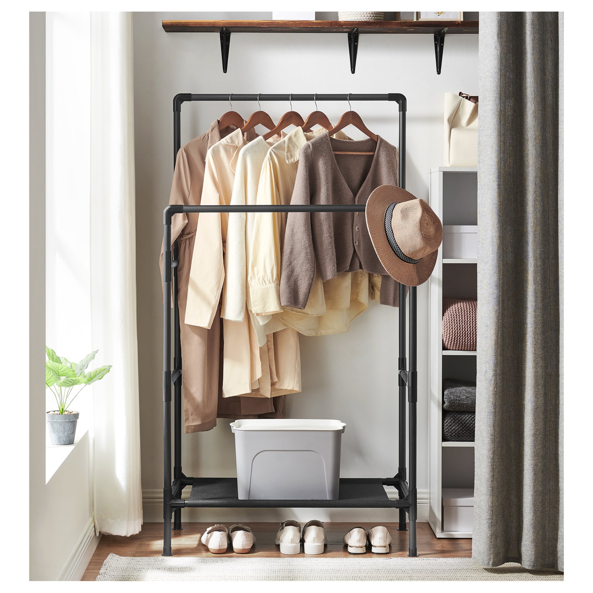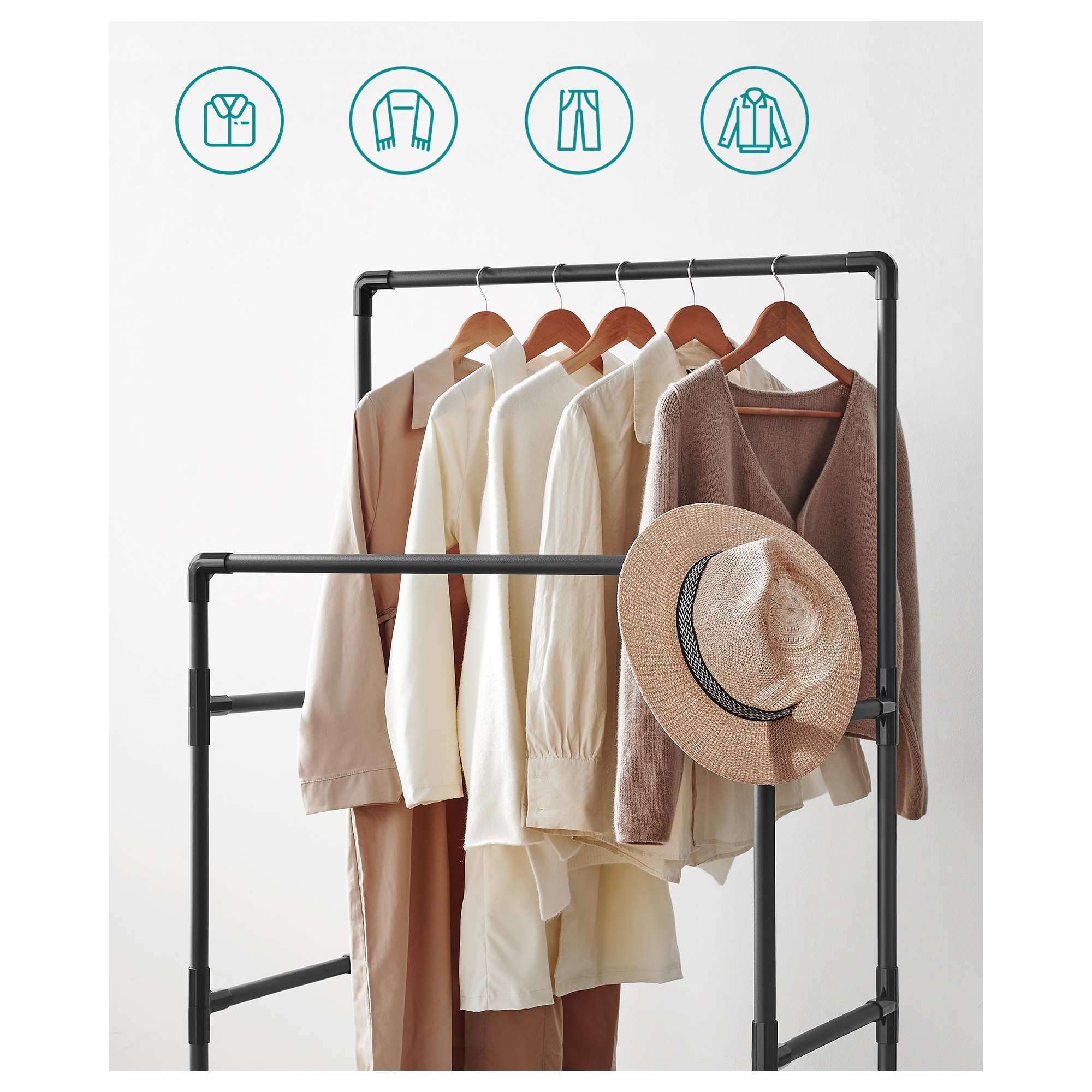 Stojan má jednoduchú kovovú konštrukciu v čiernej farbe s 2 šatníkovými tyčami so šírkou 85 cm. Tyče ponúkajú priestor na zavesenie kabátov, košieľ, šiat a ďalších odevov. V spodnej časti stojana je praktická textilná odkladacia polica na úložné boxy či doplnky. Obuv jednoducho umiestnite pod stojan. Vďaka zasúvaciemu systému zabezpečuje jednoduchú montáž.