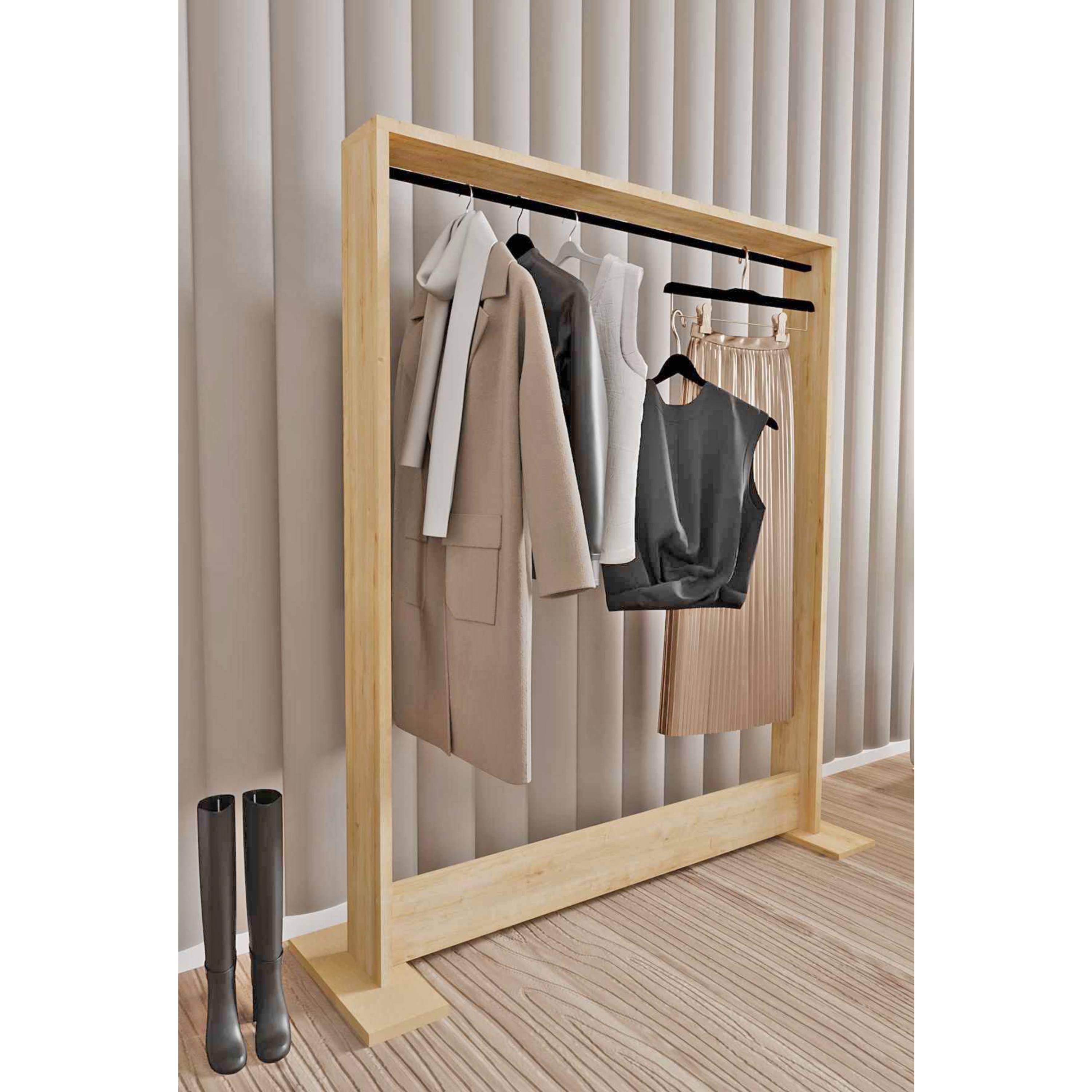 Otvorená konštrukcia s pevnou šatníkovou tyčou umožňuje pohodlné zavesenie kabátov, búnd, šiat aj košieľ, ktoré tak zostanú prehľadne usporiadané a ľahko prístupné. Stabilná základňa zabezpečuje potrebnú stabilitu a bezpečné používanie aj pri plnom zaťažení. Stojan je vyrobený z laminovaného dreveného materiálu s povrchom nenáročným na údržbu.