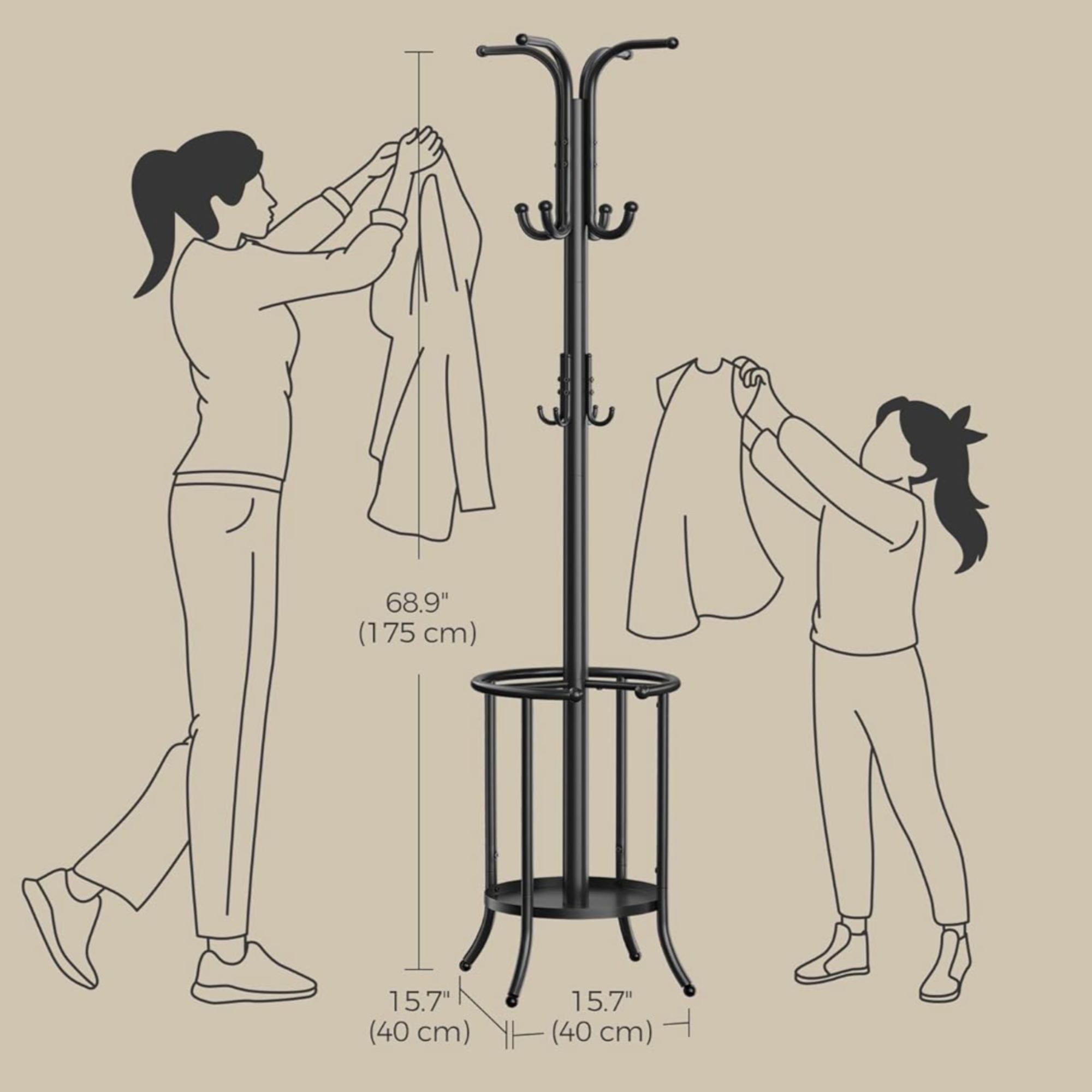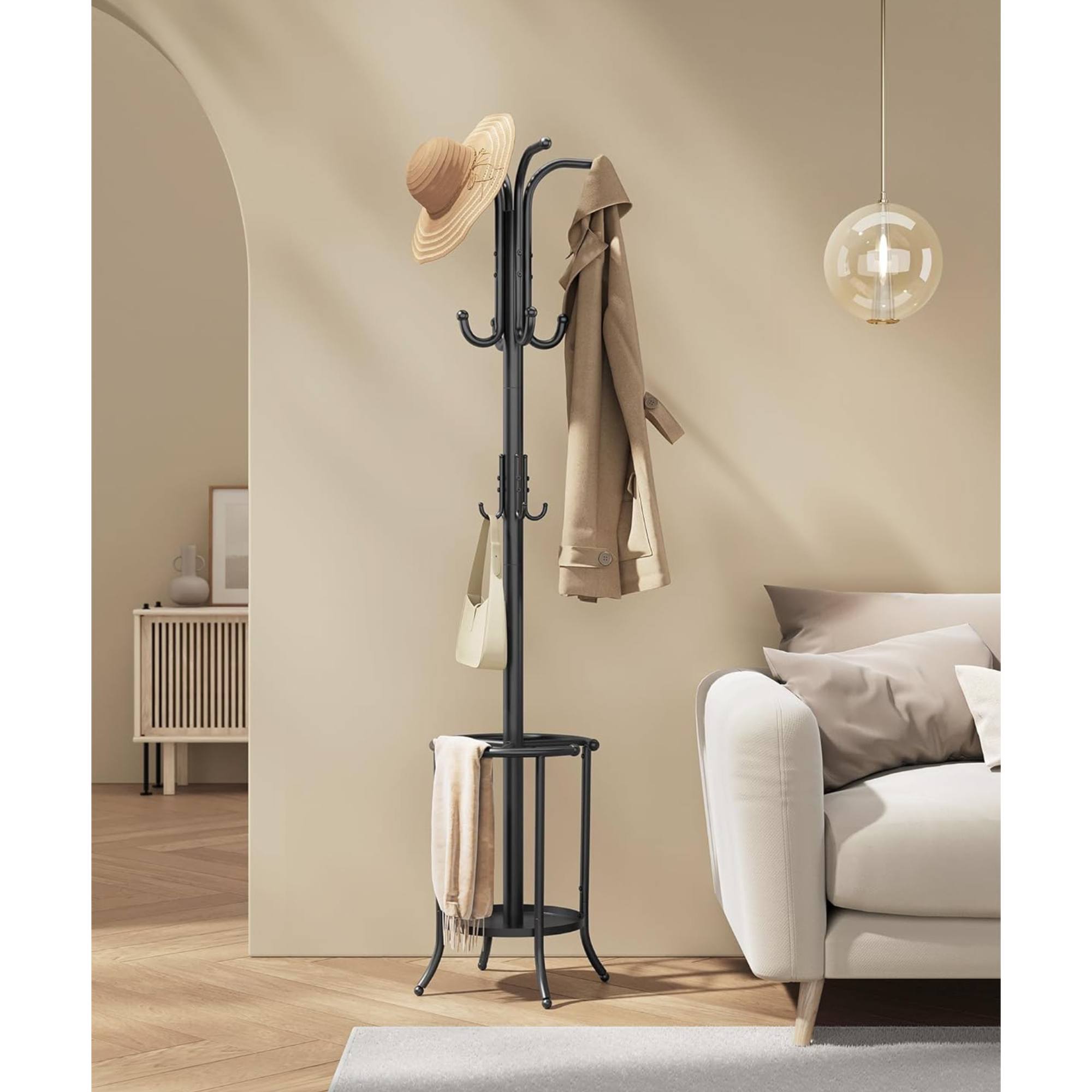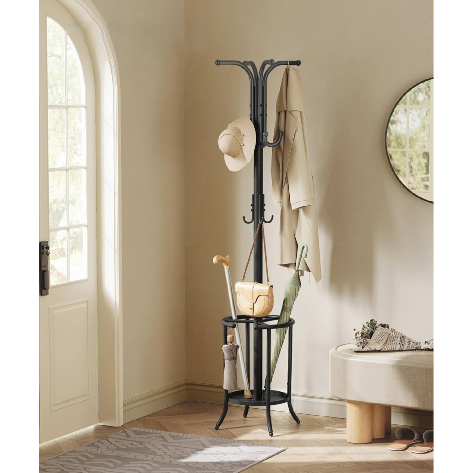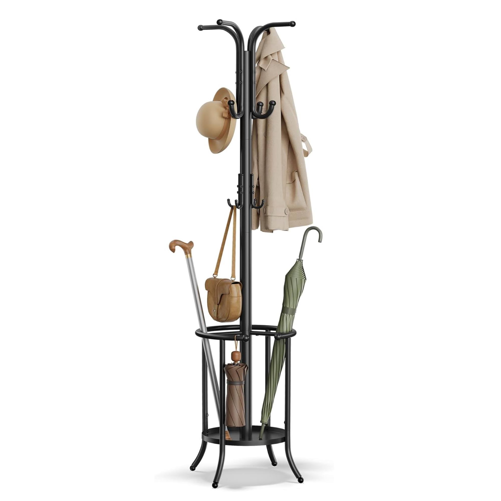 Pretože je vešiak ľahký, jednoducho ho presuniete kamkoľvek, kde ho práve budete potrebovať. Súčasťou stojana je odkladacie miesto na dáždniky aj 12 háčikov, a tak poskytuje dostatok priestoru na odloženie všetkého vášho oblečenia, pokrývok hlavy, kabeliek aj iných doplnkov.