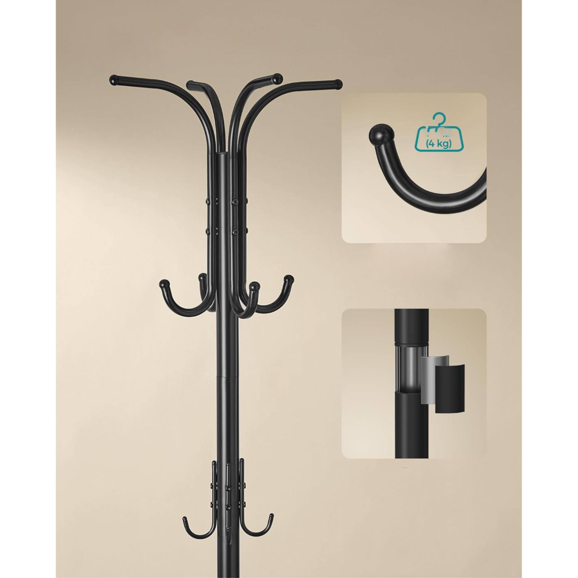 Maximálna nosnosť každého háčika je 4 kg. Celková maximálna nosnosť stojana je 15 kg.