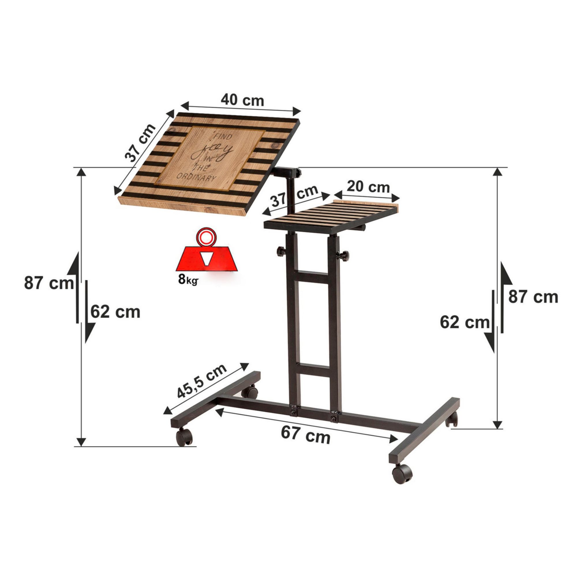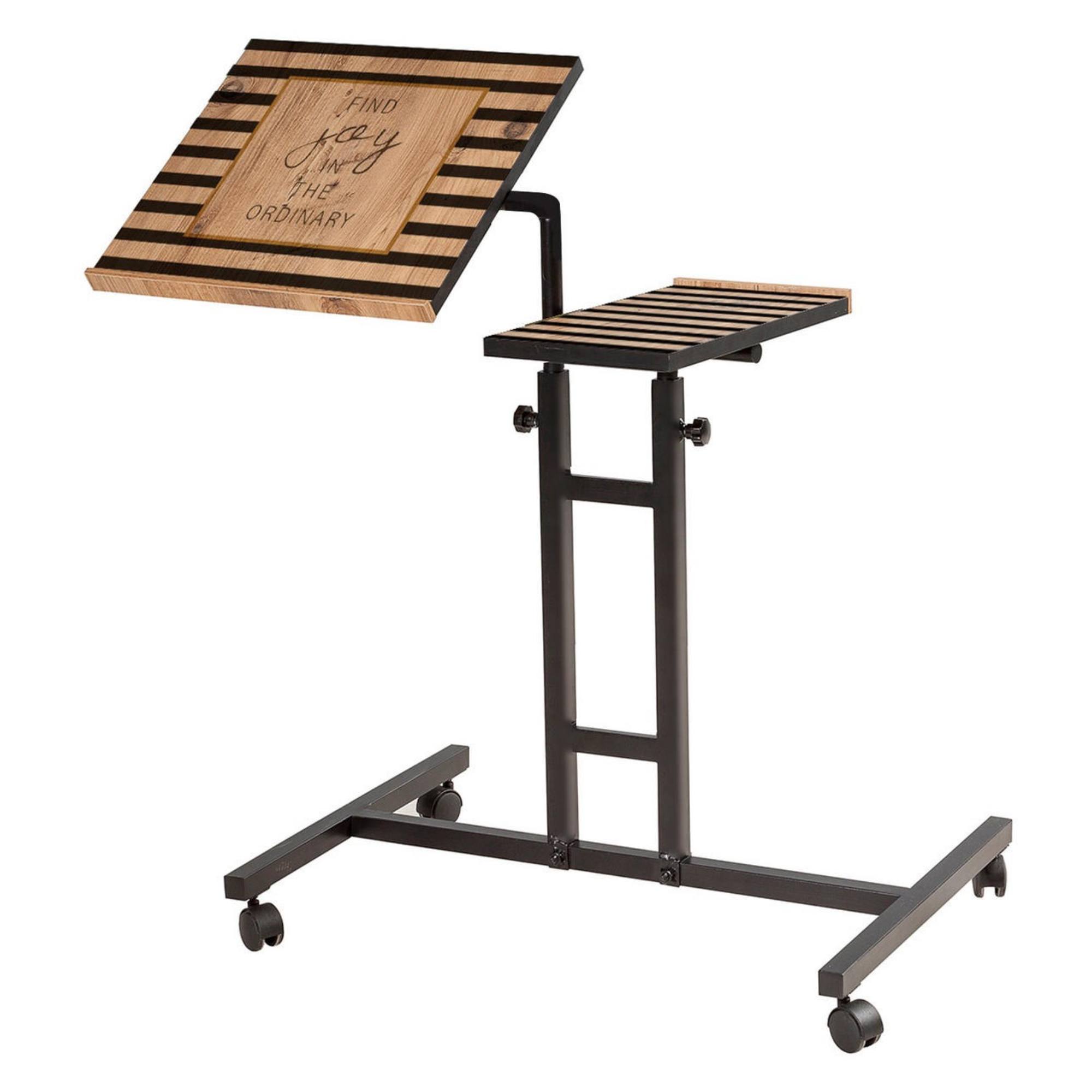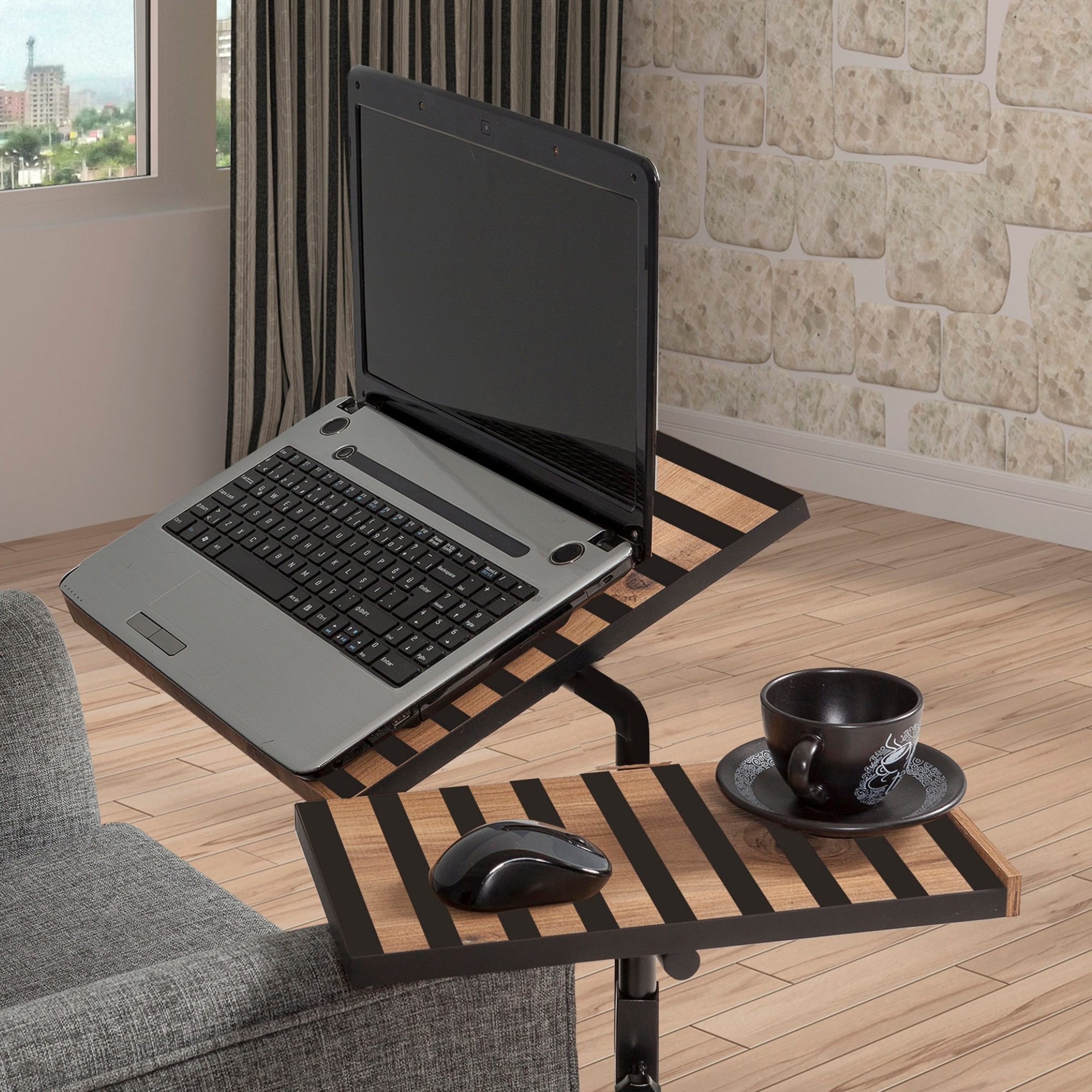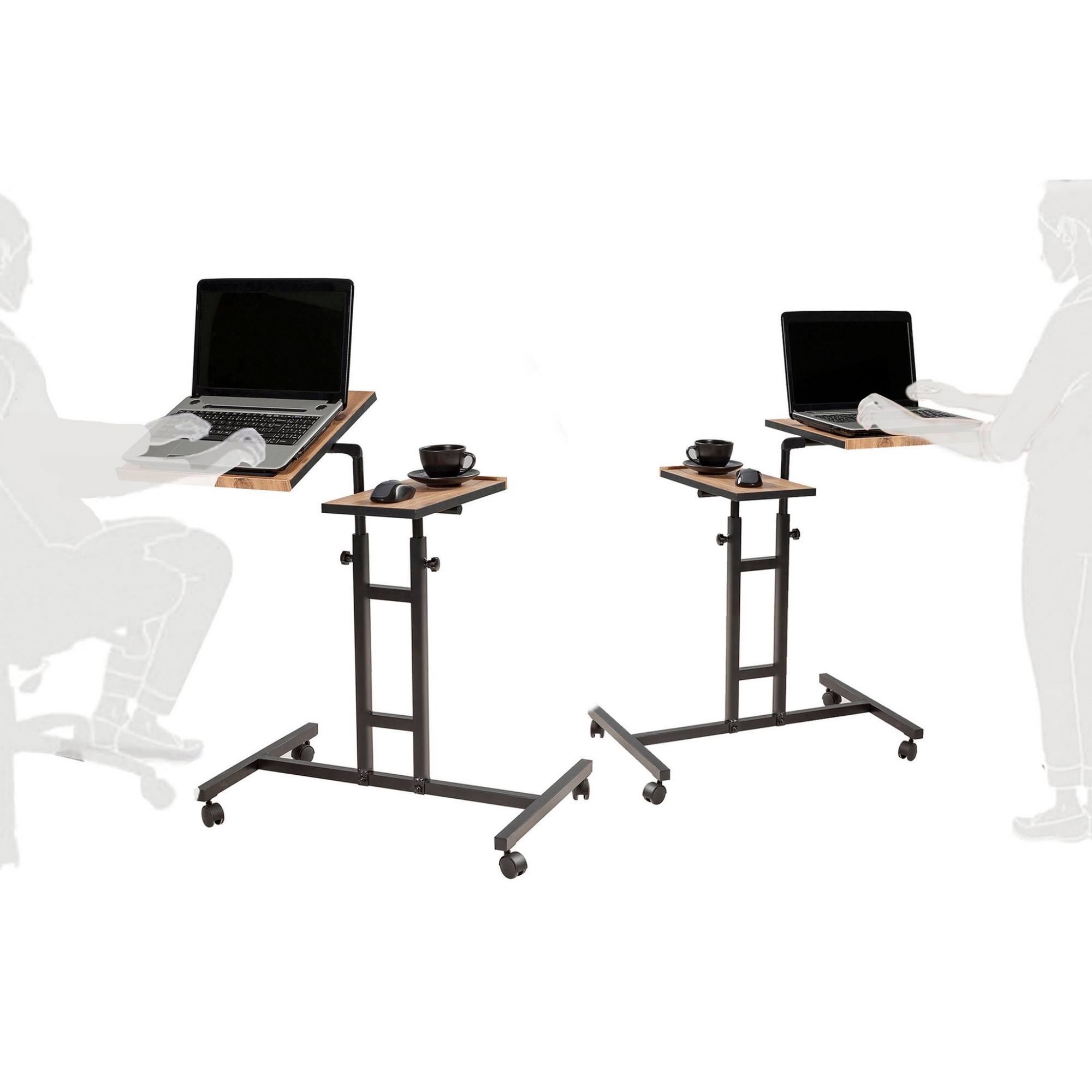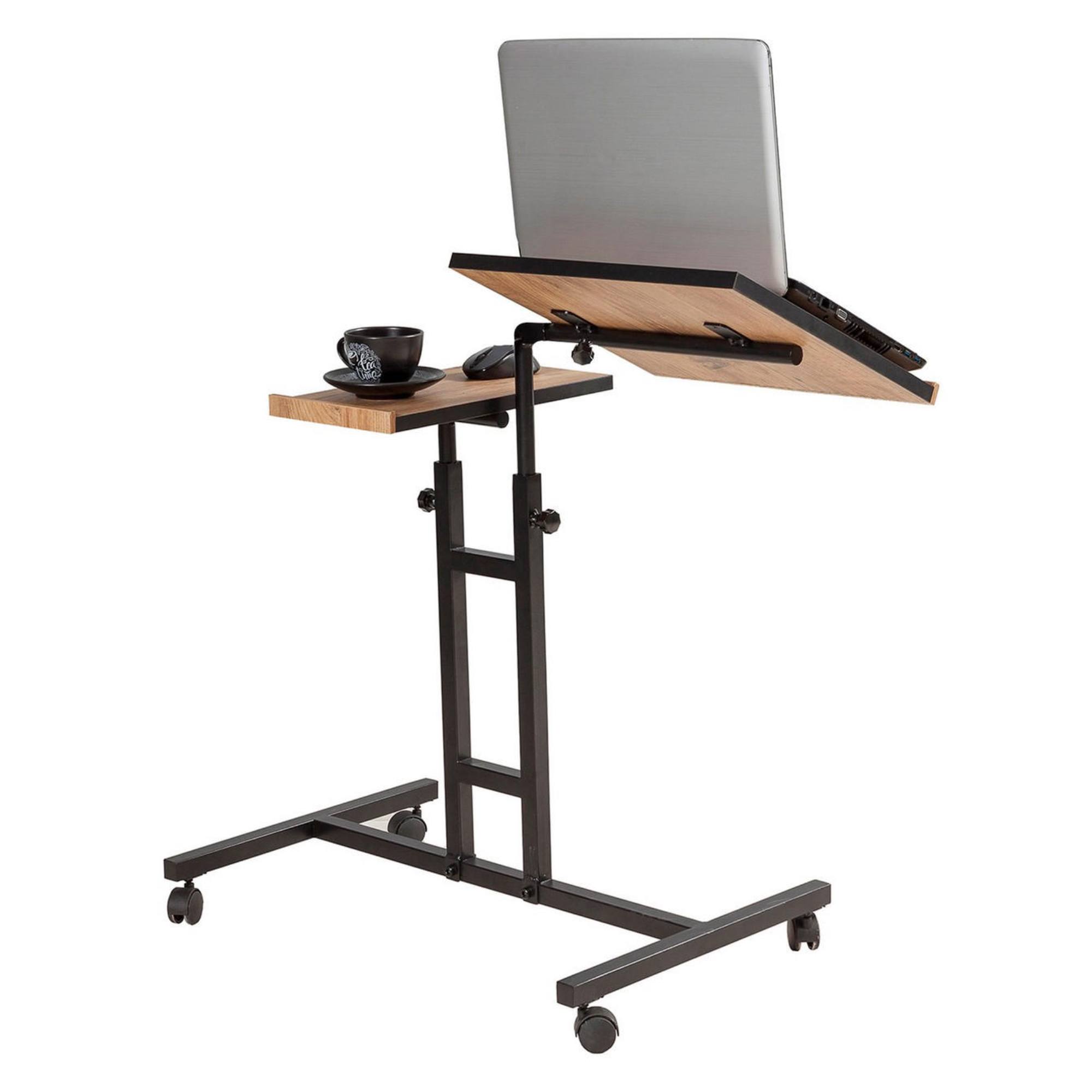 Jeho odkladacia plocha je rozdelená na dve funkčné časti. Hlavnú plochu stolíka je možné naklápať, vďaka čomu bude práca s laptopom hračka. Druhá plocha je vodorovná a pevná, a tak je ideálna na prácu s myšou a odloženie občerstvenia. Obe plochy sú výškovo nastaviteľné v rozmedzí od 62 do 87 cm. Celkovú premyslenosť a funkčnosť stola zvýrazňujú praktické kolieska.
