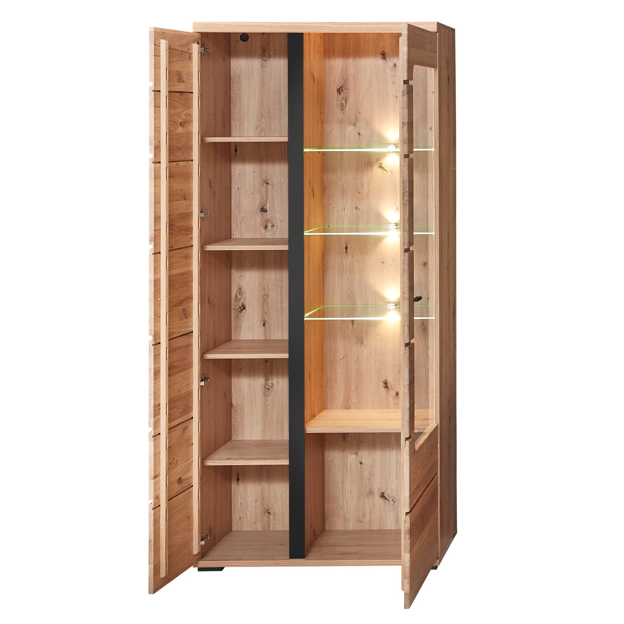 Za jej 2 dverami, z ktorých jedny sú čiastočne presklené, sa nachádza 8 vložených políc. 3 police sú vyrobené zo skla. Nechýba ani LED osvetlenie, ktoré umožní vystaveným predmetom vyniknúť naplno.