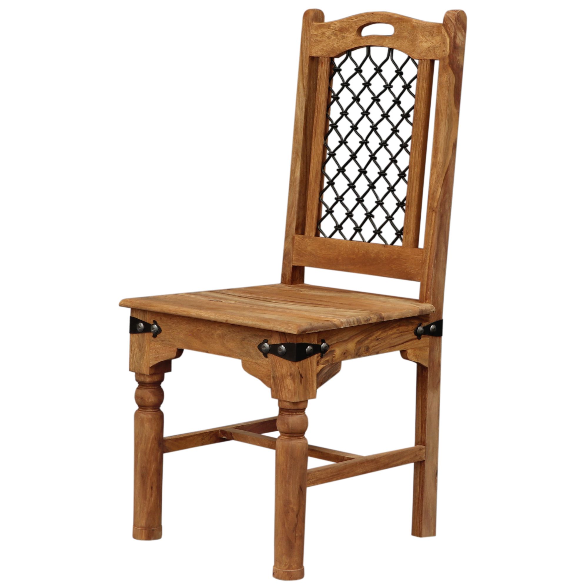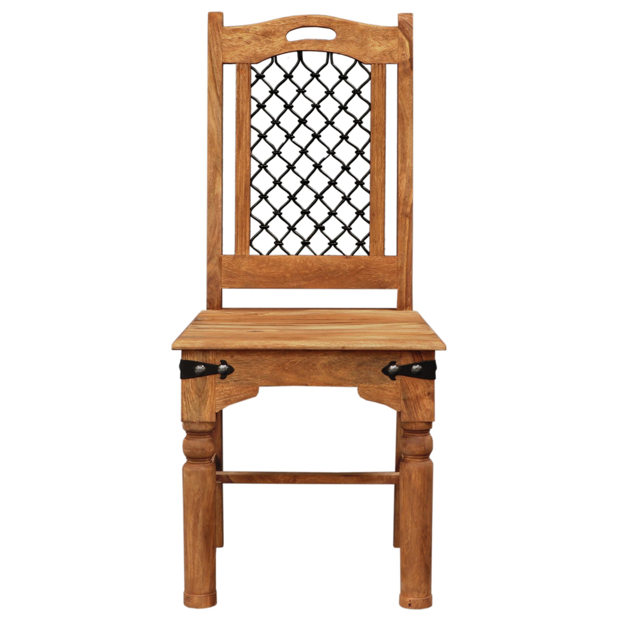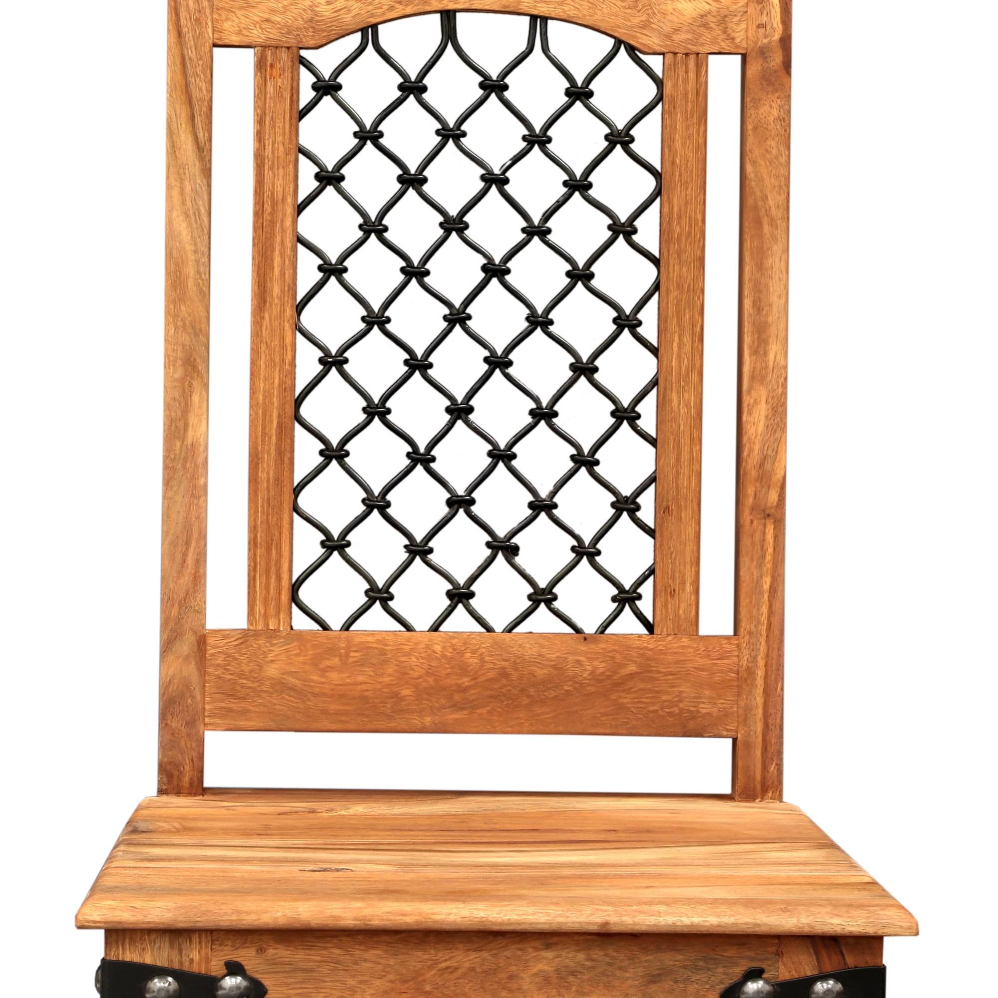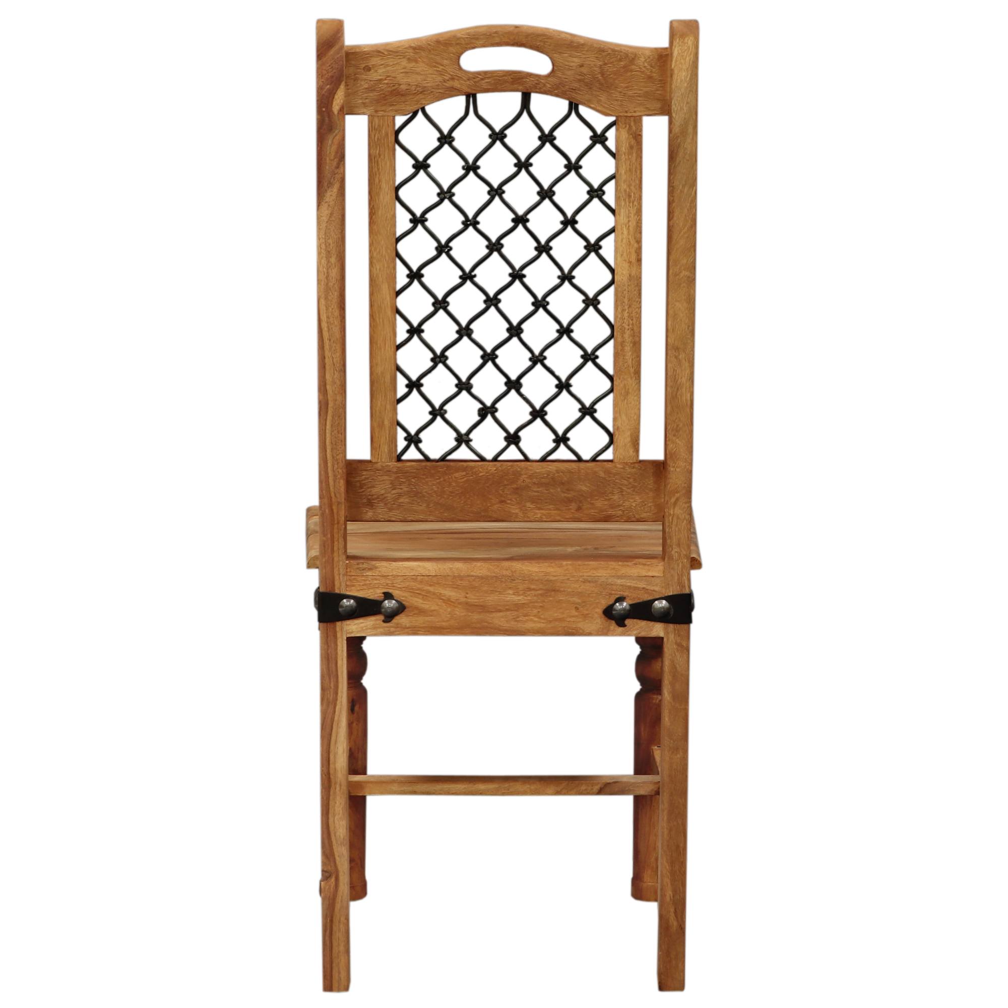 Chrbtová opierka je obohatená o dekoratívny kovový výplet, ktorý prináša jedinečný štýl a zaujímavý kontrast k drevenému rámu. Stolička je navyše vybavená praktickým výrezom v hornej časti, ktorý uľahčuje manipuláciu. Pod sedákom nájdete elegantné ozdobné kovové prvky, ktoré zvýrazňujú rustikálny charakter stoličky, čím z nej robia nielen praktický, ale aj dizajnový kúsok.