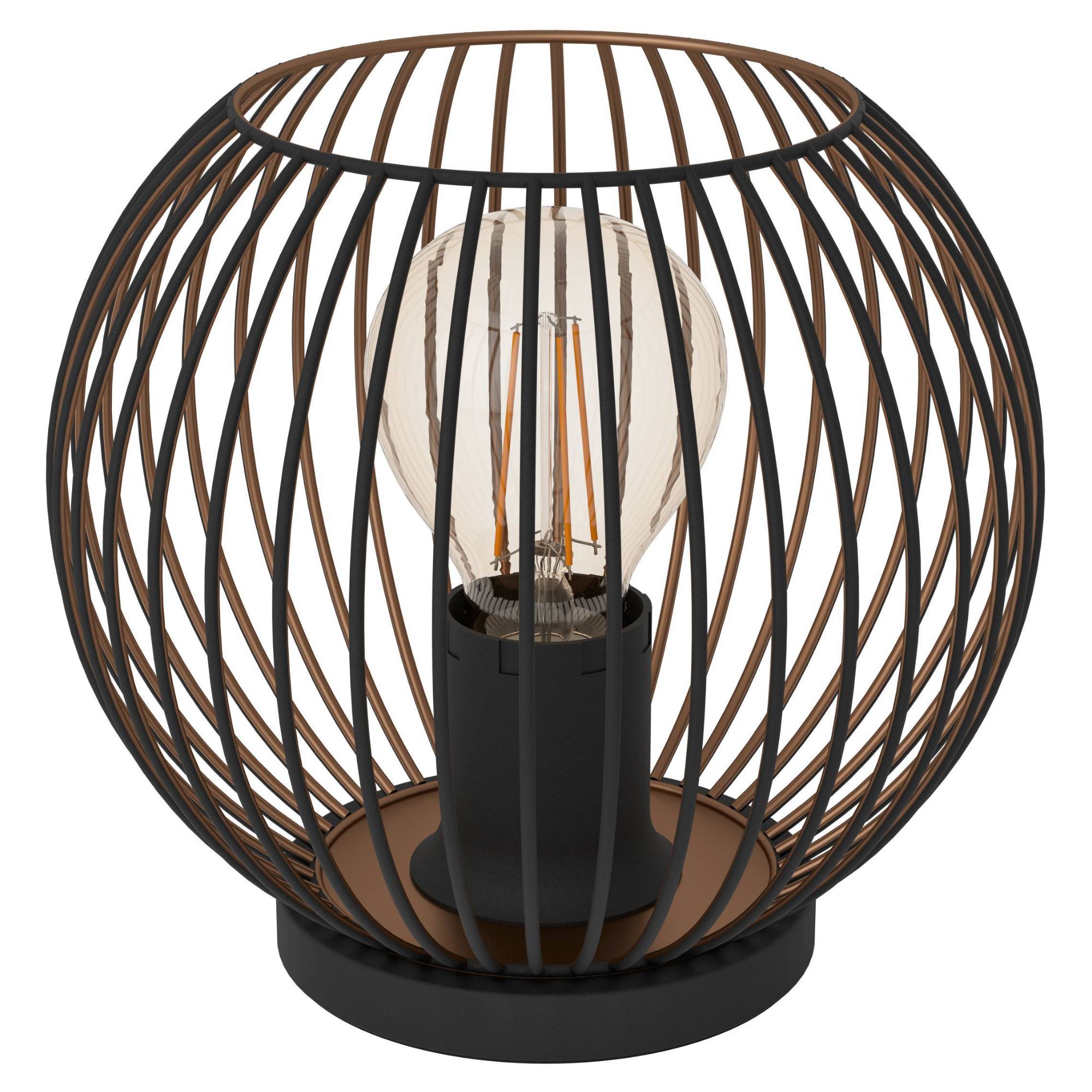 Zaujme svojím kovovým tienidlom v kombinácii čiernej a medenej farby. Tienidlo vďaka svojmu otvorenému prevedeniu s mriežkami vytvorí na stole svetelný efekt, ktorý dodá miestnosti útulnú atmosféru.