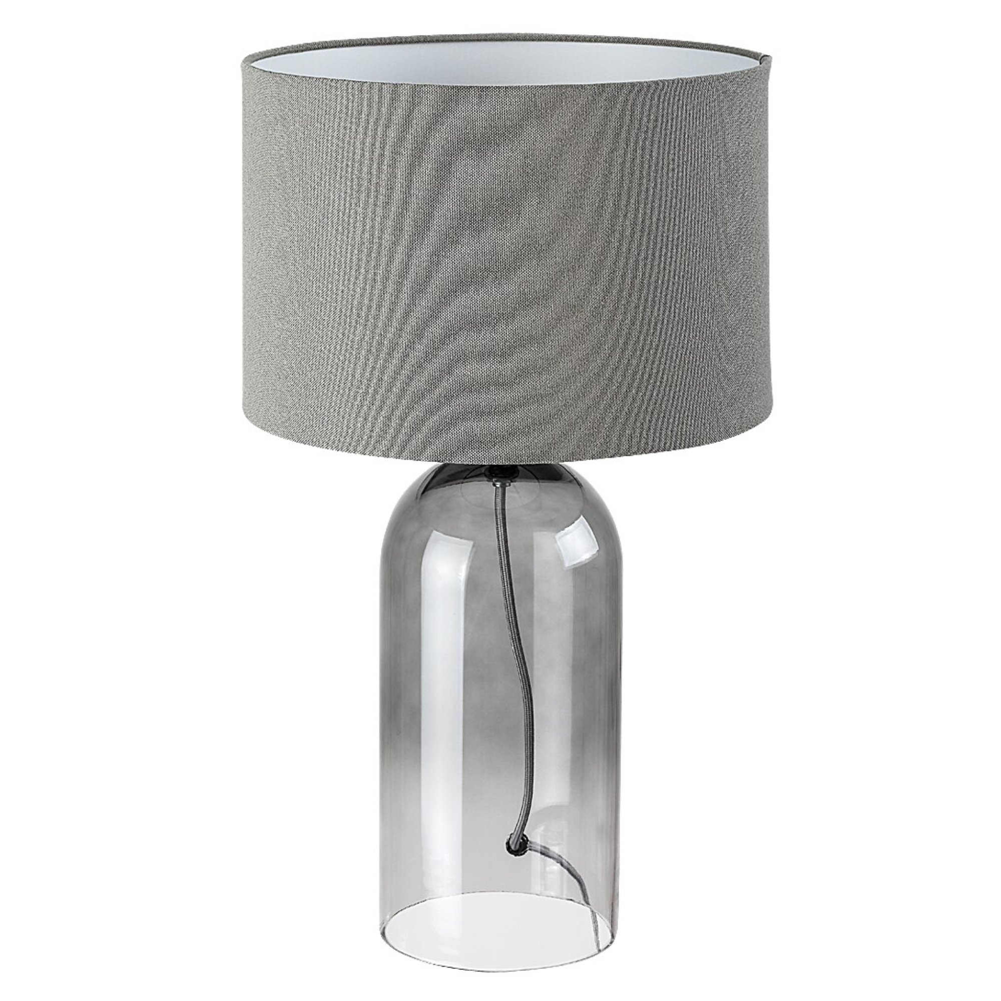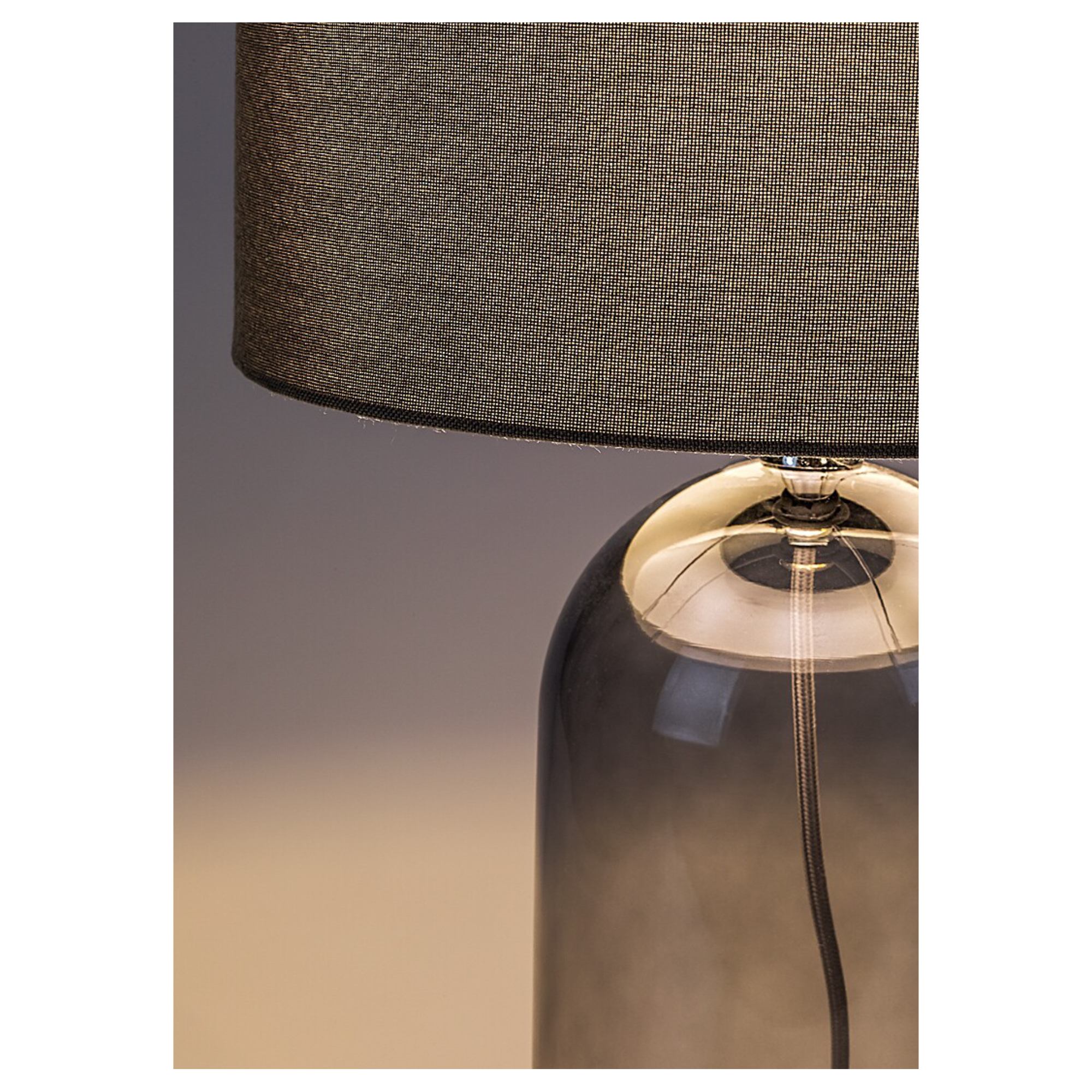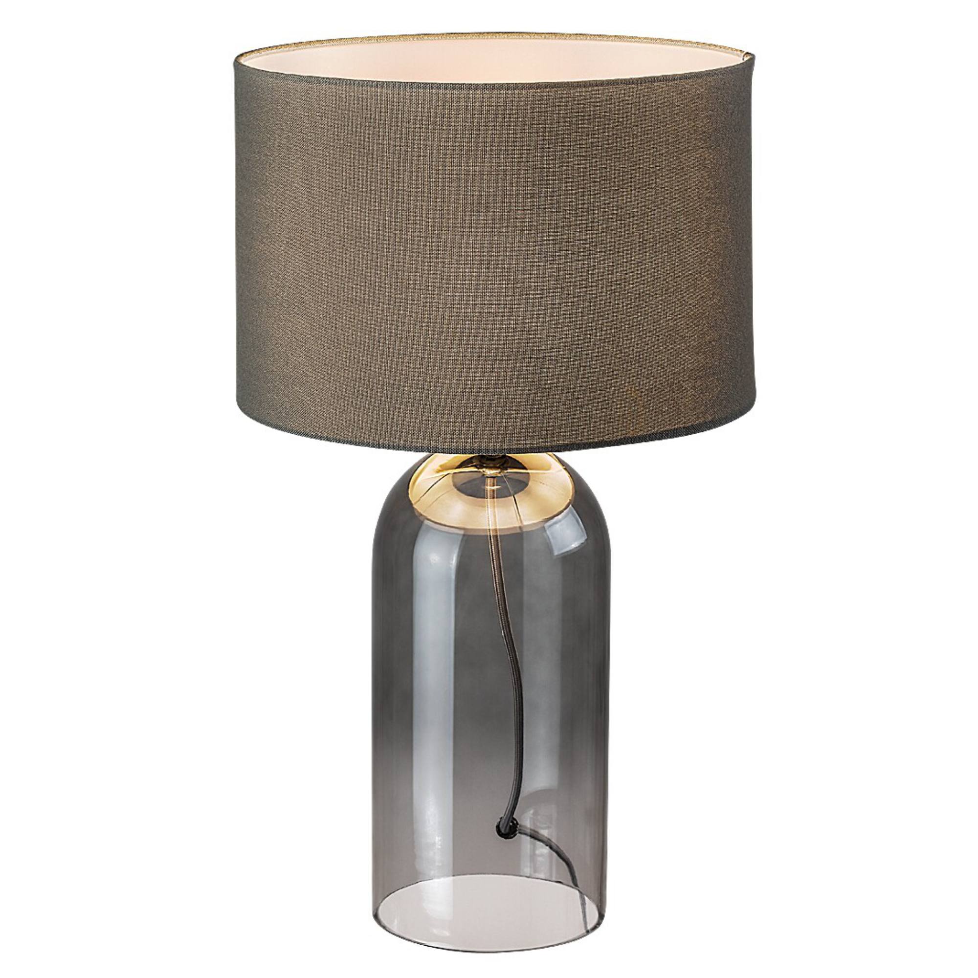 Telo lampy je vyrobené zo skla s dymovým efektom, ktorý jej dodáva jemný retro nádych a originálny vzhľad. Klasické textilné tienidlo v sivej farbe je nepostrádateľným doplnkom, ktorý rovnomerne rozloží svetlo a dodá príjemnú atmosféru do miestnosti. Vďaka jednoduchému, elegantnému dizajnu sa bude vynímať v rade interiérov. Skvele poslúži v obývacej izbe či spálni. Je doplnená vypínačom na kábli s dĺžkou 140 cm.