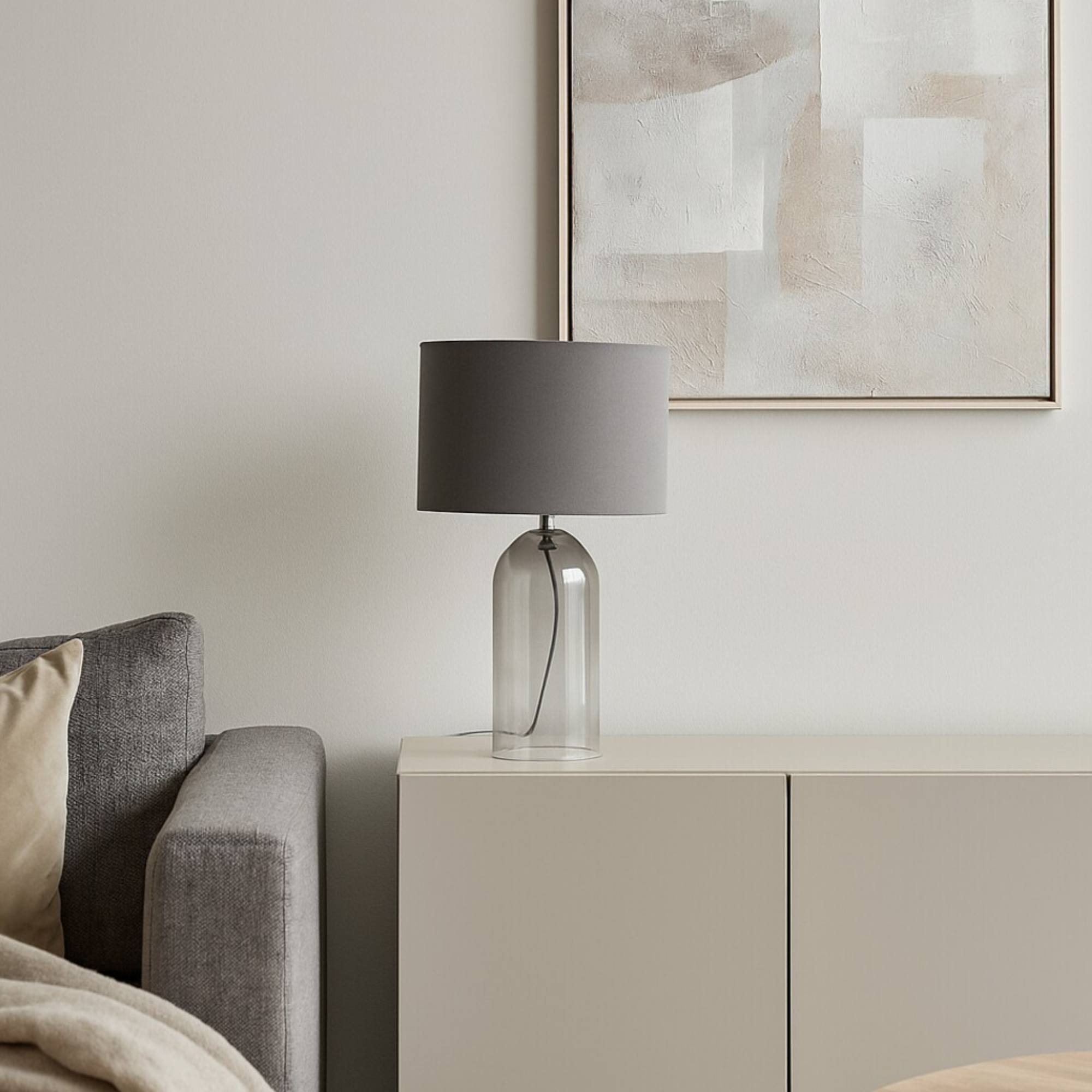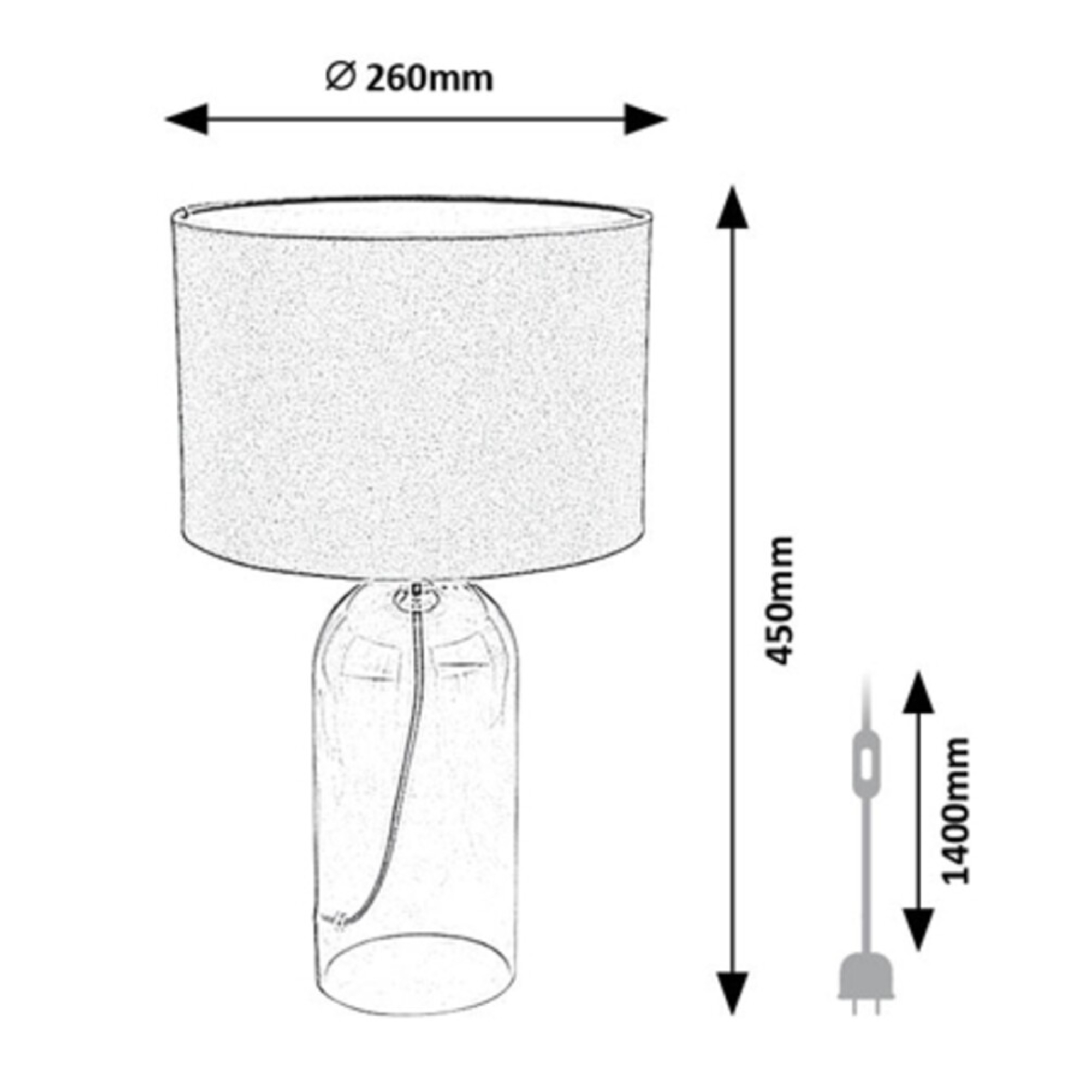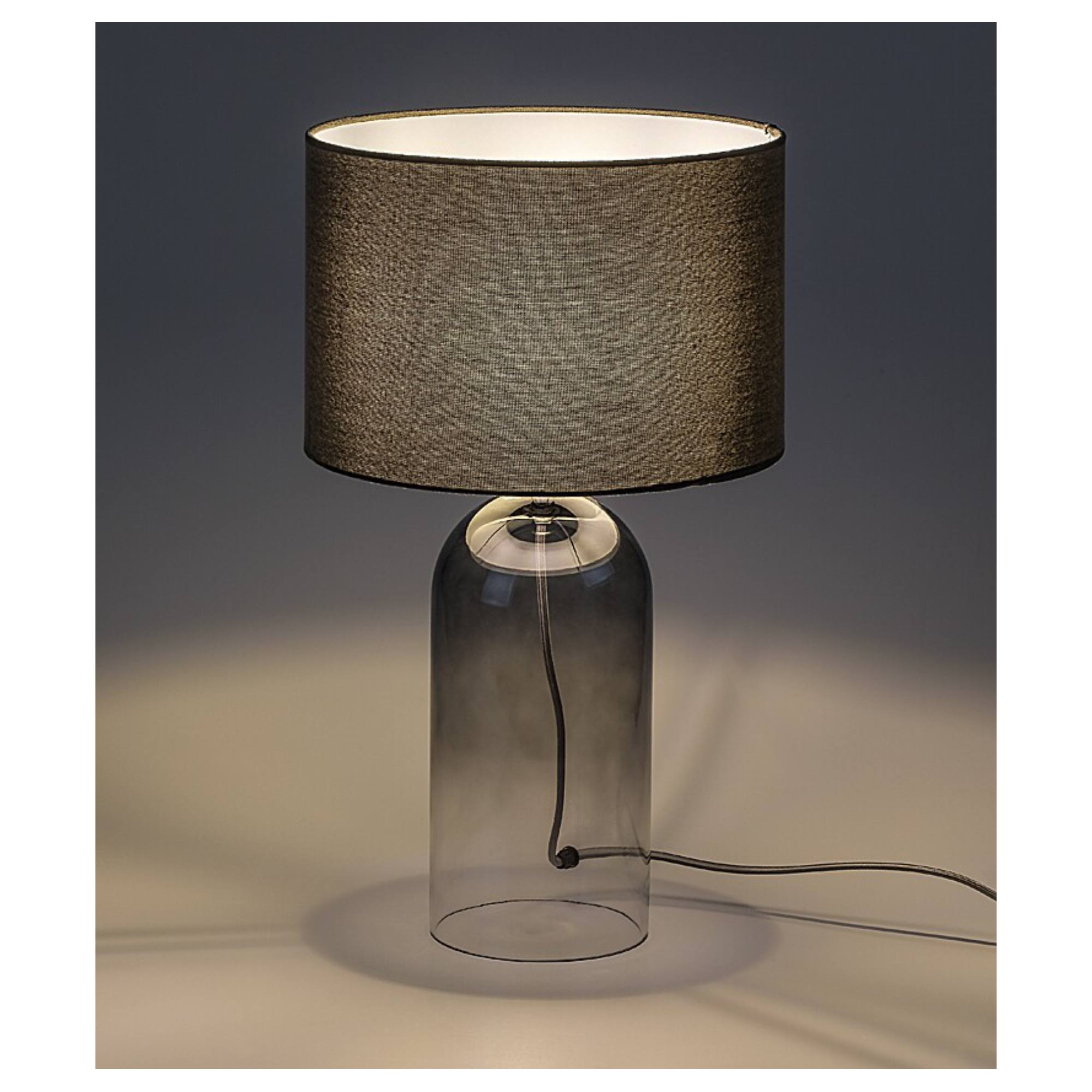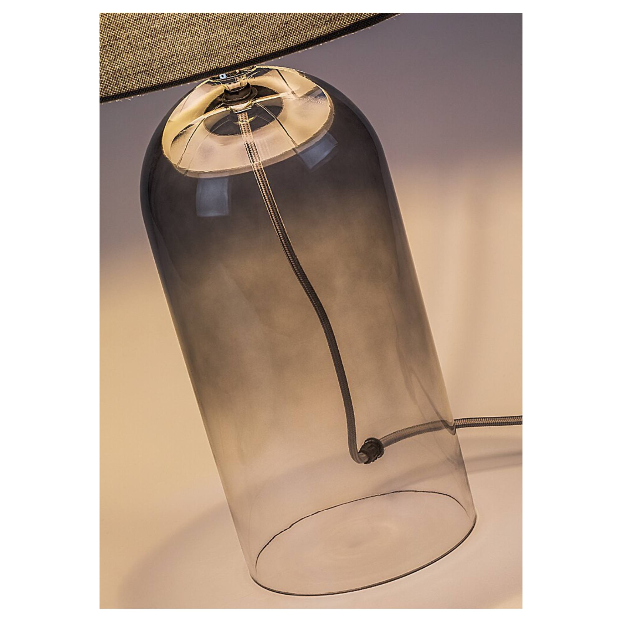 Telo lampy je vyrobené zo skla s dymovým efektom, ktorý jej dodáva jemný retro nádych a originálny vzhľad. Klasické textilné tienidlo v sivej farbe je nepostrádateľným doplnkom, ktorý rovnomerne rozloží svetlo a dodá príjemnú atmosféru do miestnosti. Vďaka jednoduchému, elegantnému dizajnu sa bude vynímať v rade interiérov. Skvele poslúži v obývacej izbe či spálni. Je doplnená vypínačom na kábli s dĺžkou 140 cm.