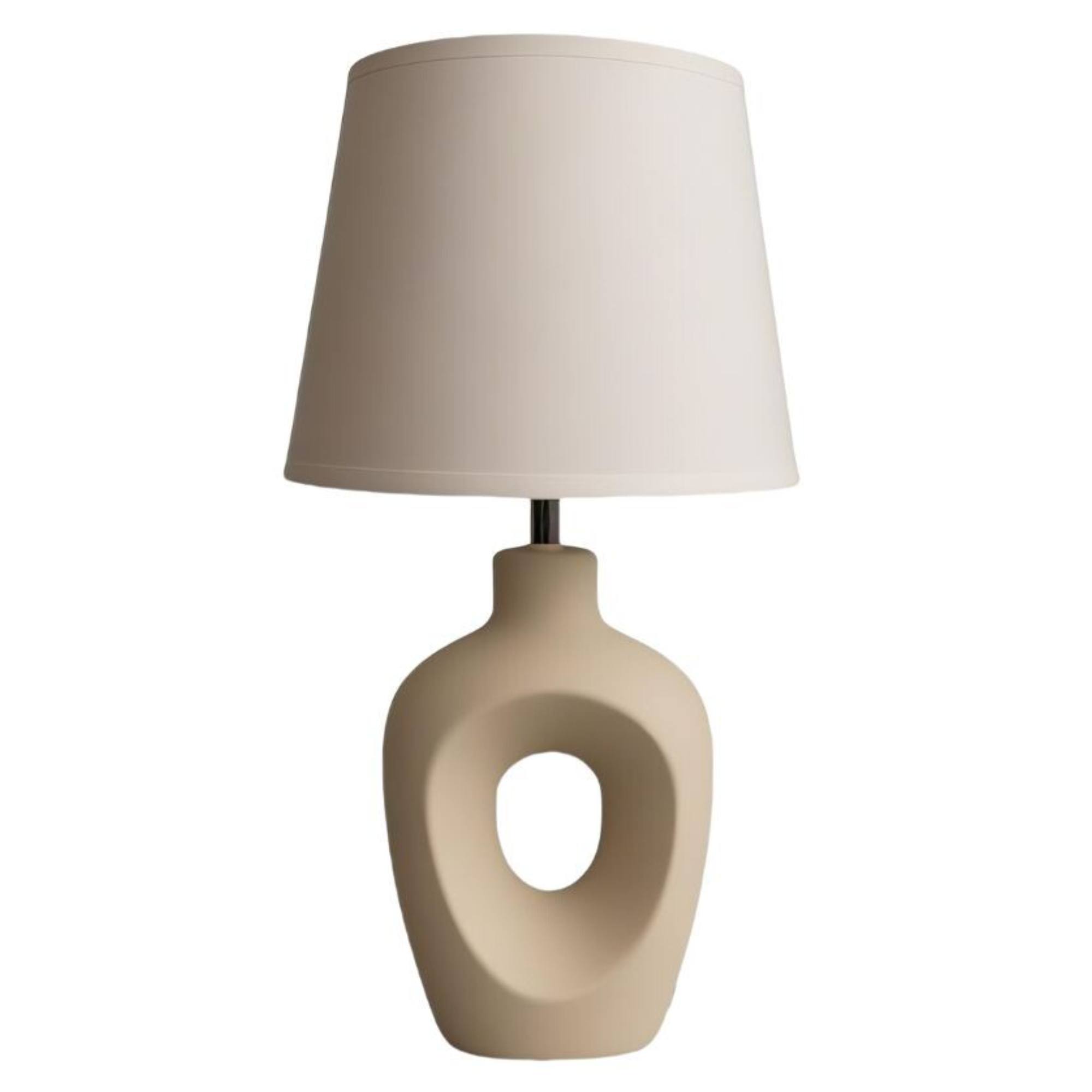 Telo lampy je vyrobené z keramiky v netradičnom tvare, ktorý z nej robí originálny doplnok. Klasické textilné tienidlo rovnomerne rozptyľuje svetlo a vytvára príjemnú atmosféru v miestnosti. Skvele poslúži v obývacej izbe či spálni. Je doplnená vypínačom na prívodnom kábli s dĺžkou 150 cm pre jednoduché a pohodlné ovládanie.