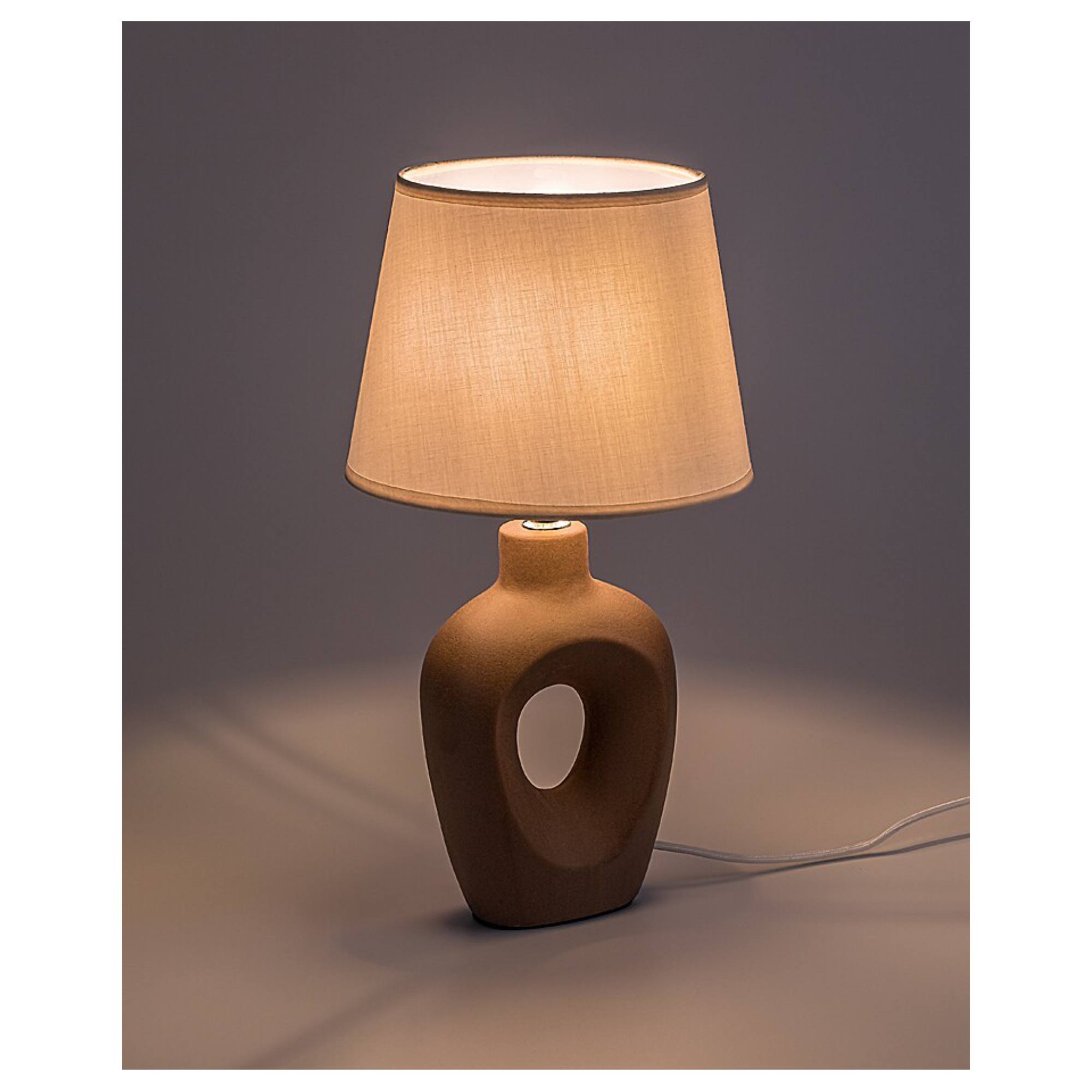 Telo lampy je vyrobené z keramiky v netradičnom tvare, ktorý z nej robí originálny doplnok. Klasické textilné tienidlo rovnomerne rozptyľuje svetlo a vytvára príjemnú atmosféru v miestnosti. Skvele poslúži v obývacej izbe či spálni. Je doplnená vypínačom na prívodnom kábli s dĺžkou 150 cm pre jednoduché a pohodlné ovládanie.