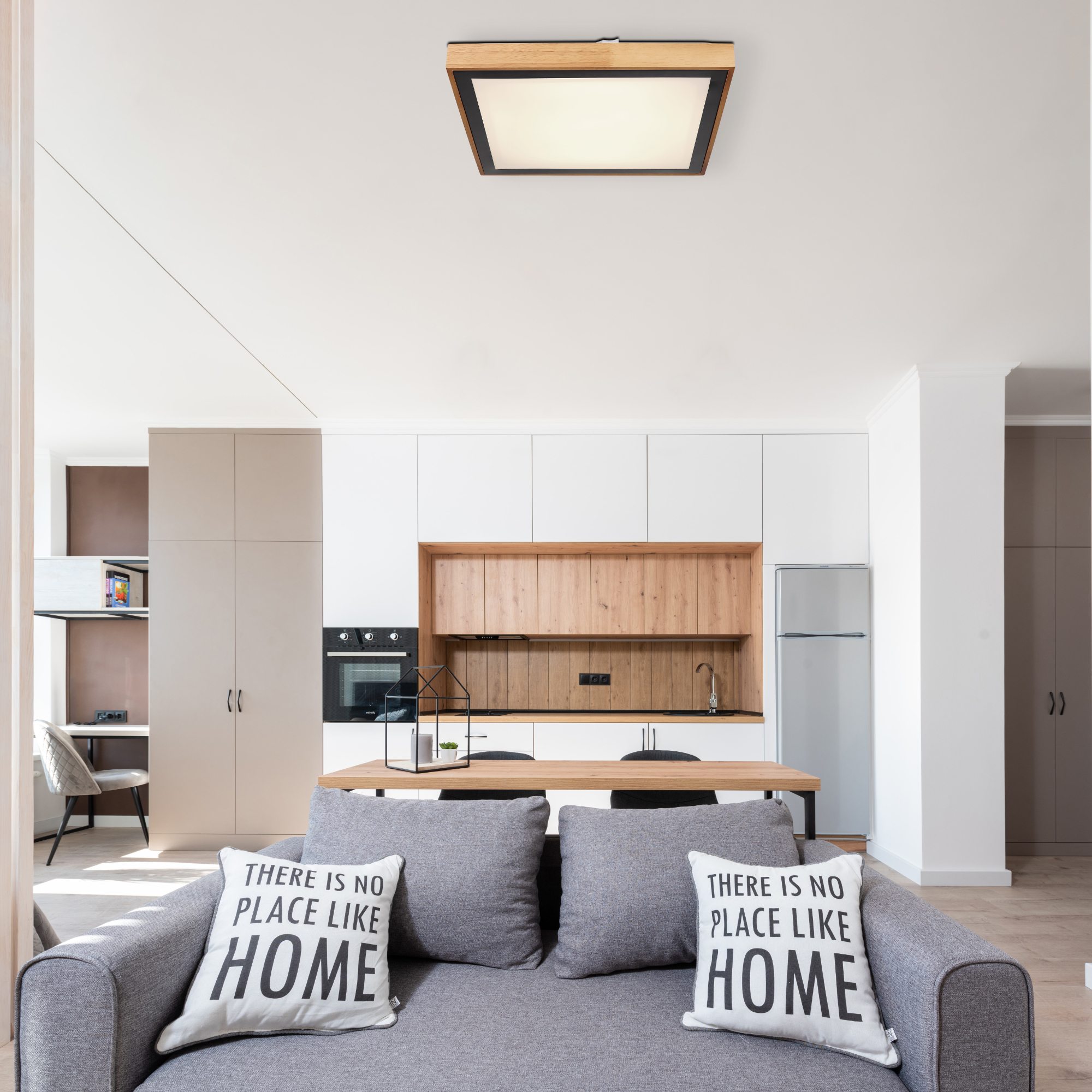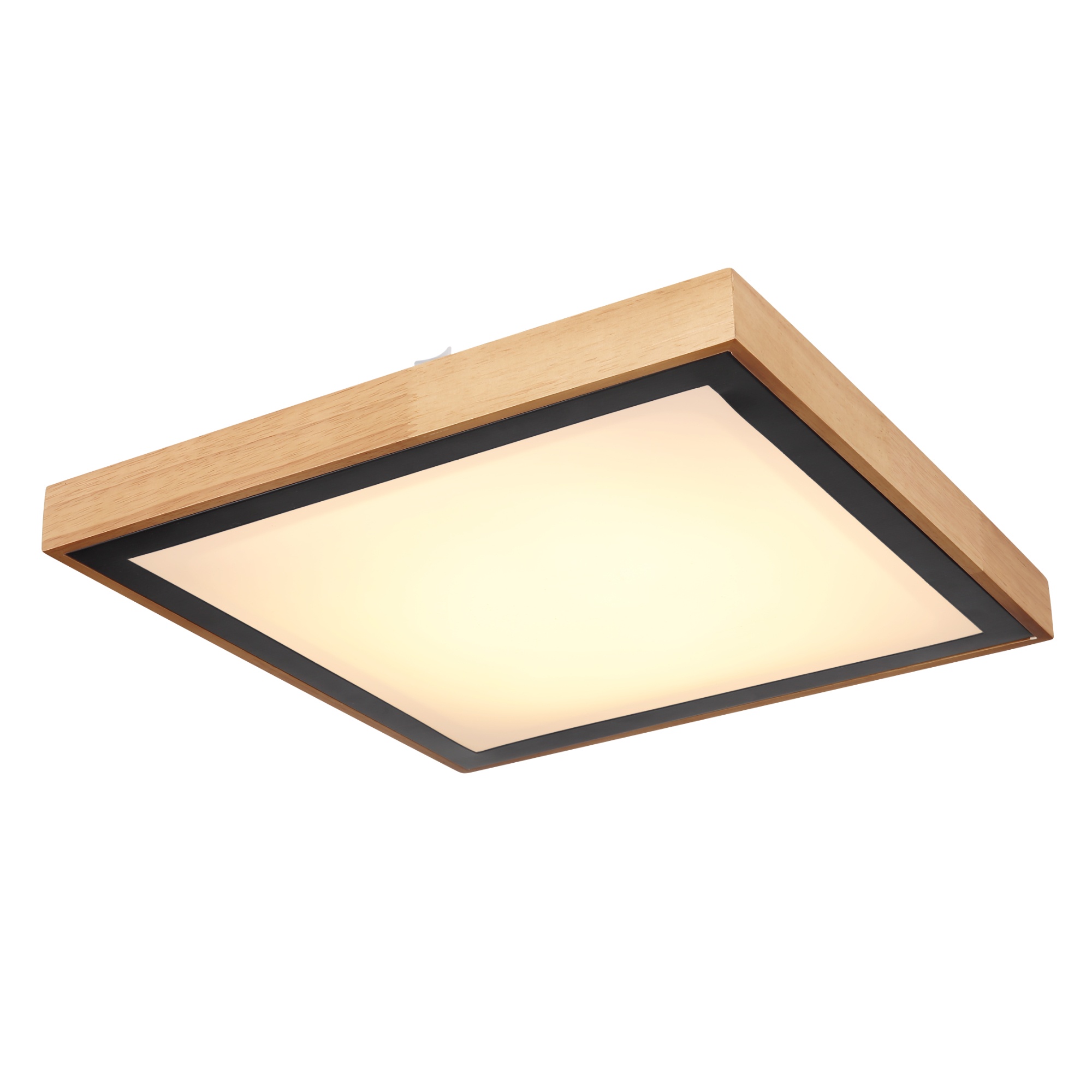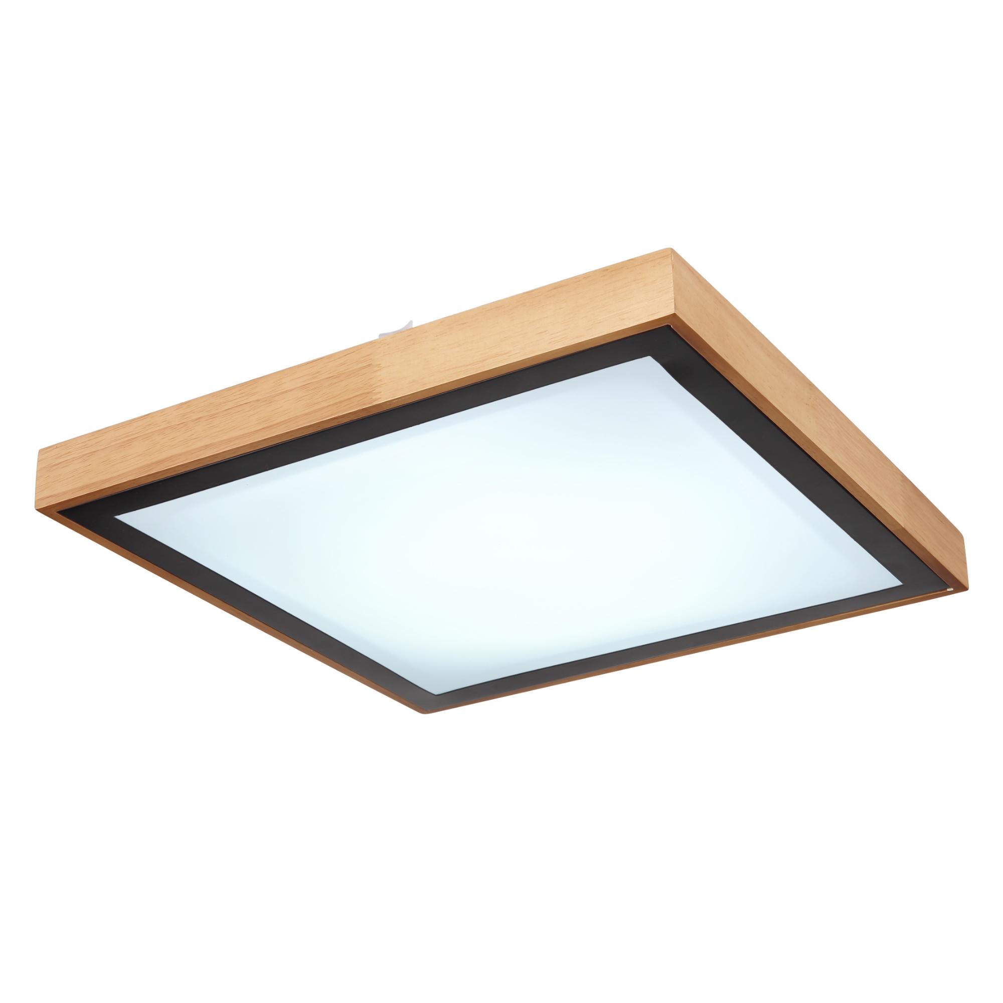 Drevený rám je doplnený čiernym kovovým štvorcom. Stropné svietidlo je možné prepínačom na svietidle fixovať v úrovniach svetla 3000K teplá biela, 4500K neutrálna biela a 6000K studená biela.