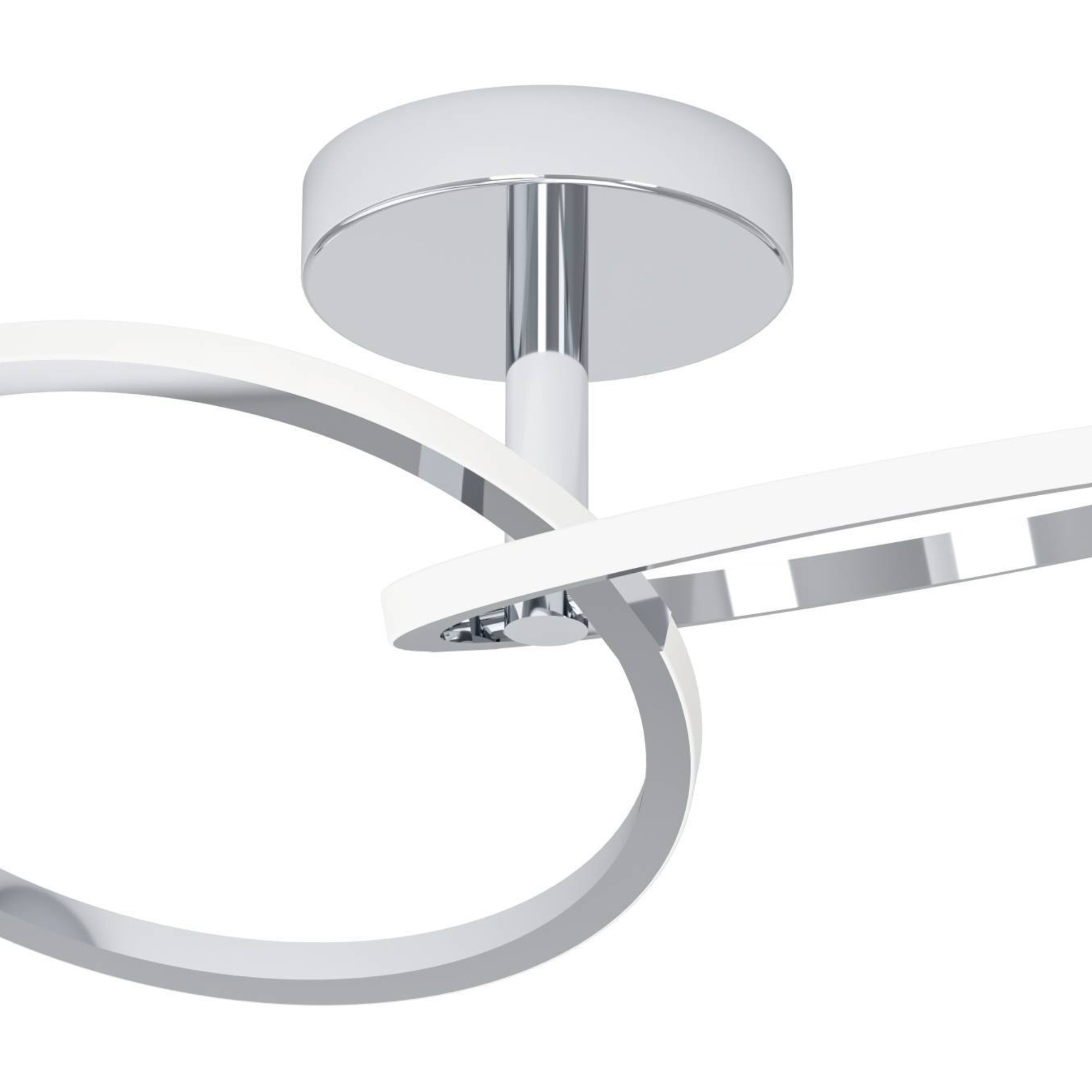Má kovovú konštrukciu v prevedení 2 spojených kruhov umiestnených na kruhovej základni. Tienidlá z bieleho plastu ukrývajú integrovaný LED svetelný zdroj s maximálnym príkonom 12W. Ponúka svetelný tok 1500 lúmenov s voliteľnou teplotou svetla 2700, 4000 a 6500 Kelvinov, ktorú si ľahko prispôsobíte podľa potreby. Vďaka svojmu dizajnovému prevedeniu štýlovo doplní akúkoľvek miestnosť v modernom interiéri.