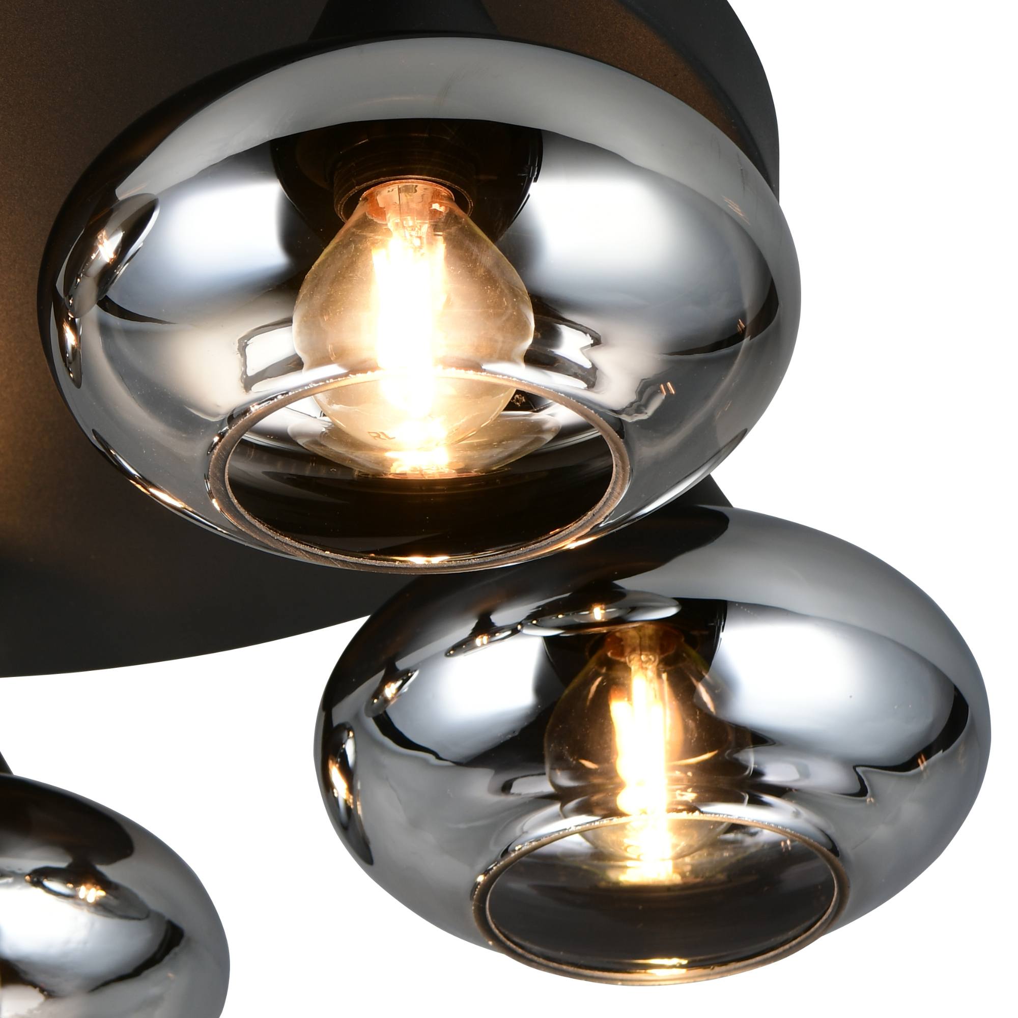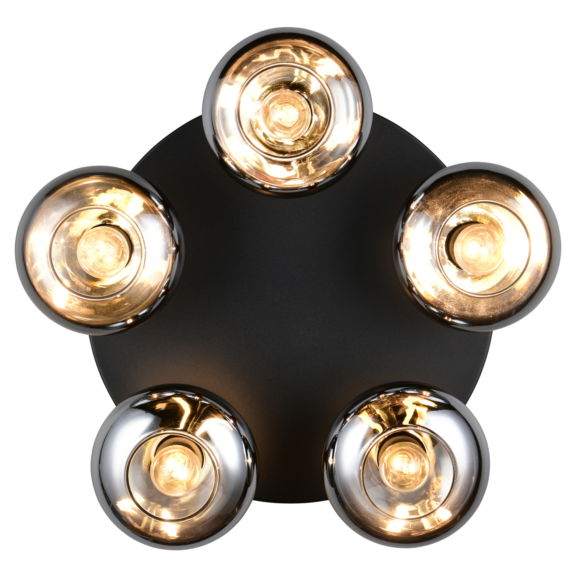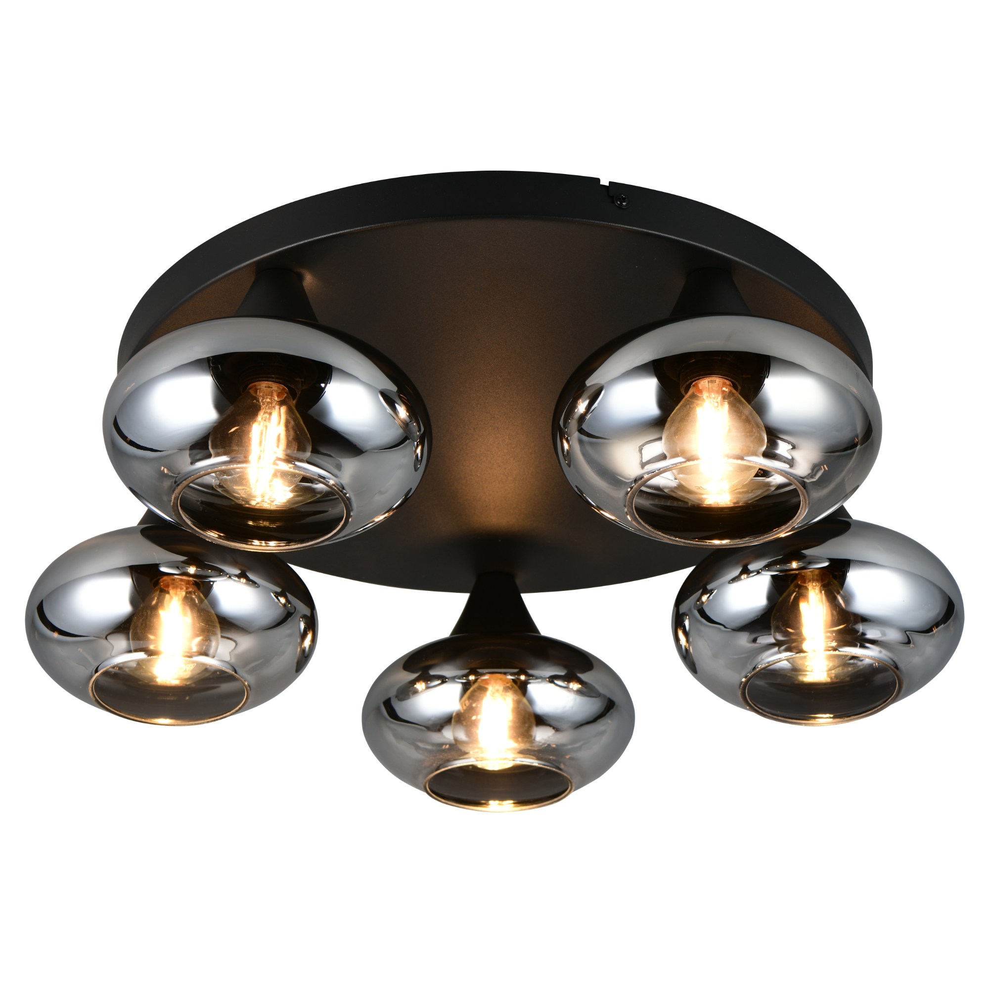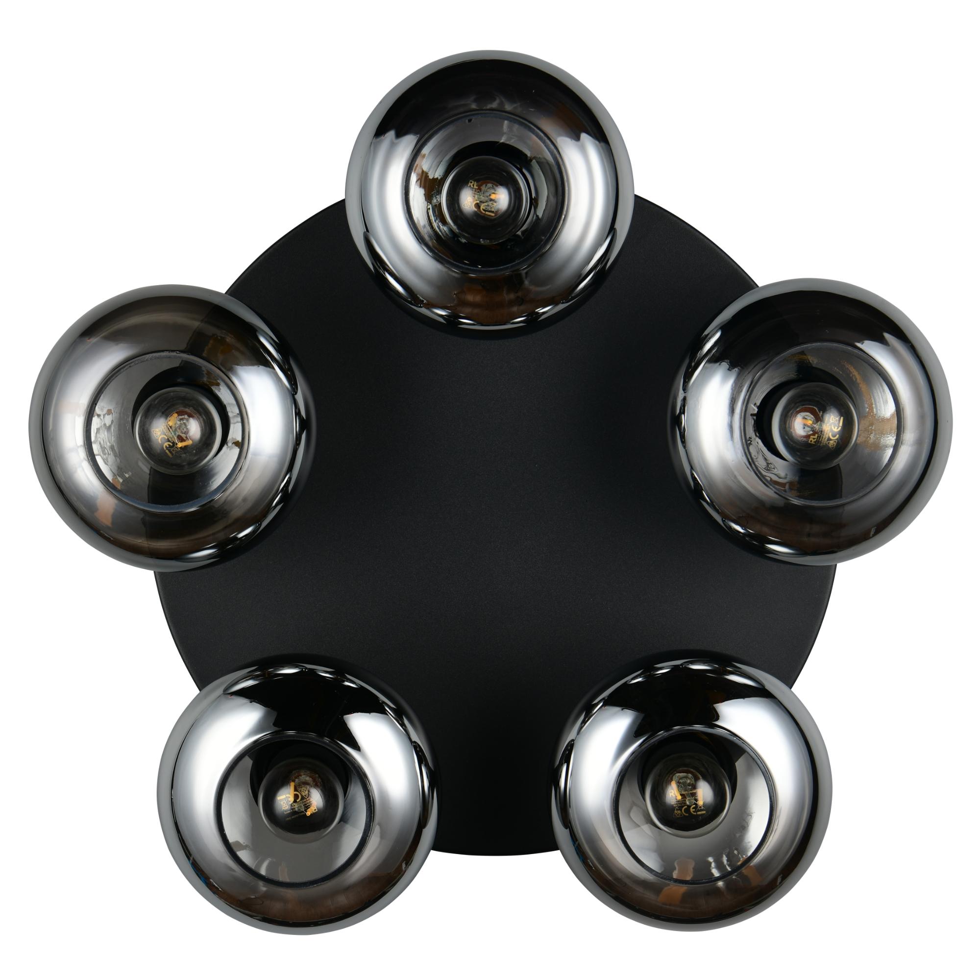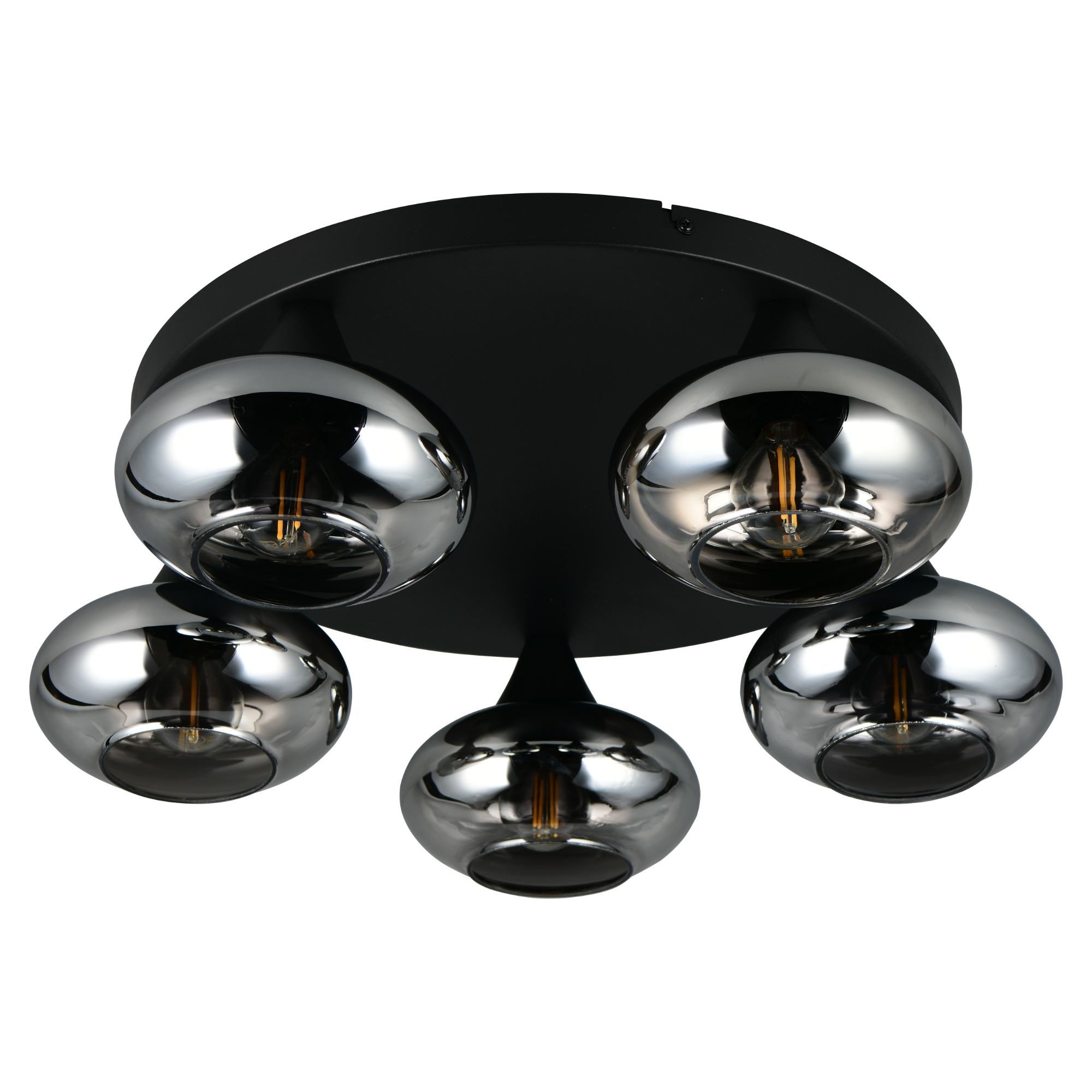 Má čiernu kovovú konštrukciu v okrúhlom tvare, doplnenú 5 tienidlami. Tie sú vyrobené zo skla s použitím dymového efektu, ktorý im dodáva neobyčajný retro nádych. Elegantný dizajn svietidla z neho vytvára nielen funkčný, ale aj štýlový prvok každého interiéru. Odporúčame použiť žiarovky v retro dizajne napríklad so špirálovou diódou, čím posuniete svietidlo na ďalšiu úroveň.