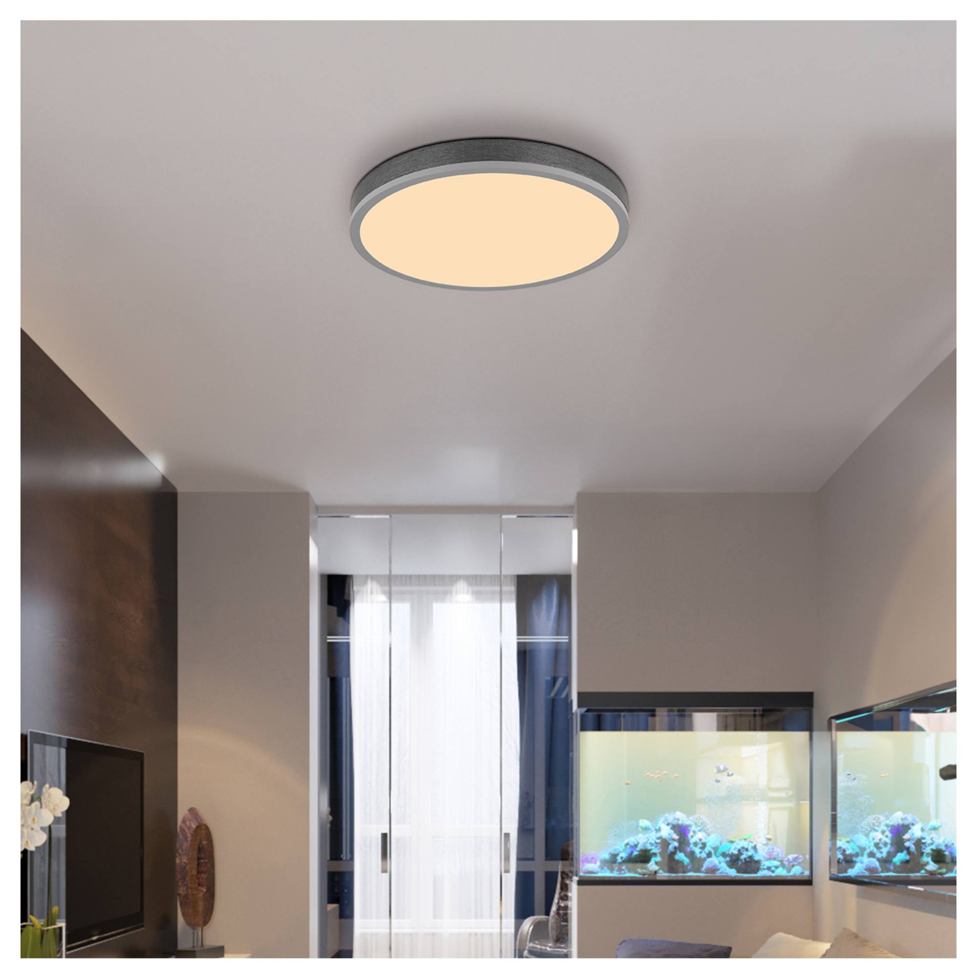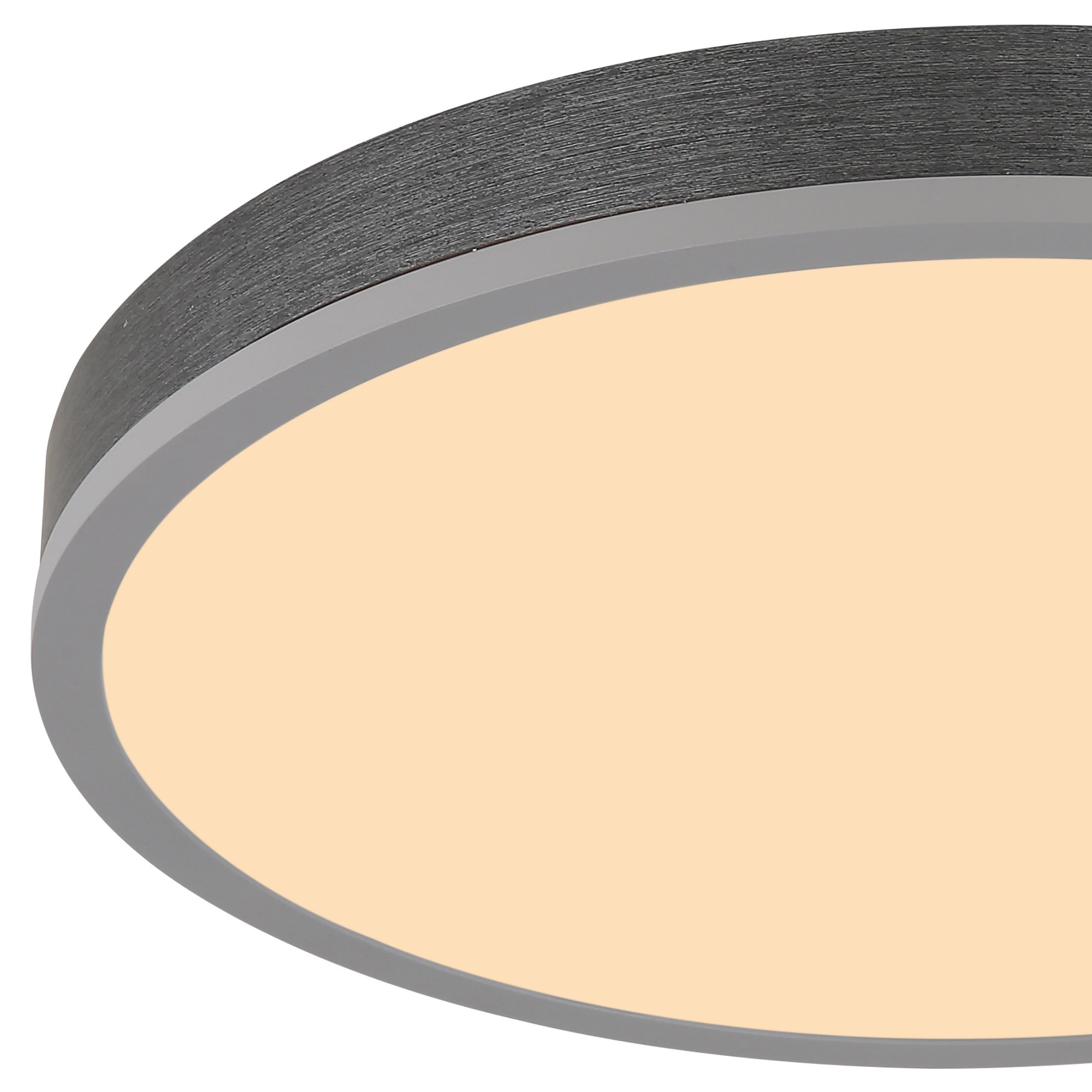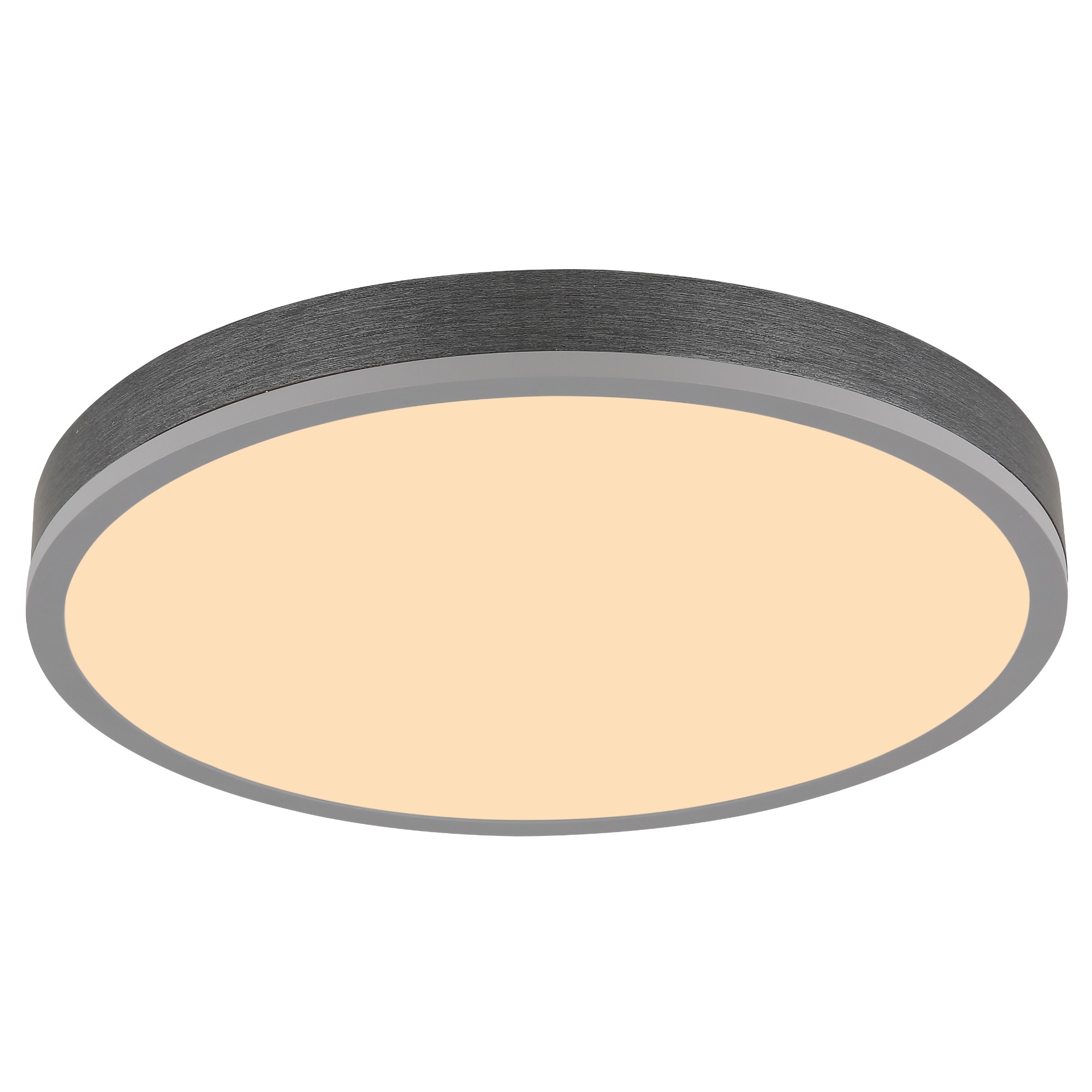 Svietidlo disponuje integrovaným LED svetelným zdrojom s maximálnym príkonom 24W. Má svetelný tok 1200 lúmenov s teplotou svetla 3000 kelvinov, ktorá sa označuje ako teplá biela. Teplá biela vo vašej miestnosti vytvorí útulnú atmosféru a nebude dráždiť vaše oči. Konštrukcia svietidla je vyrobená z drevo-vláknitej MDF dosky tmavosivej farby v klasickom kruhovom tvare s priemerom 45 cm. Tú dopĺňa plastové tienidlo s hliníkovým okrajom, ktorý je štýlovou bodkou tohto dizajnu.