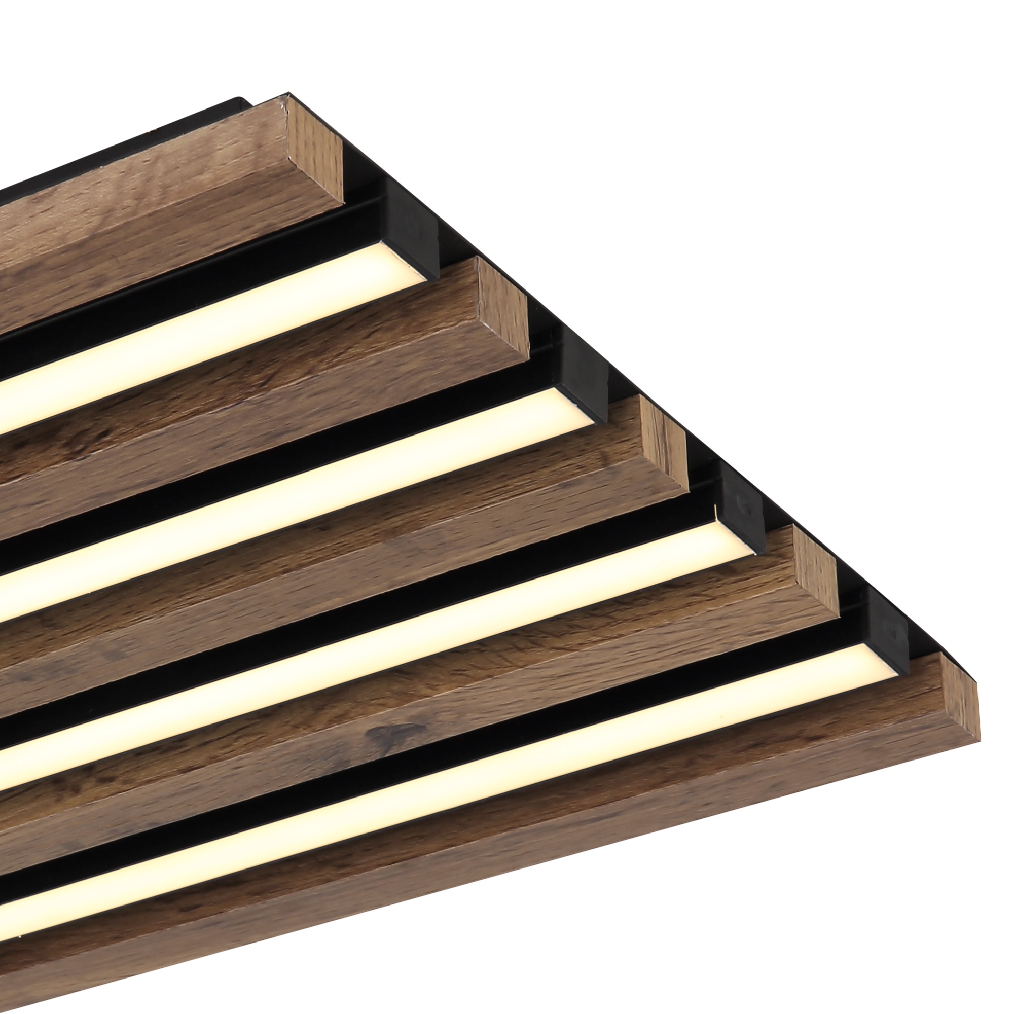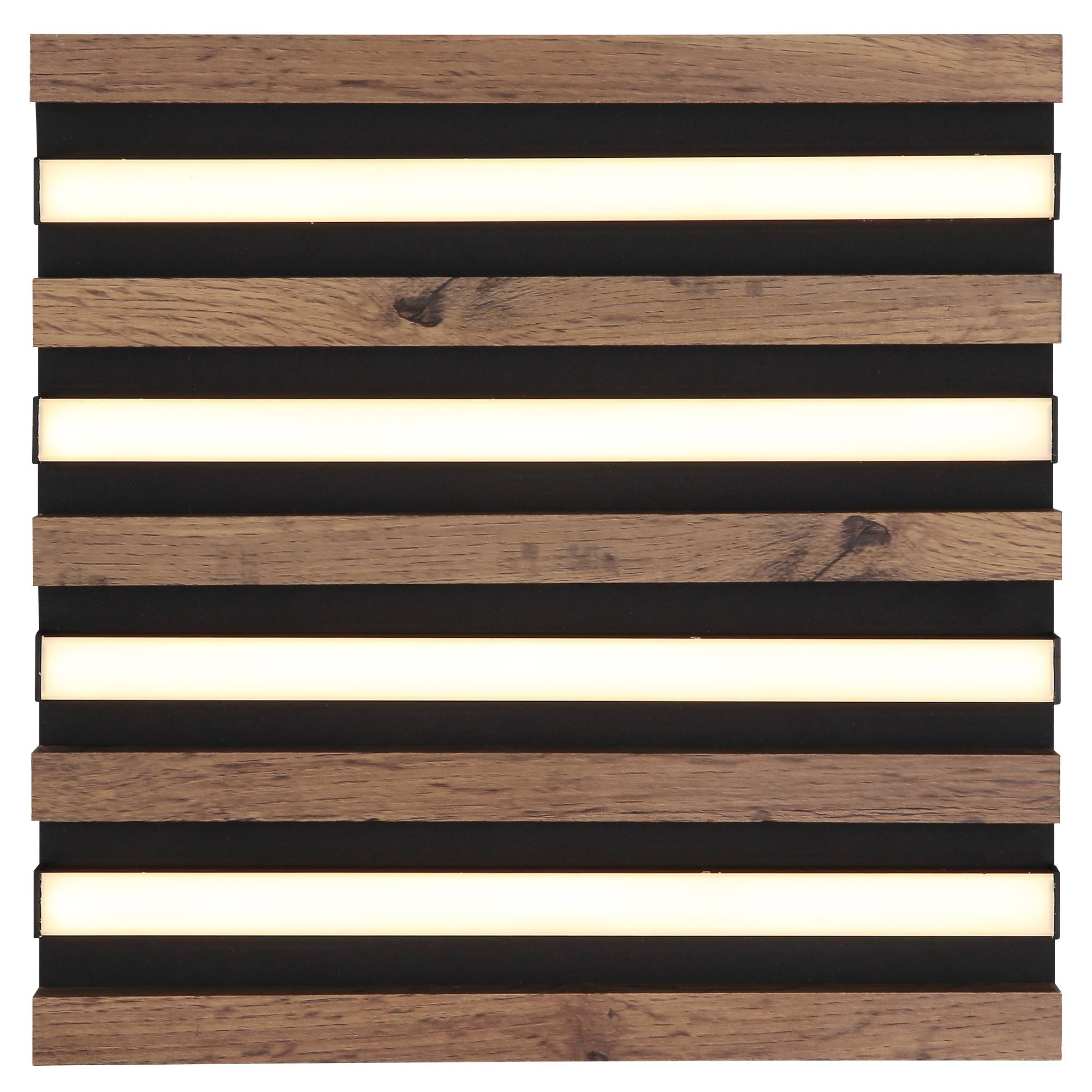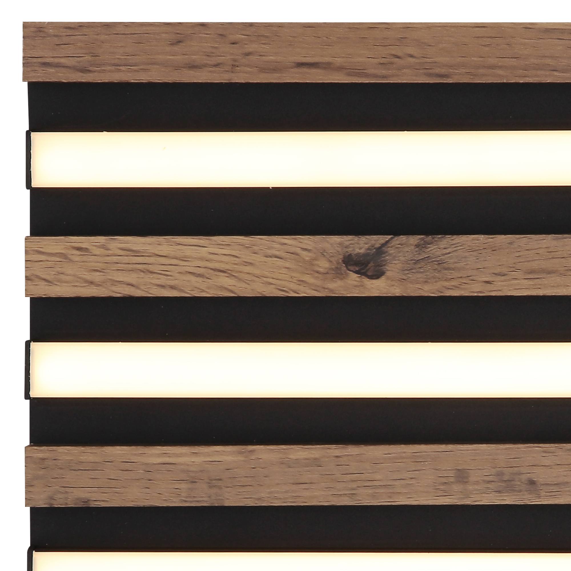 Má čiernu kovovú konštrukciu, ktorú dopĺňajú lamely z pevnej drevo-vláknitej MDF dosky s dekorom tmavého dreva. Ten dodá miestnosti nádych prírody. Medzi lamelami sú umiestnené podlhovasté LED panely s integrovaným LED svetelným zdrojom s maximálnym príkonom 15W. Má svetelný tok 800 lúmenov s teplotou svetla 3000 kelvinov, ktorá sa označuje ako teplá biela. Teplá biela vytvorí v miestnosti útulnú atmosféru a nebude dráždiť vaše oči. Je teda ideálne do obývacej izby, spálne či jedálne.