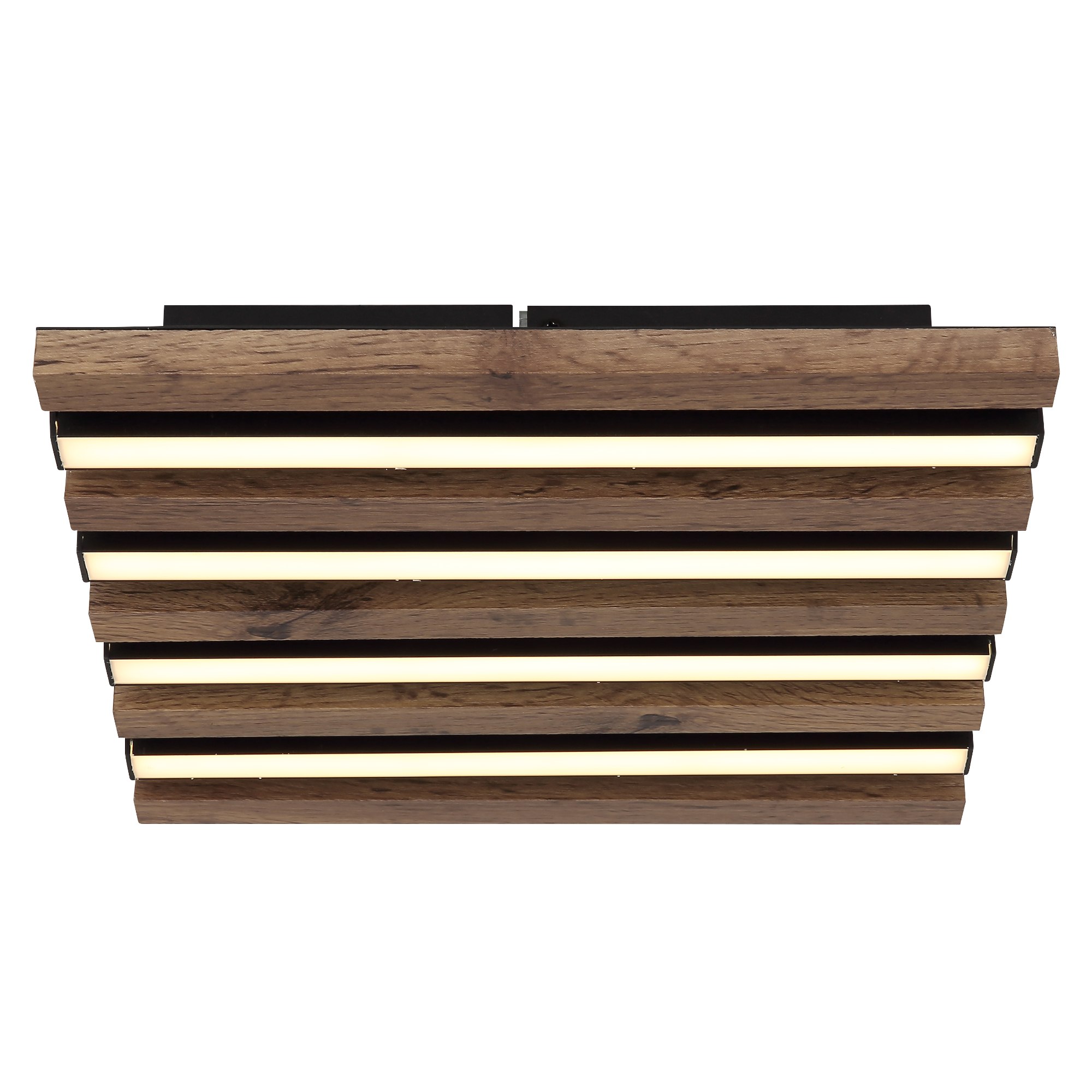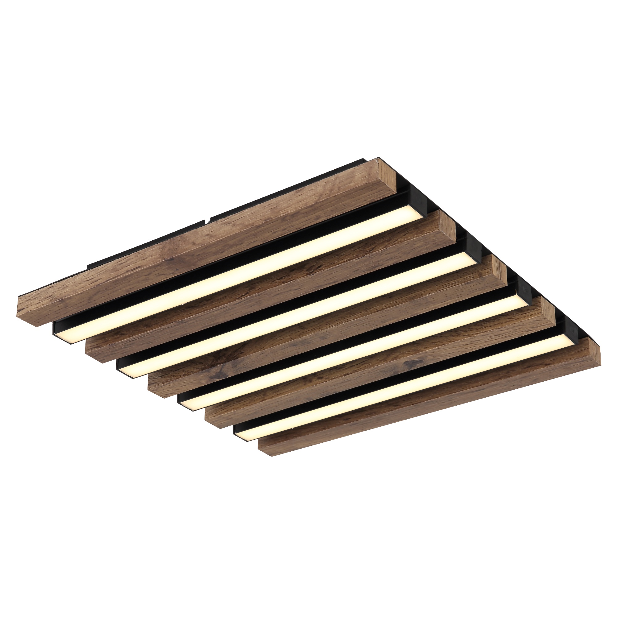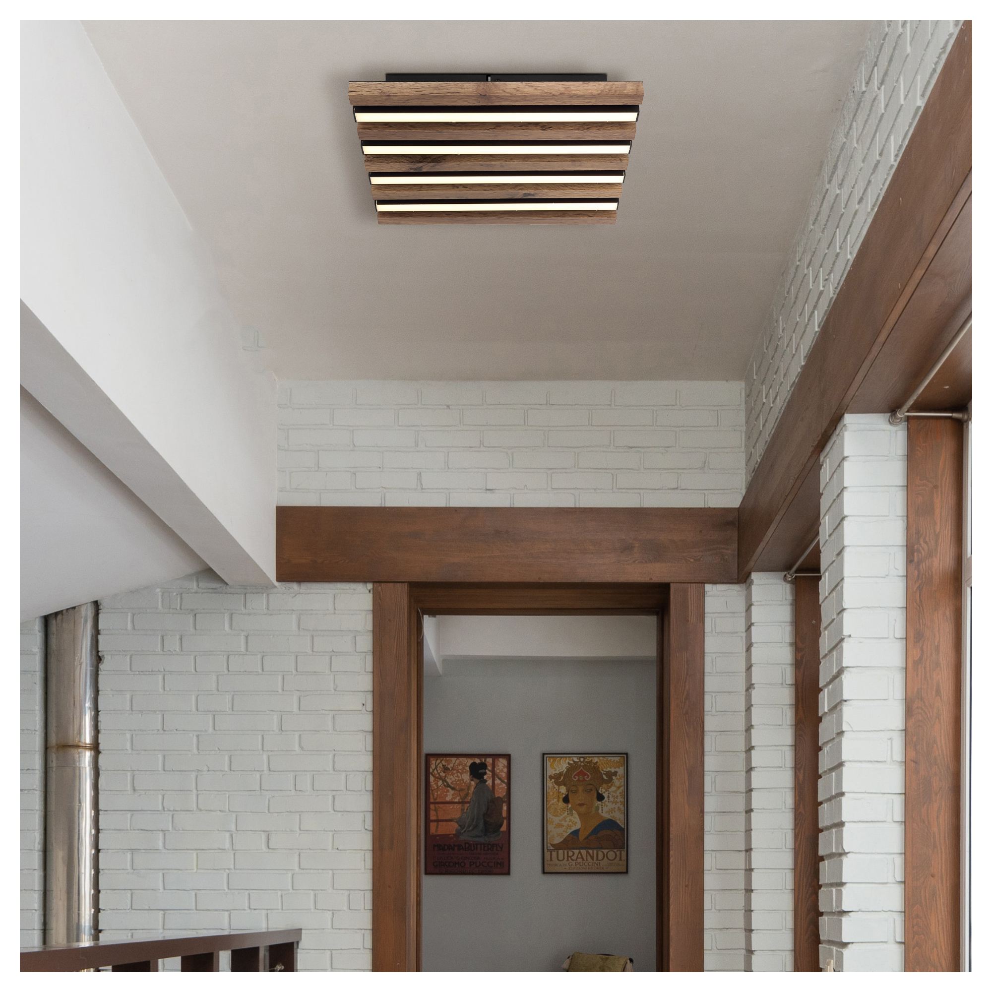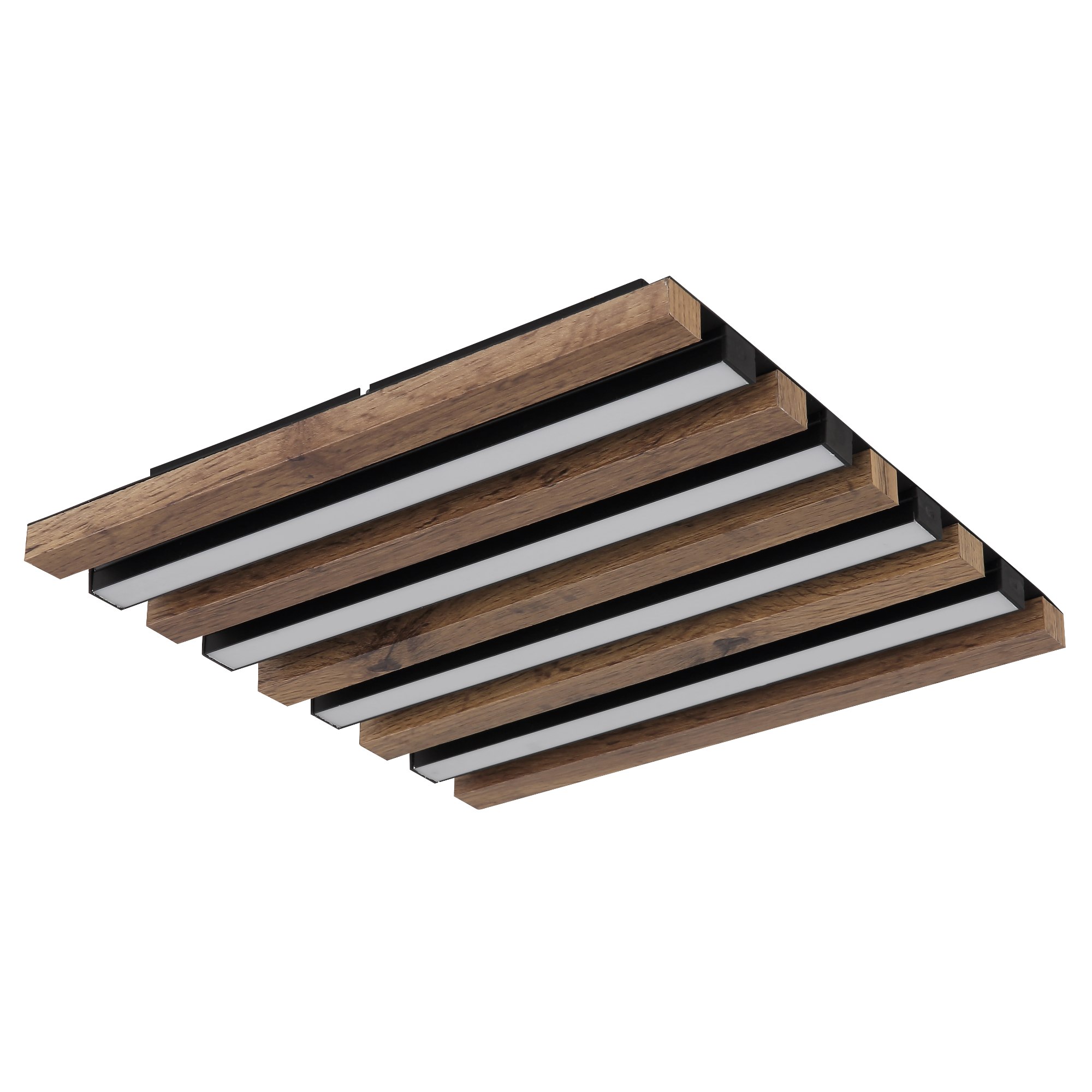 Má čiernu kovovú konštrukciu, ktorú dopĺňajú lamely z pevnej drevo-vláknitej MDF dosky s dekorom tmavého dreva. Ten dodá miestnosti nádych prírody. Medzi lamelami sú umiestnené podlhovasté LED panely s integrovaným LED svetelným zdrojom s maximálnym príkonom 15W. Má svetelný tok 800 lúmenov s teplotou svetla 3000 kelvinov, ktorá sa označuje ako teplá biela. Teplá biela vytvorí v miestnosti útulnú atmosféru a nebude dráždiť vaše oči. Je teda ideálne do obývacej izby, spálne či jedálne.