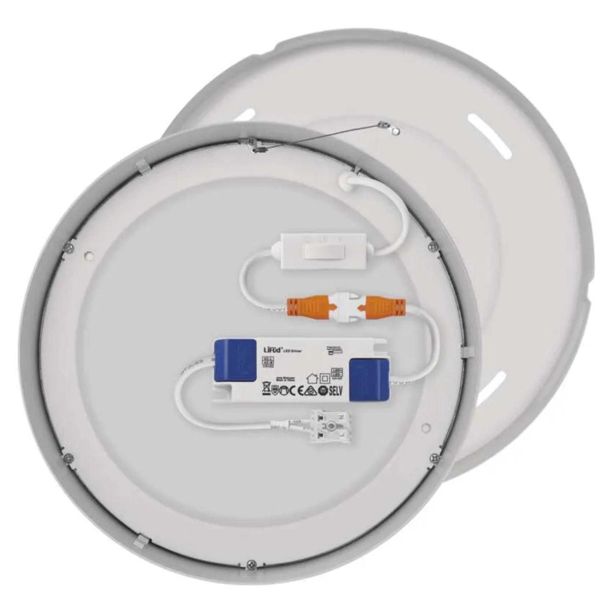 Má bielu kovovú konštrukciu v klasickom kruhovom tvare s priemerom 22,5 cm. Za plastovým tienidlom sa nachádza integrovaný LED svetelný zdroj s maximálnym príkonom 21 W. Zdroj má svetelný tok 1900 lúmenov s voliteľnou teplotou svetla 3000, 3500 a 4000 Kelvinov, ktorú zvolíte pri montáži svietidla. Výhodnou vlastnosťou zdroja je dlhá životnosť, ktorá poskytuje až 30 000 hodín osvetlenia.