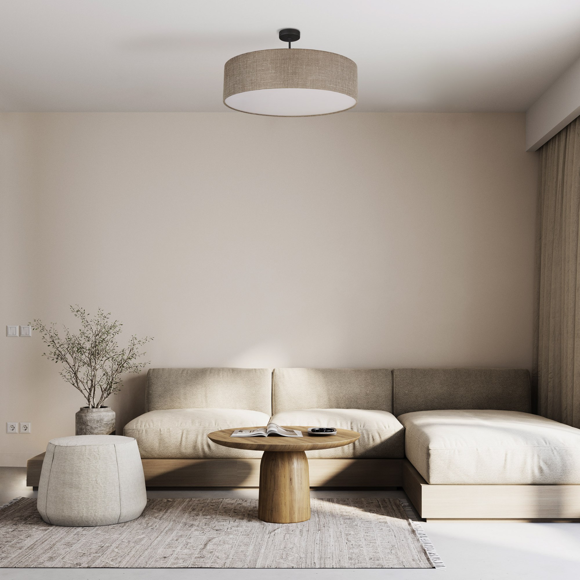 Má čiernu kovovú konštrukciu, na ktorej je pripevnené tienidlo v sivohnedej farbe. Tienidlo je doplnené bielou krycou doskou, ktorá zabezpečuje jemné a rovnomerné rozptýlenie svetla. Bude štýlovým a praktickým osvetlením v obývačke, spálni aj jedálni.