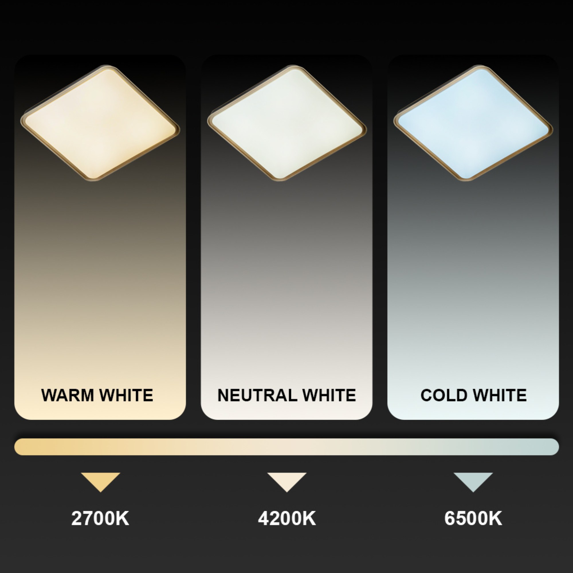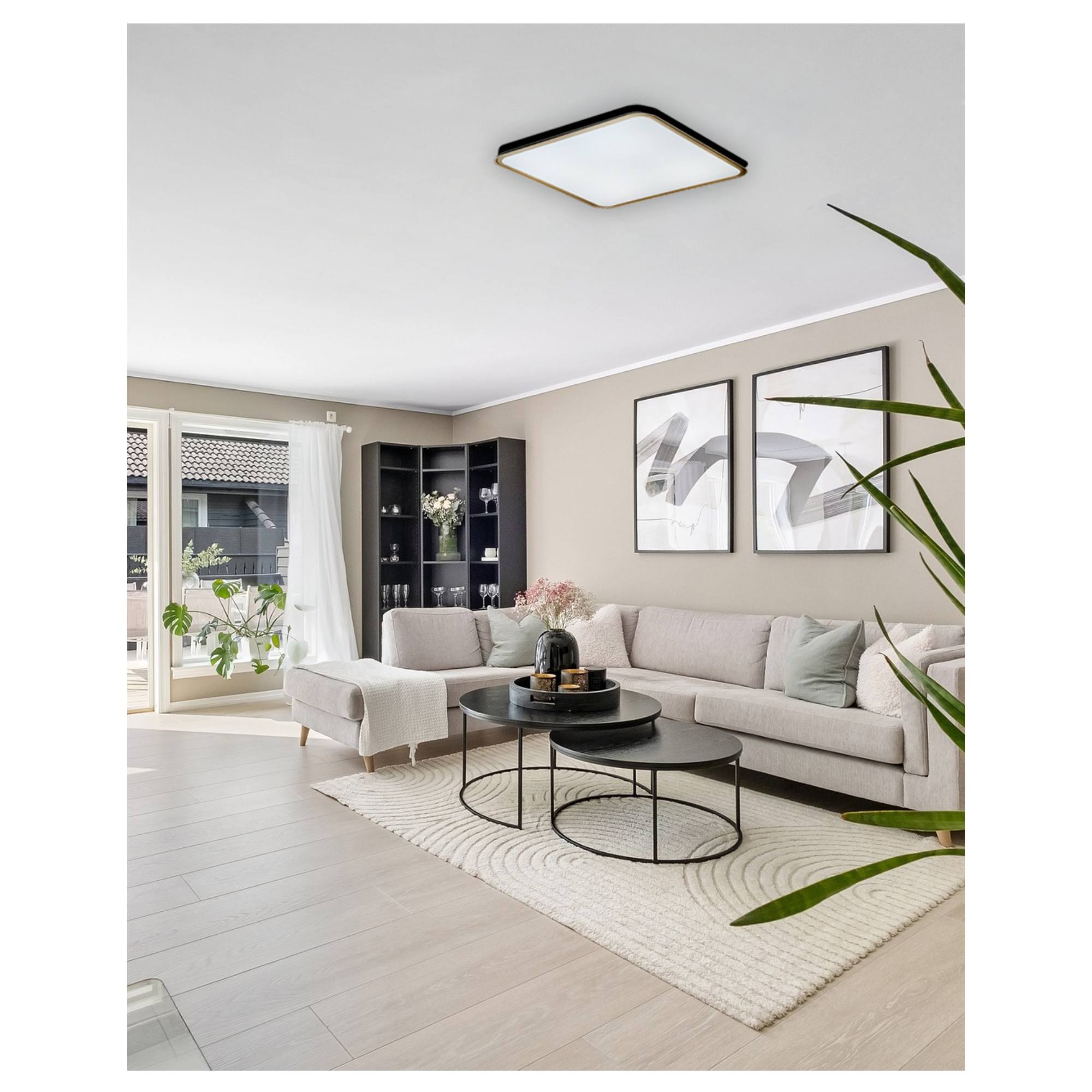 Je vyhotovené v štvorcovom tvare s rozmermi 50x50 cm. Má tenký kovový rám v kontrastnej kombinácii zlatej a čiernej farby. Za bielym tienidlom sa ukrýva integrovaný LED svetelný zdroj s maximálnym príkonom 60W. Má svetelný tok 5700 lúmenov s voliteľnou teplotou svetla 2700 až 6500 Kelvinov. V kombinácii s funkciou stmievania je optimálnou voľbou na každú príležitosť. Je tiež vybavené časovačom vypnutia na 30 sekúnd, nočným režimom s nízkou intenzitou pre pokojný večer a pamäťovou funkciou, vďaka ktorej sa zapne na poslednom nastavení pred vypnutím.