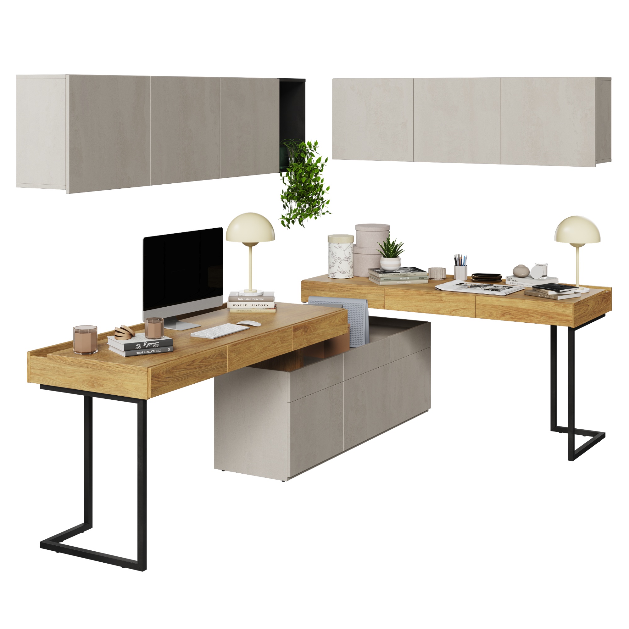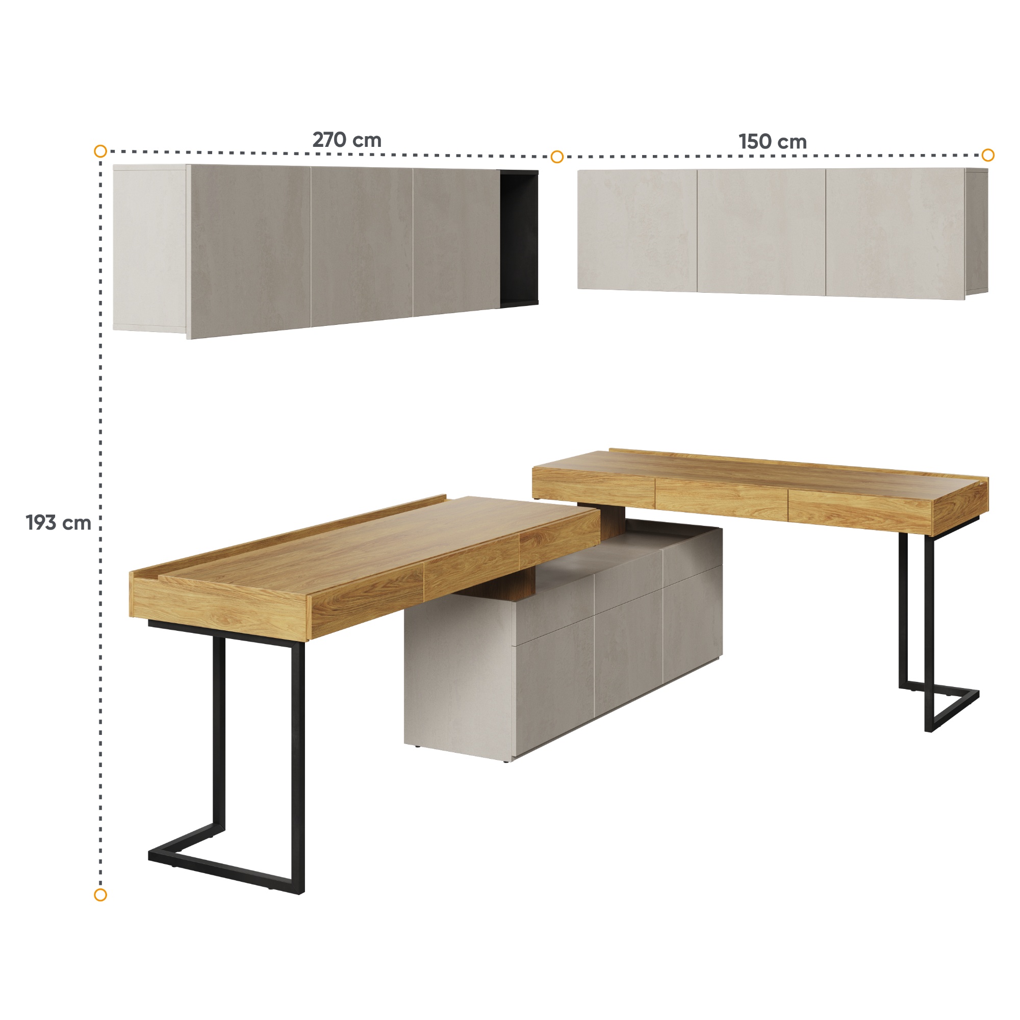 Zostava ponúka 2 priestranné písacie stoly s doskami v prírodnom dekore orecha hiroka. Každá z dosiek je vybavená 3 praktickými zásuvkami. Stoly sú na jednej strane podopreté kovovou nohou a na strane druhej ich pripevníte ku komode. Táto komoda je uzatvárateľná pomocou 3 otočných dverí, kedy za každými z nich vnútorný priestor rozdeľuje 1 vložená polica. Zostava dokonale využíva aj nástenné priestory a jej súčasťou sú 2 závesné skrinky s rovnakým vybavením ako už spomínaná komoda. Posledným detailom je nástenný regál poskytujúci otvorený odkladací priestor. Všetky prvky sú vytvorené v minimalistickom, bezrúčkovom vyhotovení.