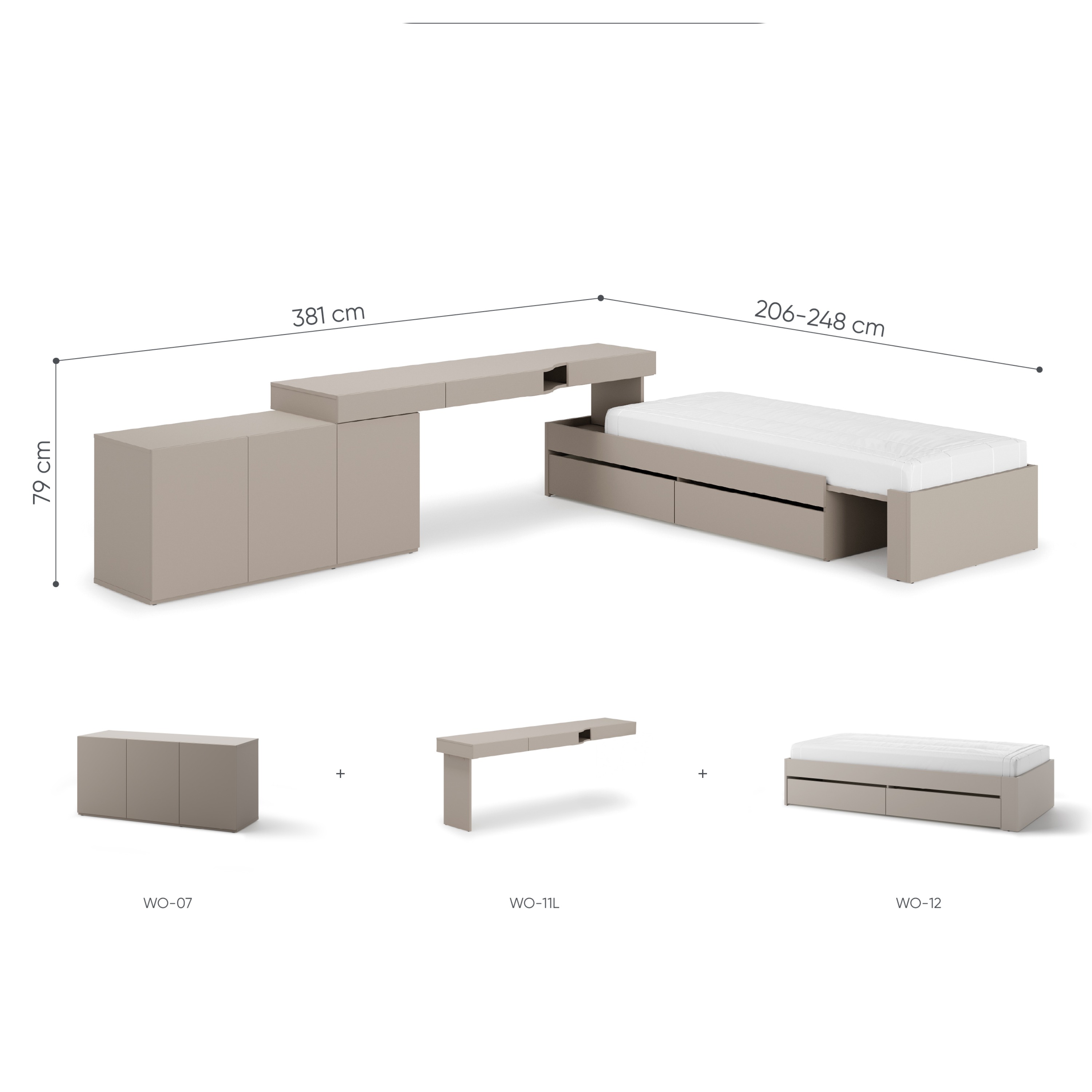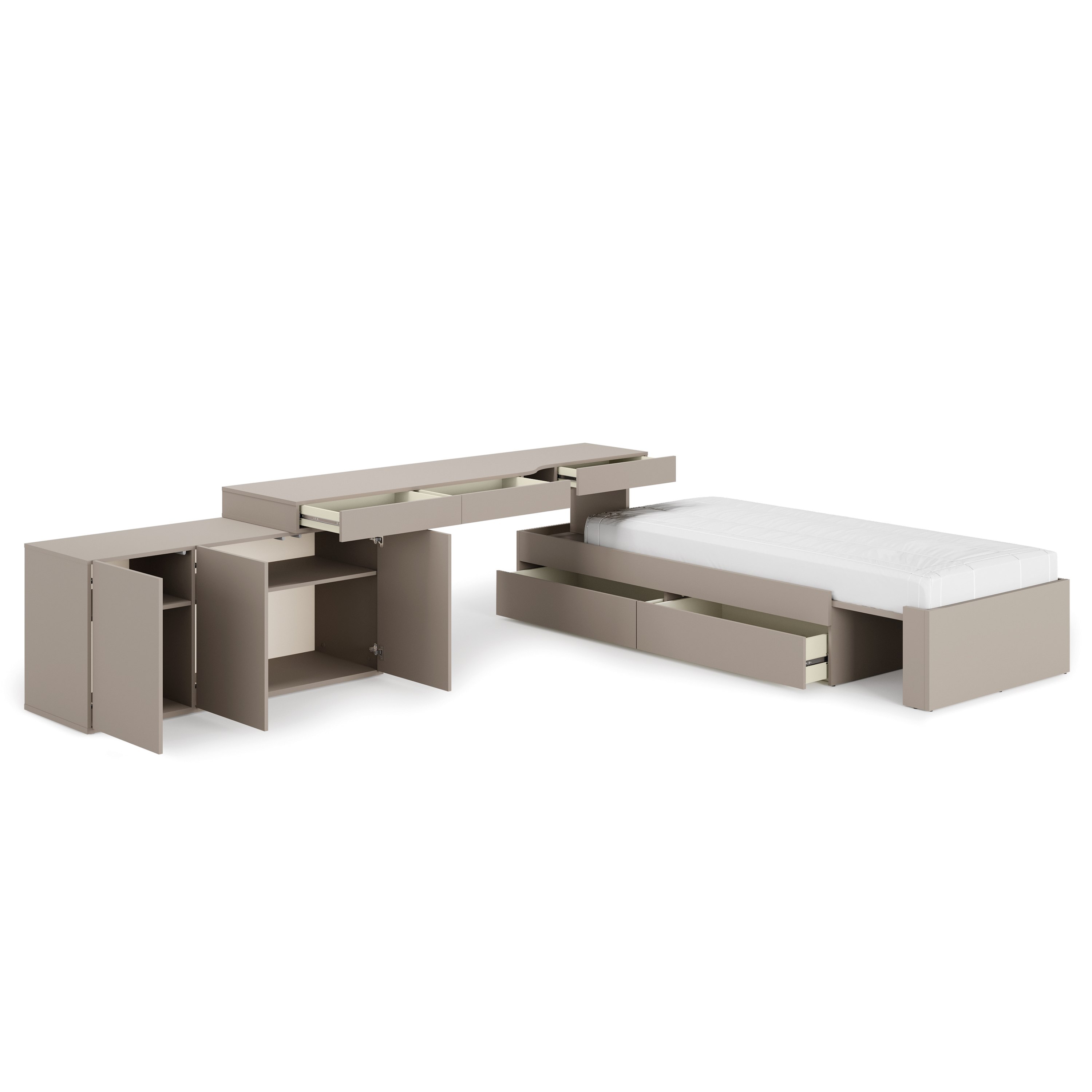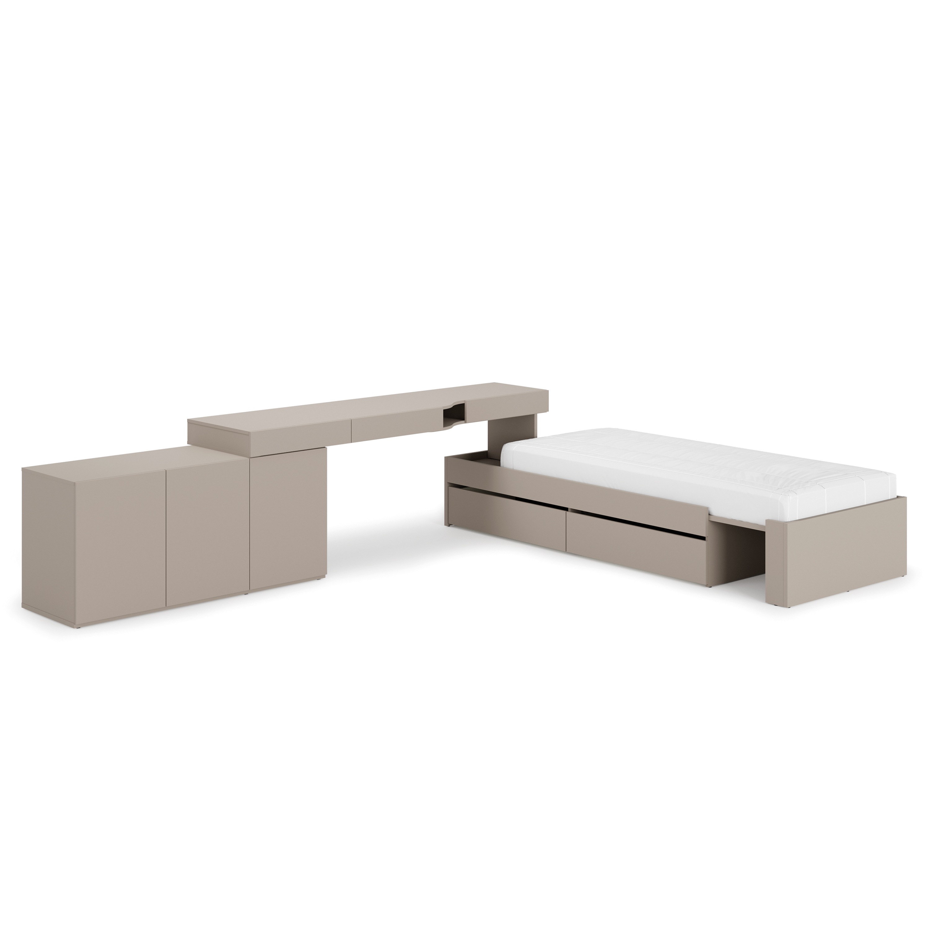 Set obsahuje písací stôl s priestrannou hornou doskou, ktorého súčasťou sú 3 zásuvky a otvorený priestor na uschovanie dokumentov či školských potrieb. Stôl z jednej strany upevníte ku komode, ktorá je uzatvárateľná pomocou 3 otočných dverí. Za nimi sa nachádzajú priestory s celkom 2 vloženými policami. Z druhej strany sa stôl upevní k posteli s rozmerom 90x200 cm, ktorá je vybavená 2 zásuvkami. Zostava je vyhotovená vo funkčnom prevedení bez úchytiek, ktoré podčiarkuje čistý, moderný vzhľad celku.