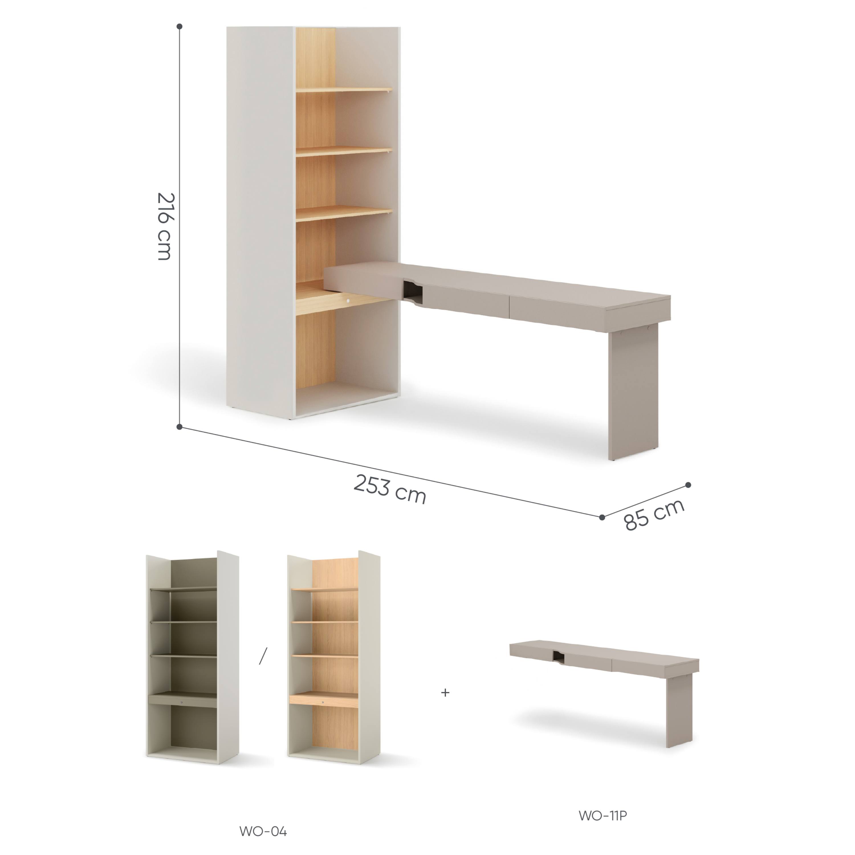 Set obsahuje písací stôl s priestrannou hornou doskou, ktorého súčasťou sú 3 zásuvky a otvorený priestor na uschovanie dokumentov či školských potrieb. Stôl z jednej strany upevníte k otvorenému regálu so 4 vloženými policami a LED osvetlením. Zostava je vyhotovená vo funkčnom prevedení bez úchytiek, ktoré podčiarkuje čistý, moderný vzhľad celku.