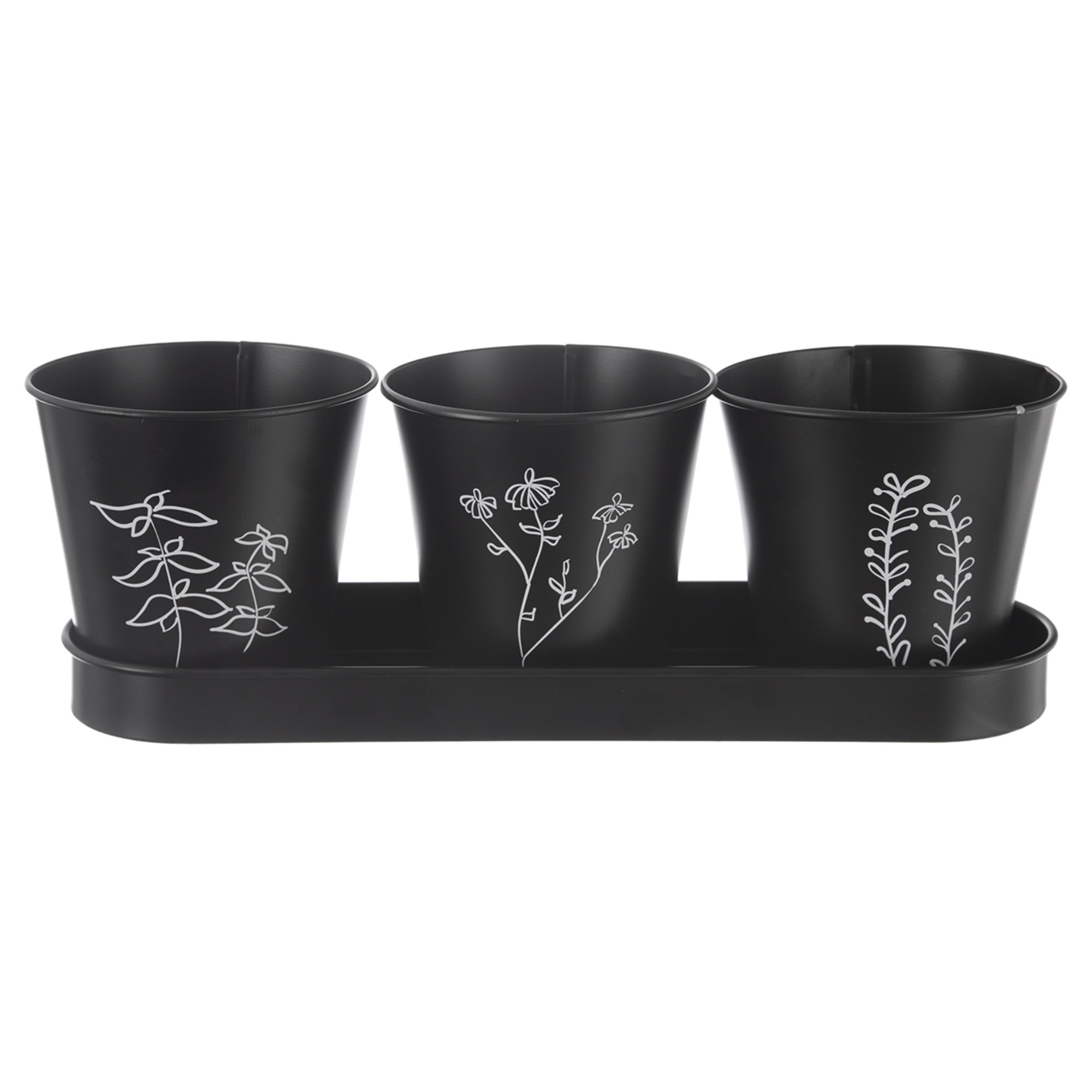 Súčasťou sady 3 ks plechových kvetináčov s otvorom je aj praktická miska na prebytočnú vodu. Všetko je ošetrené čiernym nástrekom a jemnou bielou kresbou kvetín. Kvetináče sú funkčným, ale aj štýlovým doplnkom. Svojou malou veľkosťou padnú do vašej kuchyne ako uliate.