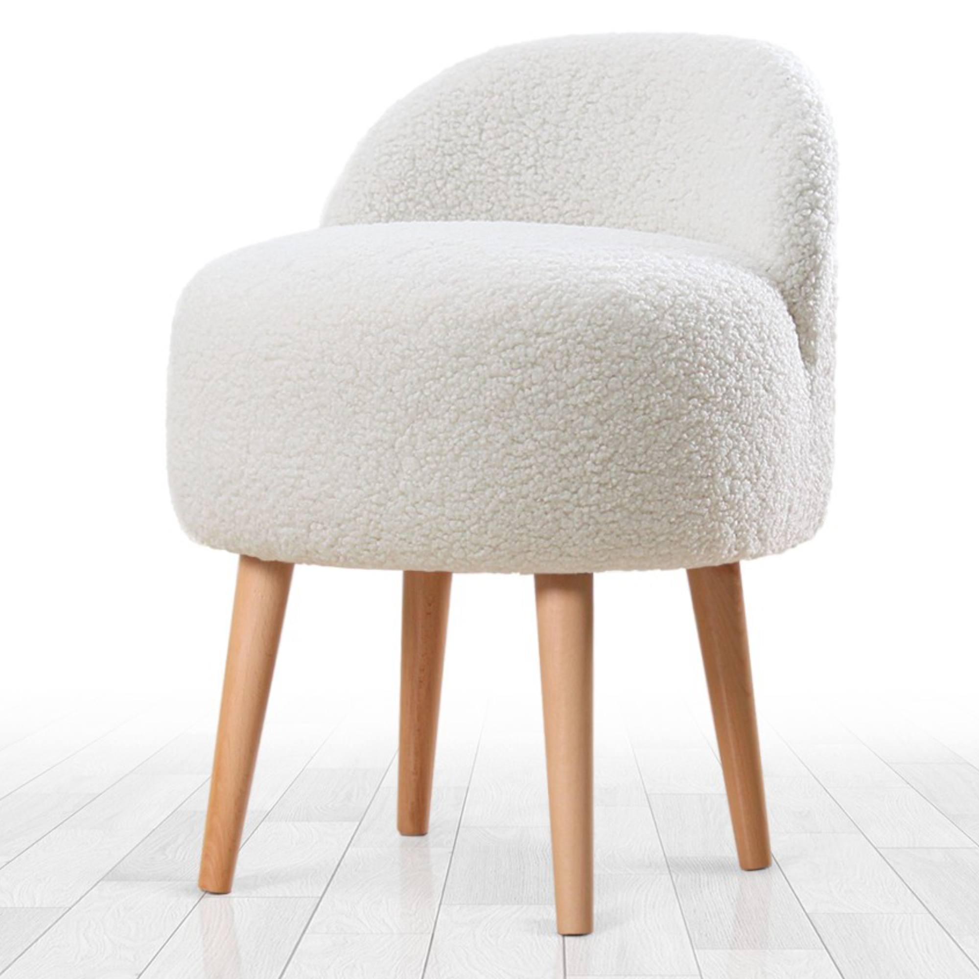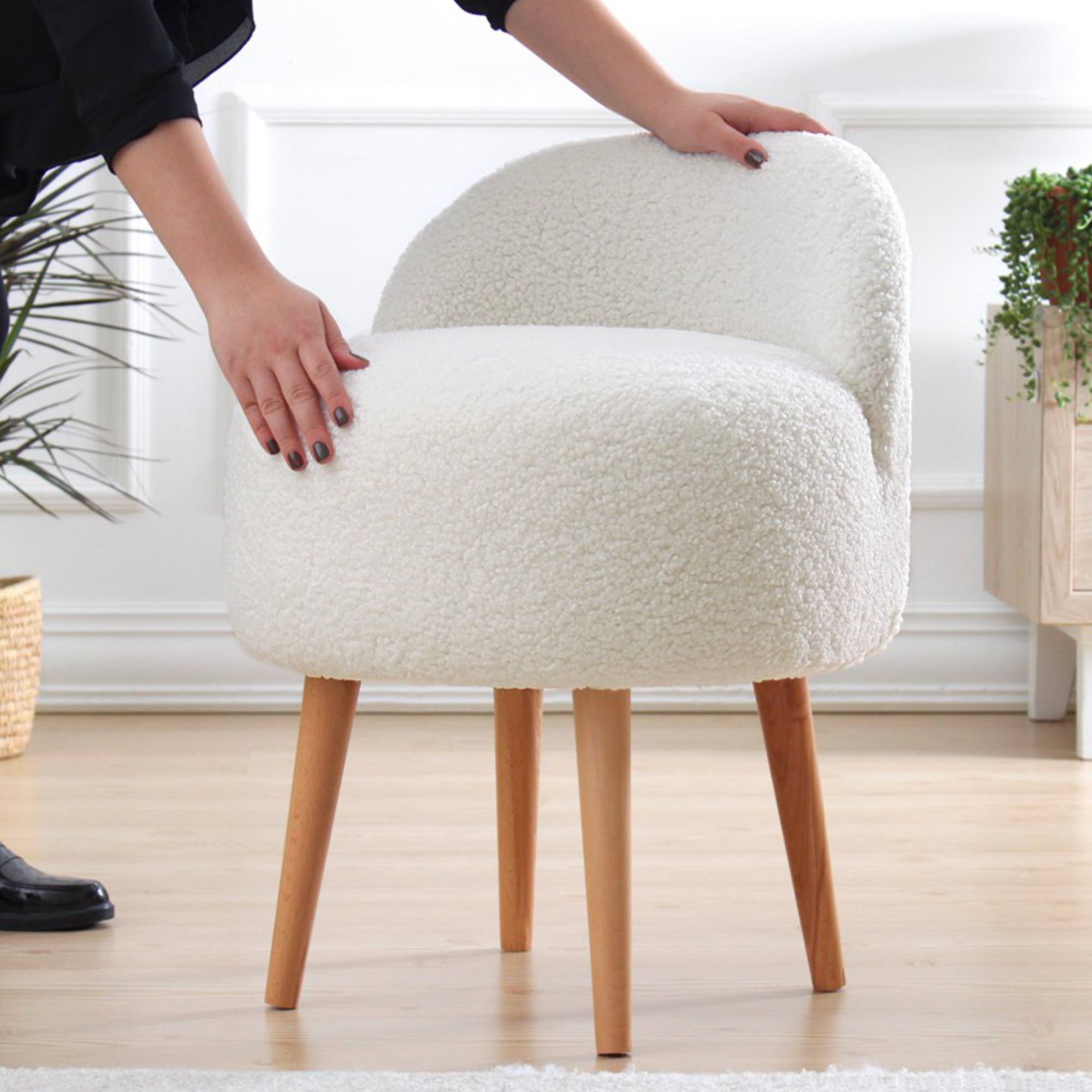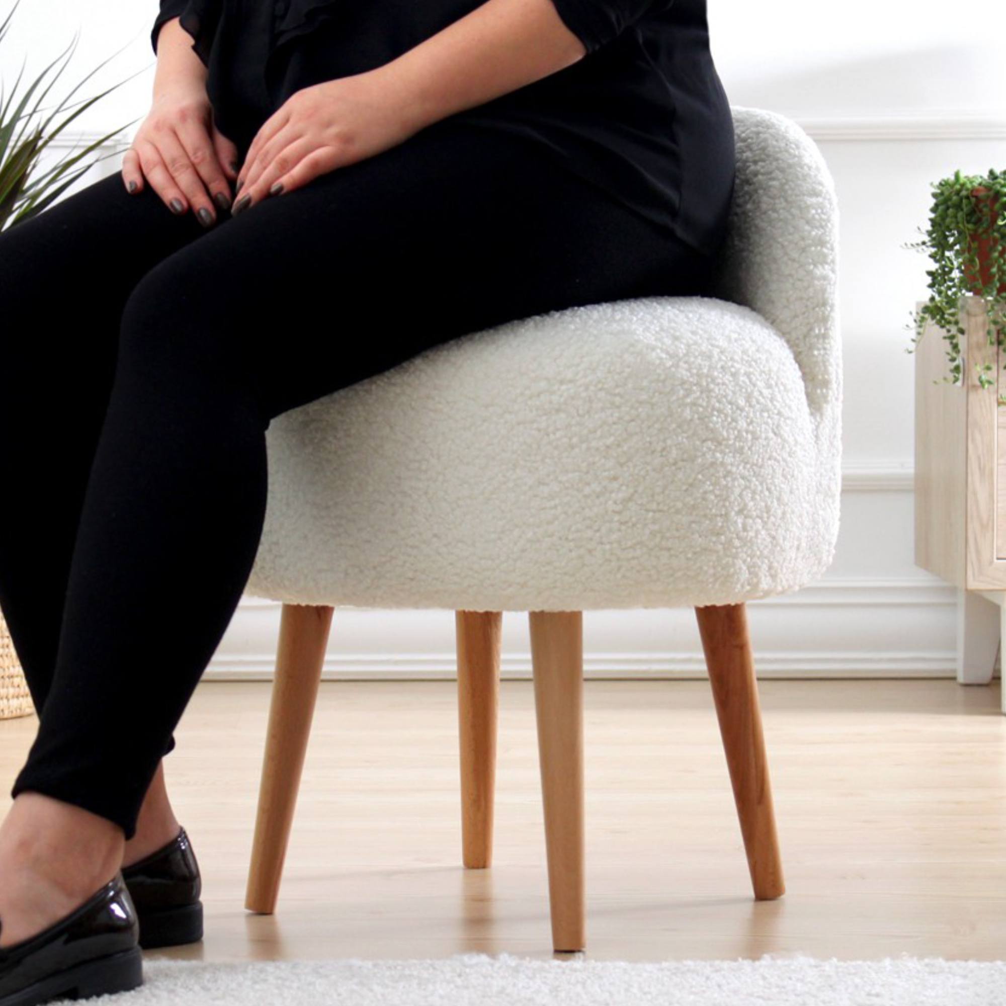 Čalúnenie je zo 100% umelej kožušiny, ktorá je príjemná na dotyk. Nohy sú vyrobené z masívneho dreva a dodávajú taburetu na stabilite.