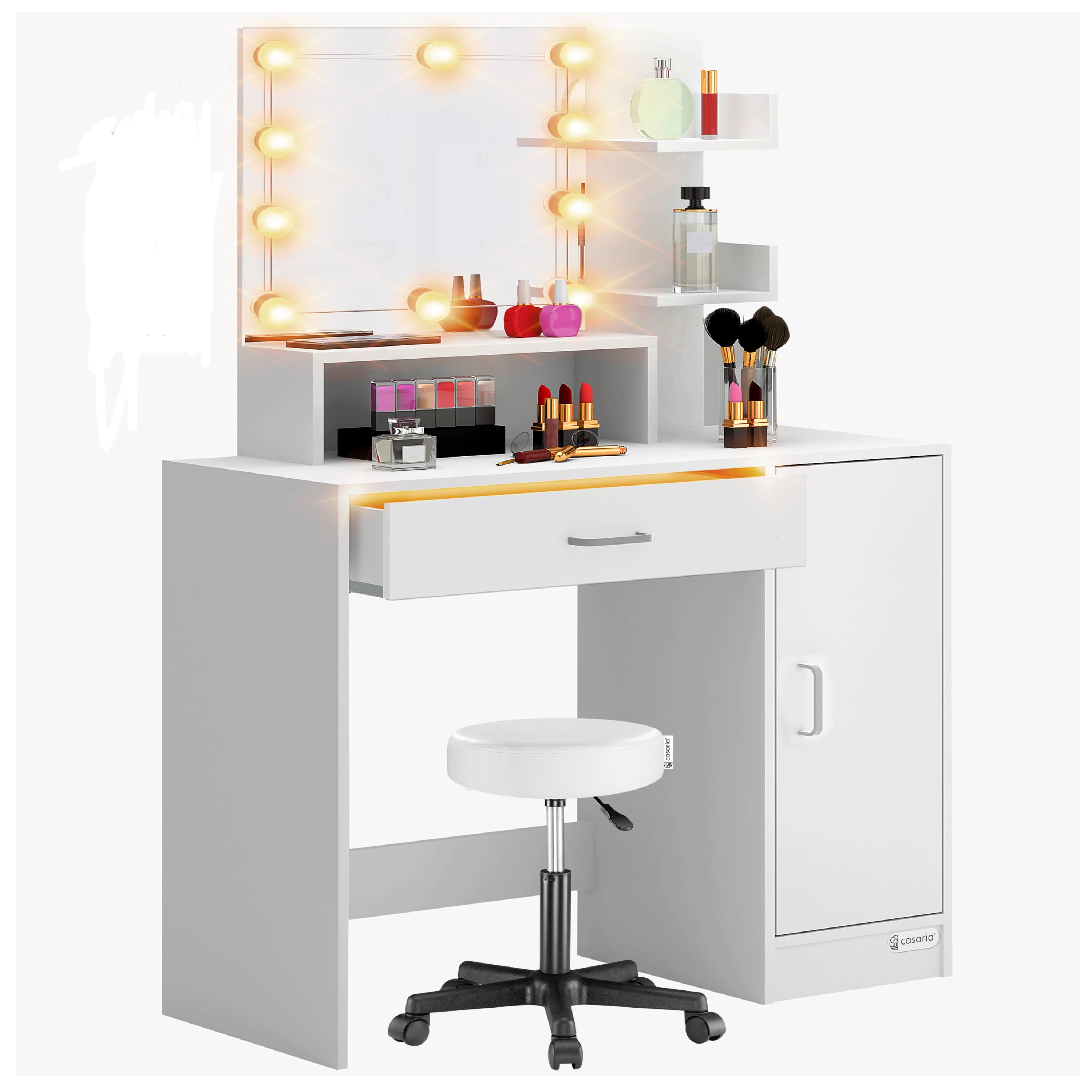 Obsahuje sofistikované osvetlenie, ktoré sa zapína a vypína pomocou senzora. Hladko sa pohybujúce kovové koľajnice umožňujú jednoduché otváranie zásuvky. Veľké zrkadlo má 2 ďalšie police a 1 úložnú priehradku na vystavenie stylingových produktov alebo parfémov.