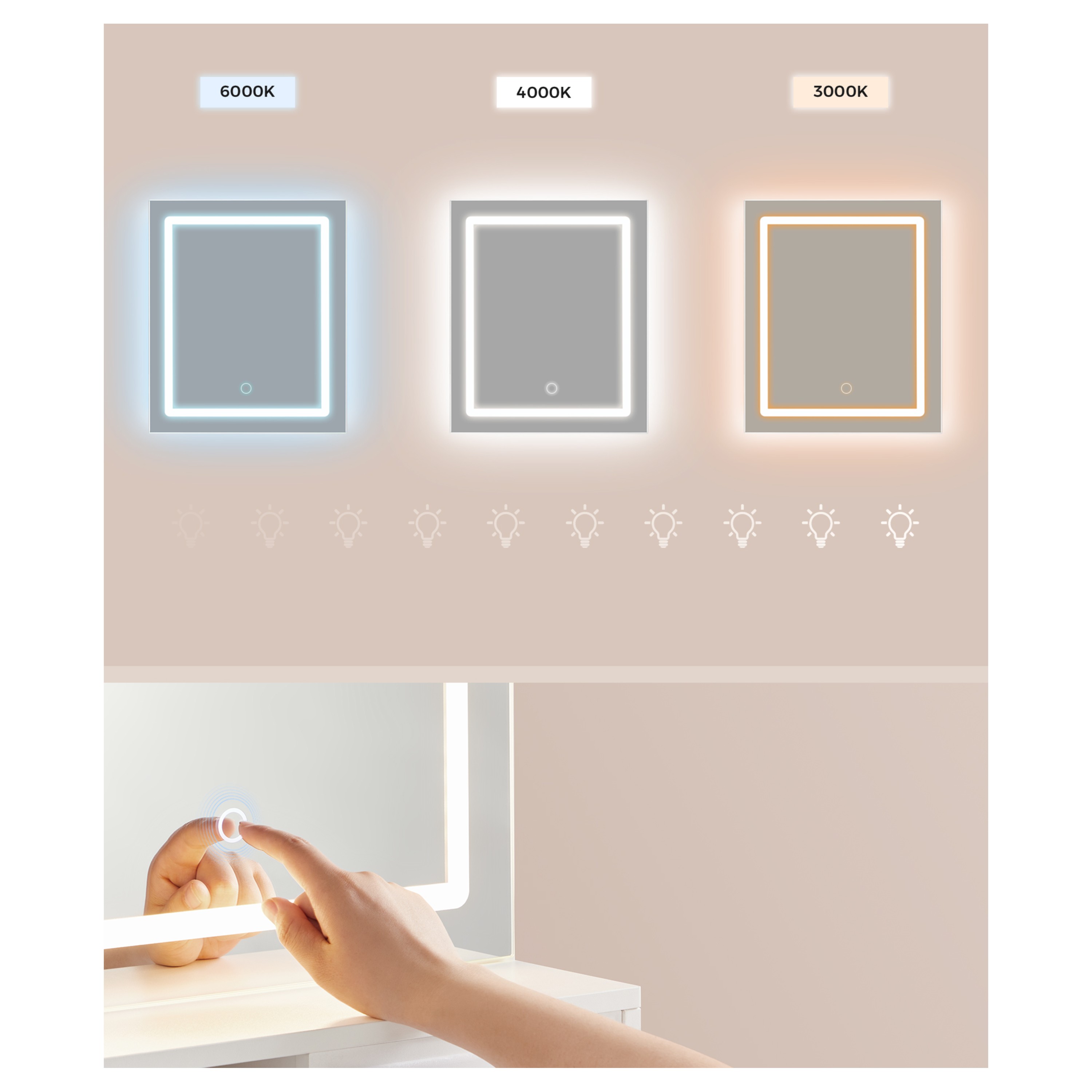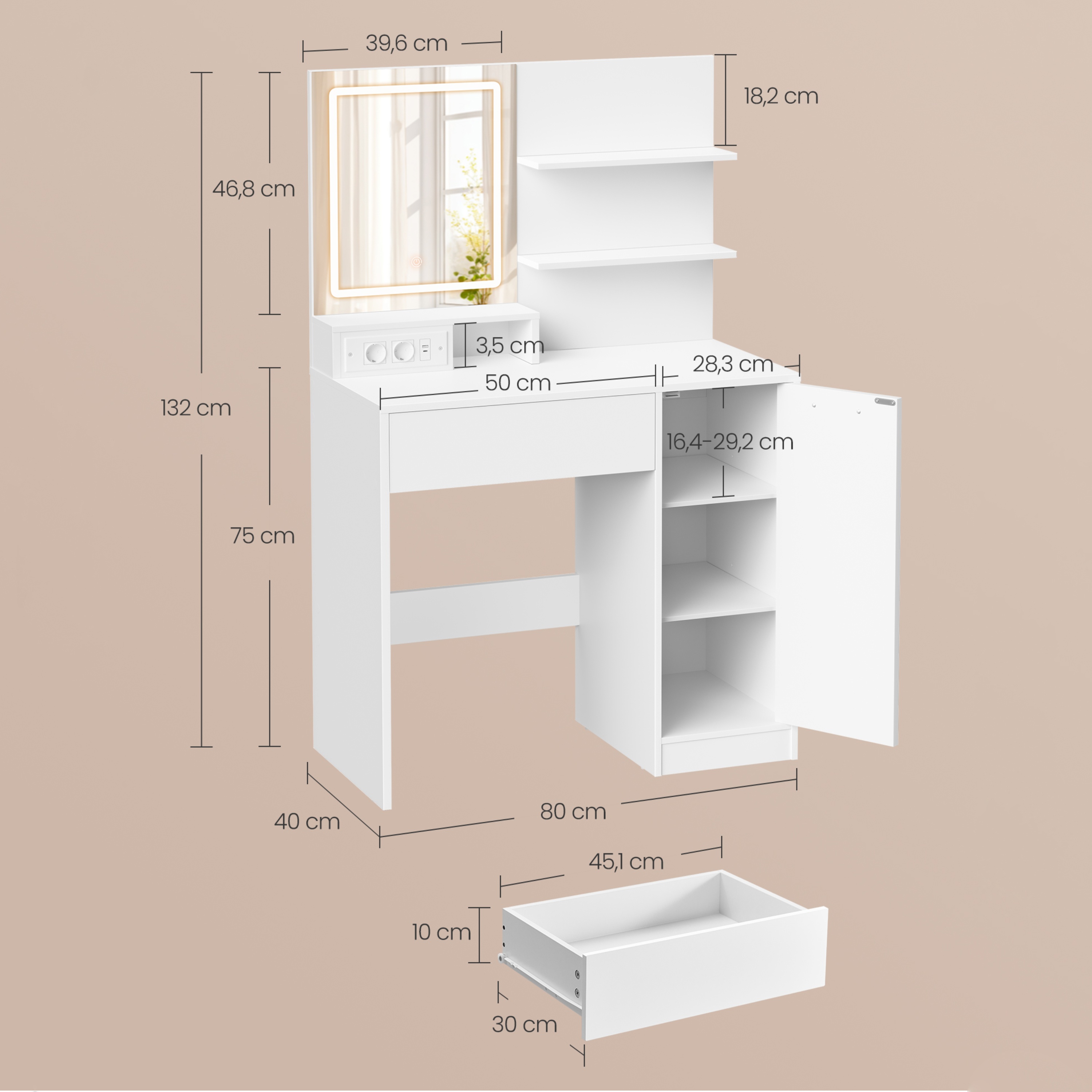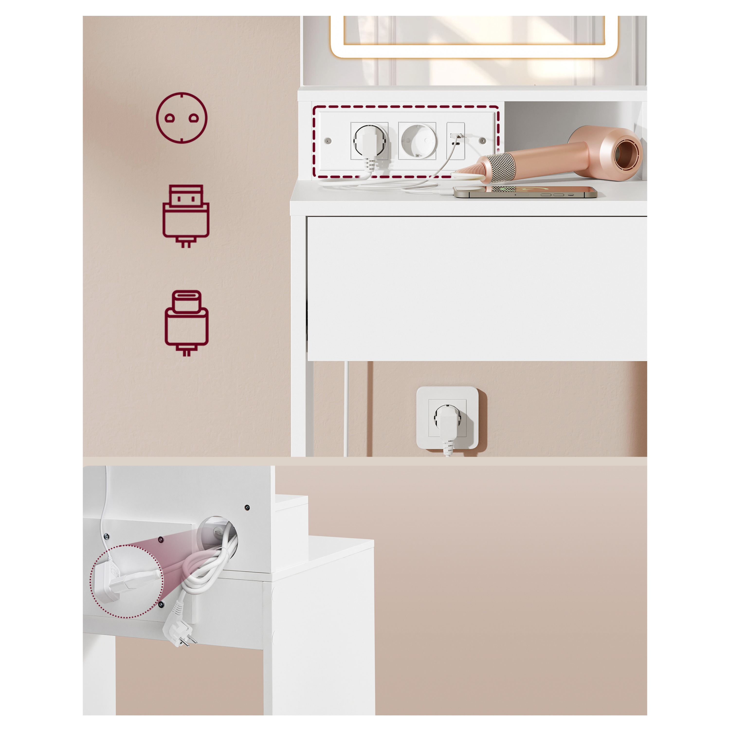 Disponuje praktickým zrkadlom, ktoré je vybavené integrovaným LED svetelným zdrojom. Ovláda sa jednoducho pomocou dotykového tlačidla priamo na zrkadle. Osvetlenie si prispôsobíte podľa potreby vďaka voliteľnej teplote svetla 3000, 4000 a 6000 Kelvinov a funkcii stmievania. Pod zrkadlom nájdete 2x klasickú zásuvku, 1x USB-A port a 1x USB-C port. Vďaka tomu ponúka možnosť nabíjania vašich zariadení a zároveň využitie spotrebičov, ako sú fén či kulma na vlasy.