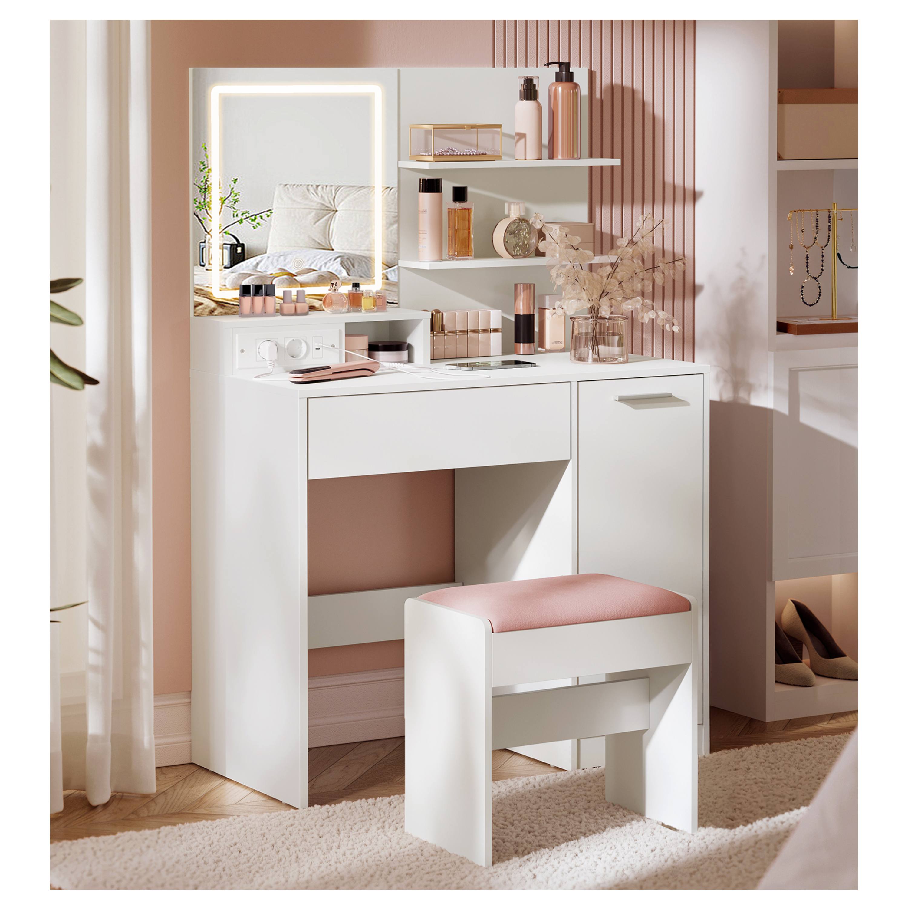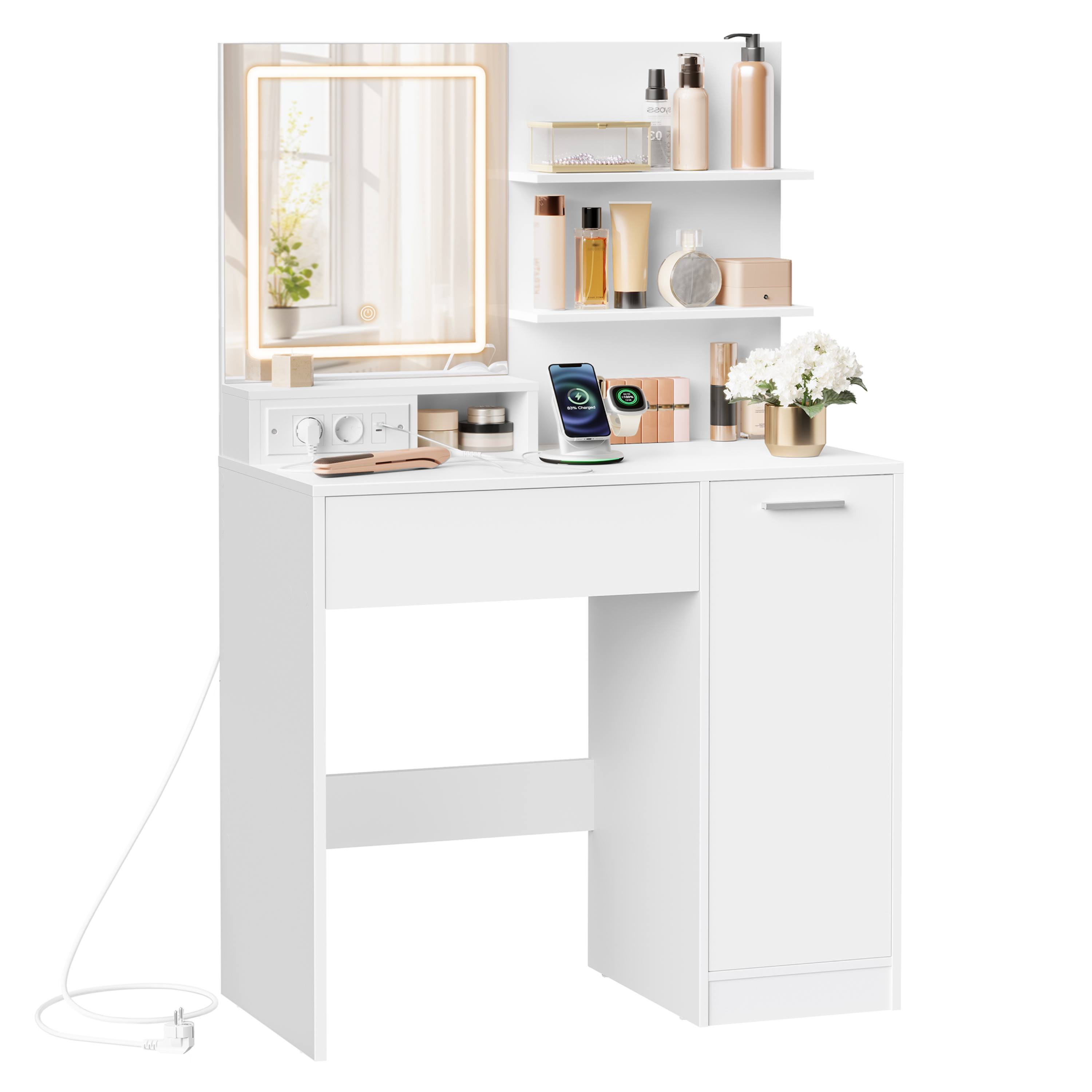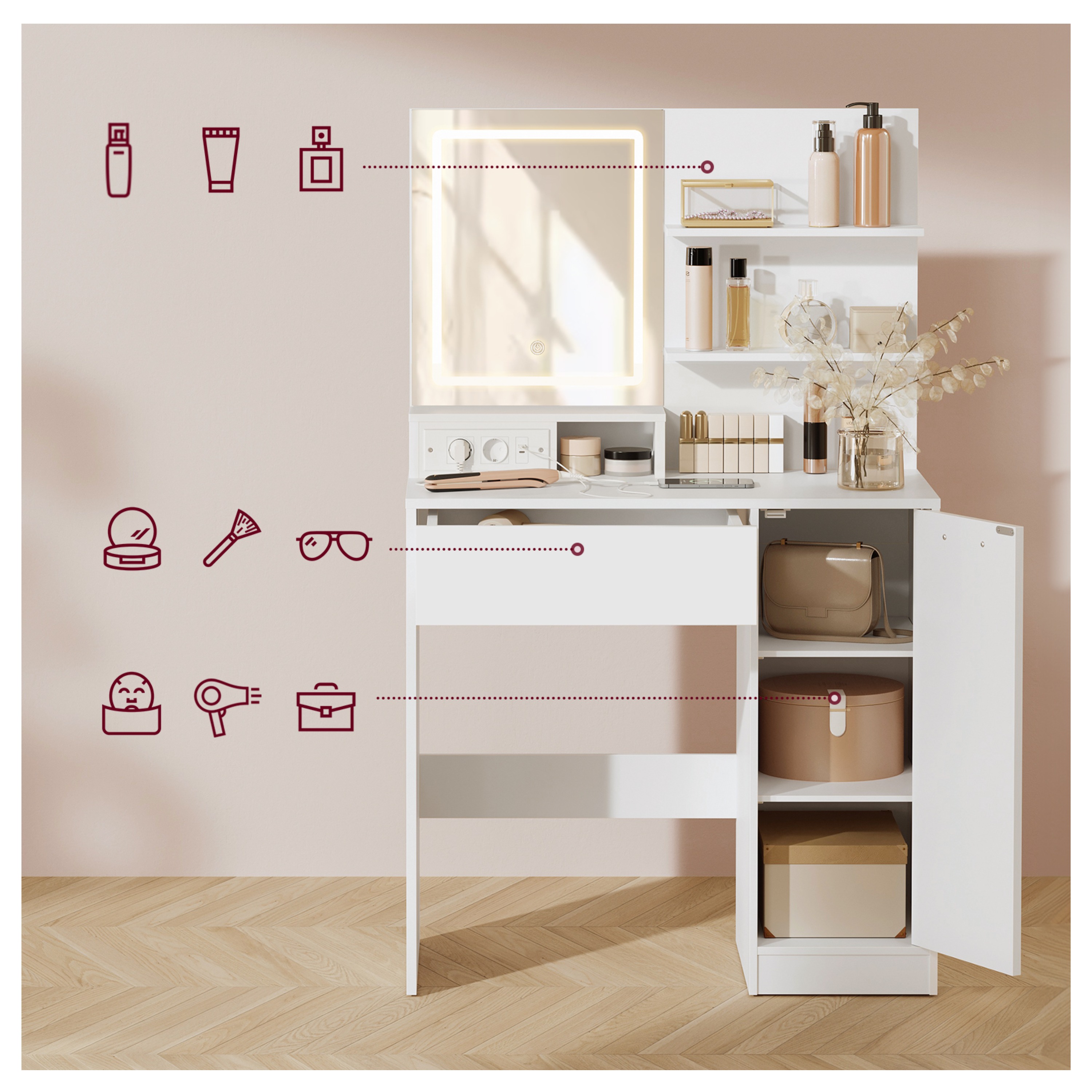 Stolík je vybavený bohatým úložným priestorom na všetko potrebné. Vedľa zrkadla sú k dispozícii 2 police na vystavenie obľúbených či najčastejšie používaných produktov. V spodnej časti stolíka je 1 zásuvka a 2 ďalšie police za otočnými dvierkami na uloženie ďalších doplnkov.