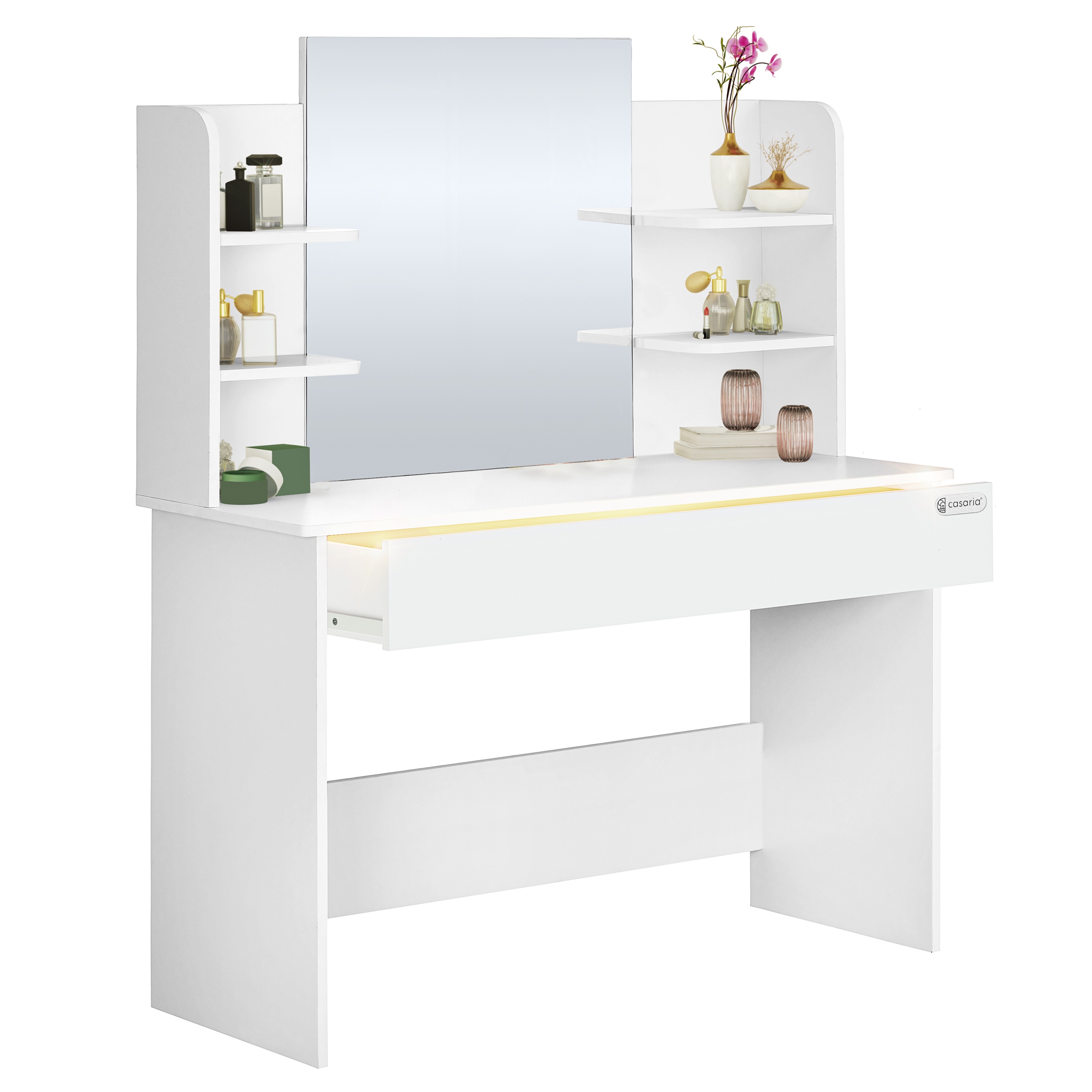 Dominantným prvkom stolíka je priestranné zrkadlo, ktoré vám uľahčí každodennú rannú aj večernú rutinu. To je doplnené o 4 otvorené poličky na prehľadné uloženie kozmetiky a doplnkov. Veľkou prednosťou tohto stolíka je praktická zásuvka s 3 priehradkami a integrovaným podsvietením, ktoré sa automaticky aktivuje pri otvorení a zhasne po zatvorení. Stolík je možné pre väčšiu stabilitu pripevniť k stene. Stolík je vyrobený z MDF materiálu s povrchom nenáročným na údržbu.