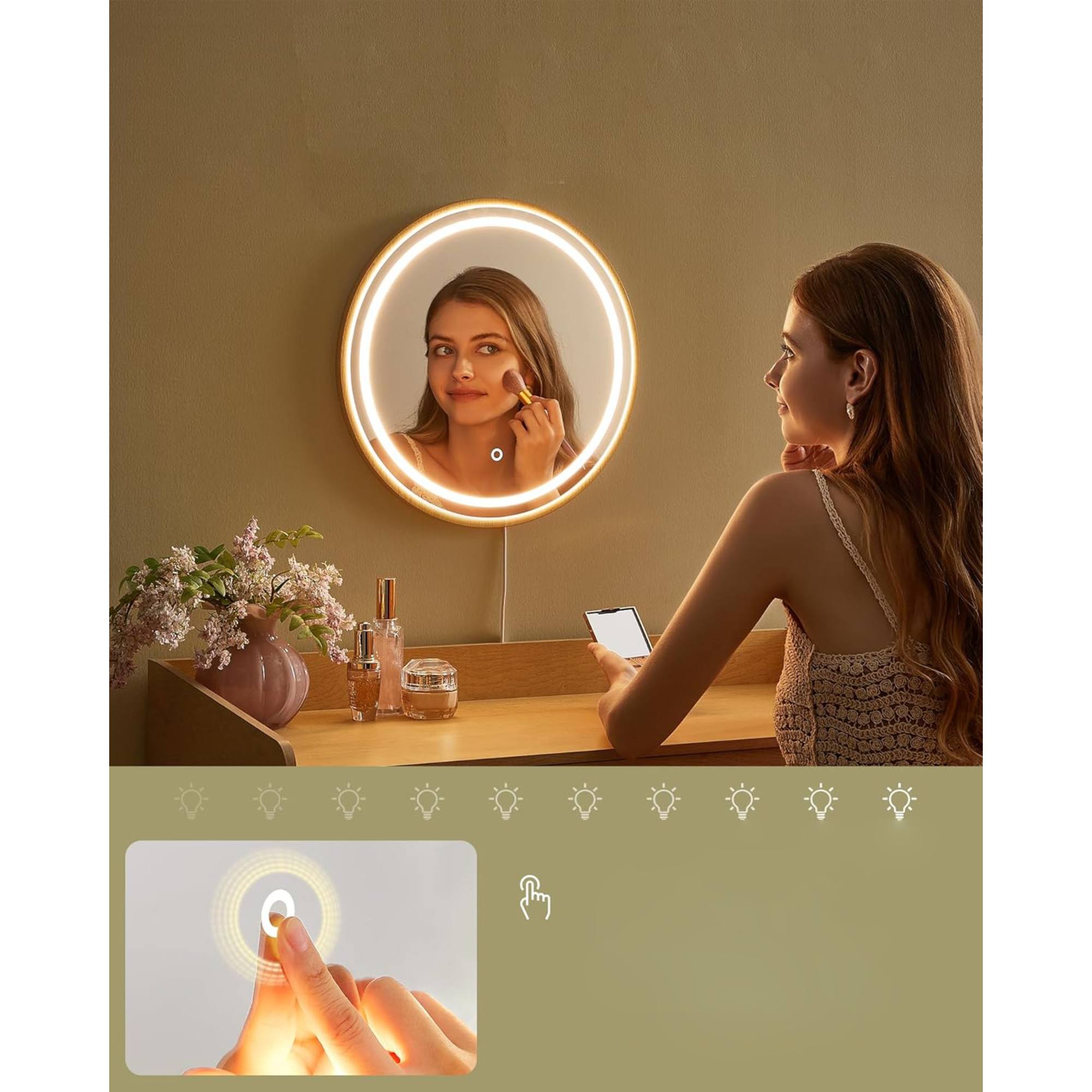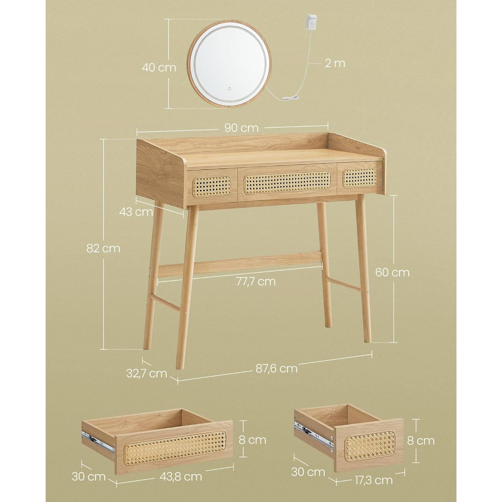 Stolík má hlavnú dosku a 3 priestranné zásuvky, ktoré dokonale uložia váš make-up, produkty starostlivosti o pleť aj doplnky. Všetko tak budete mať ľahko prístupné. Stolík je dodávaný aj s praktickým zrkadlom s osvetlením, ktoré umožňuje upraviť jas a prepínať medzi prirodzeným a teplým svetlom.