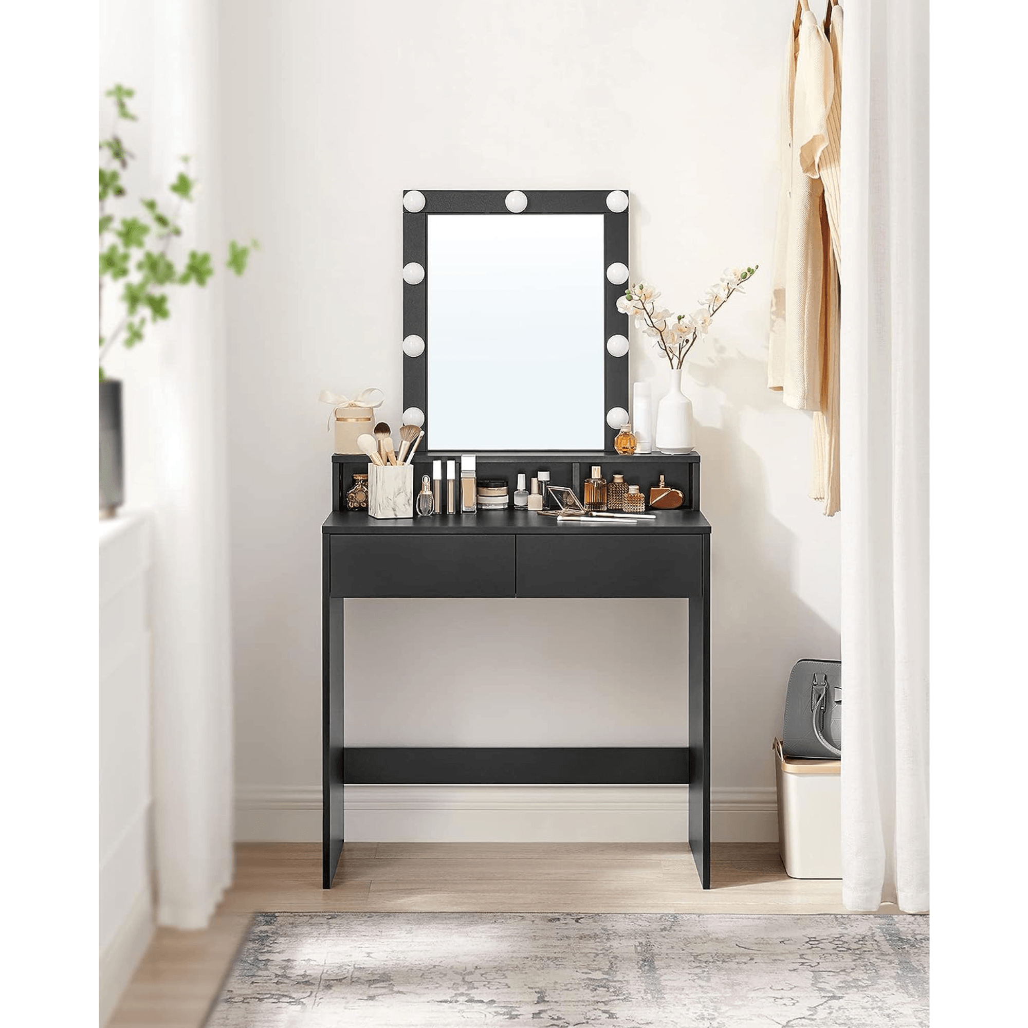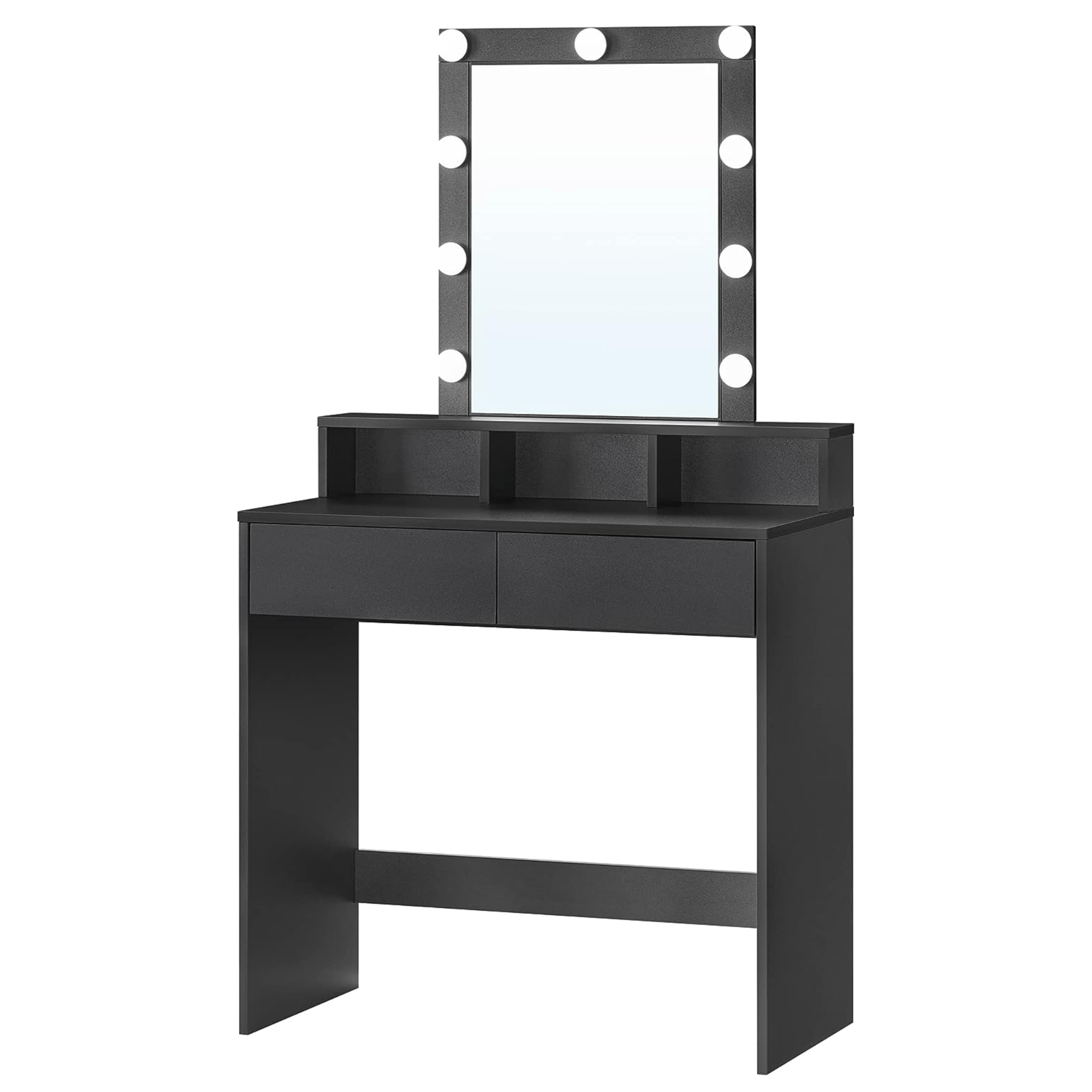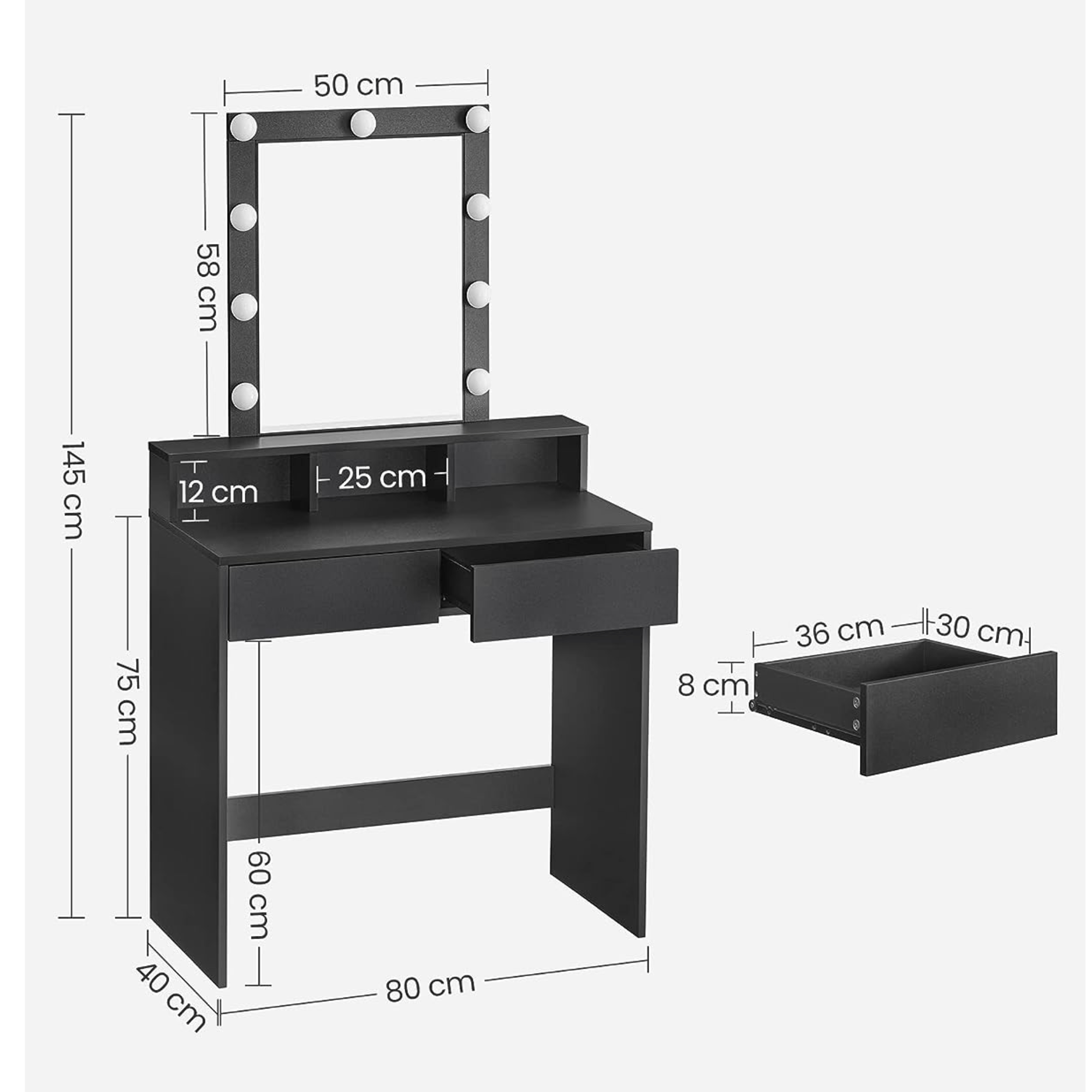 Veľké zrkadlo pred vami nič neutají a pomôže obnoviť váš pôvab. Bohatý úložný priestor v podobe hlavnej dosky, dvoch zásuviek a jednej poličky pod zrkadlom poskytne miesto na všetky veci potrebné na skrášlenie, už nikdy tak nebudete musieť hľadať pomôcky naprieč domácnosťou. Vyrobený je z laminovaných drevotrieskových dosiek, pre ktoré je typická ľahká udržiavateľnosť aj dlhá životnosť. Disponuje navyše osvetlením v podobe deviatich LED žiaroviek s nastaviteľnou intenzitou.