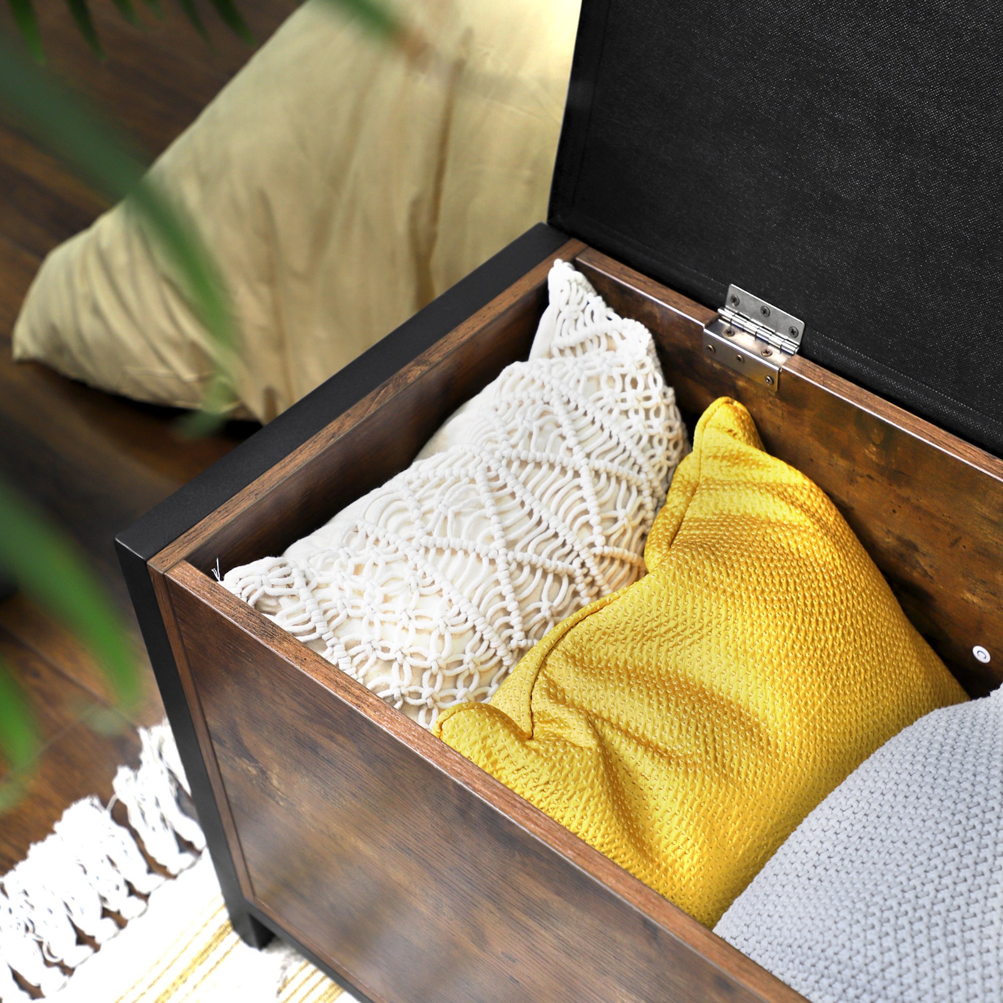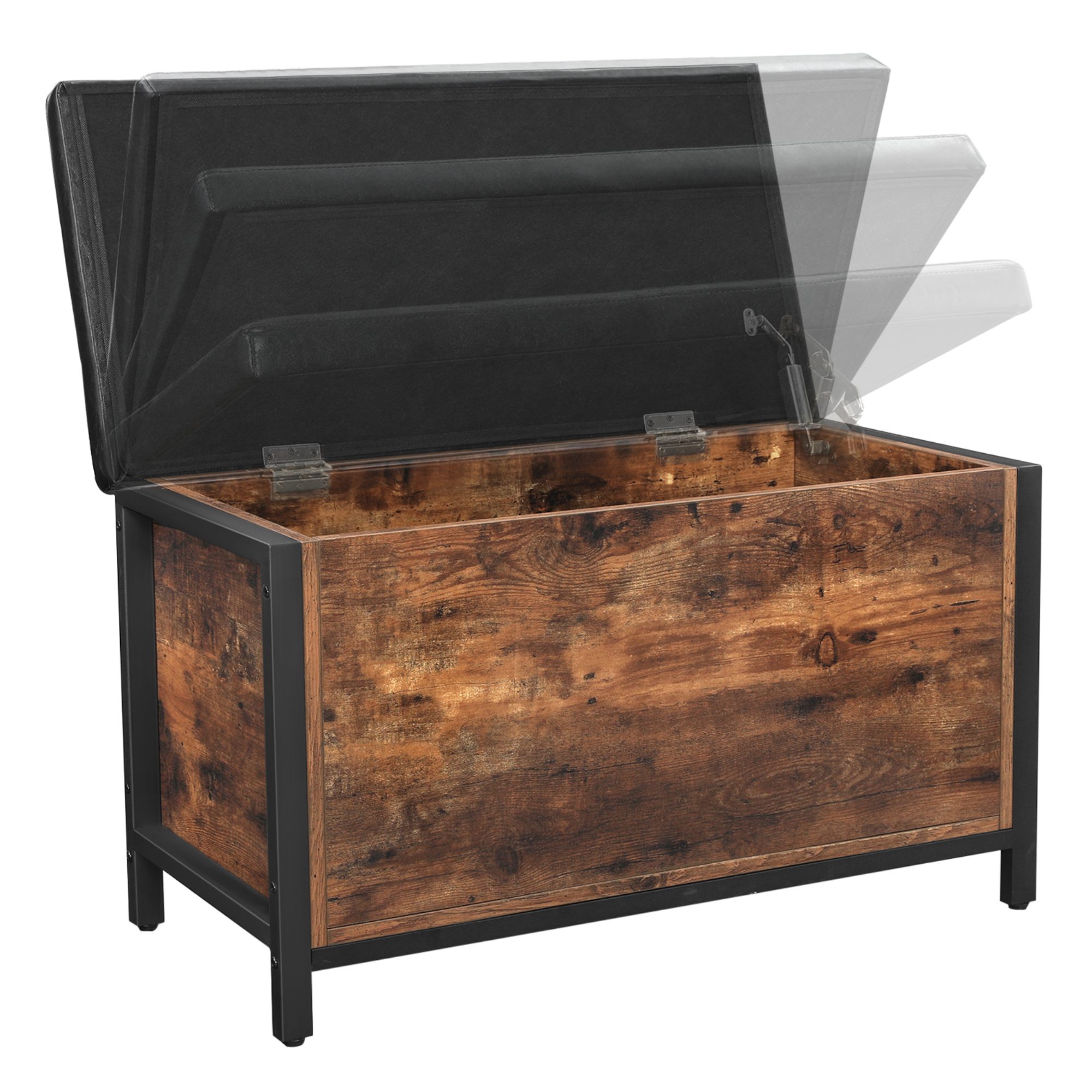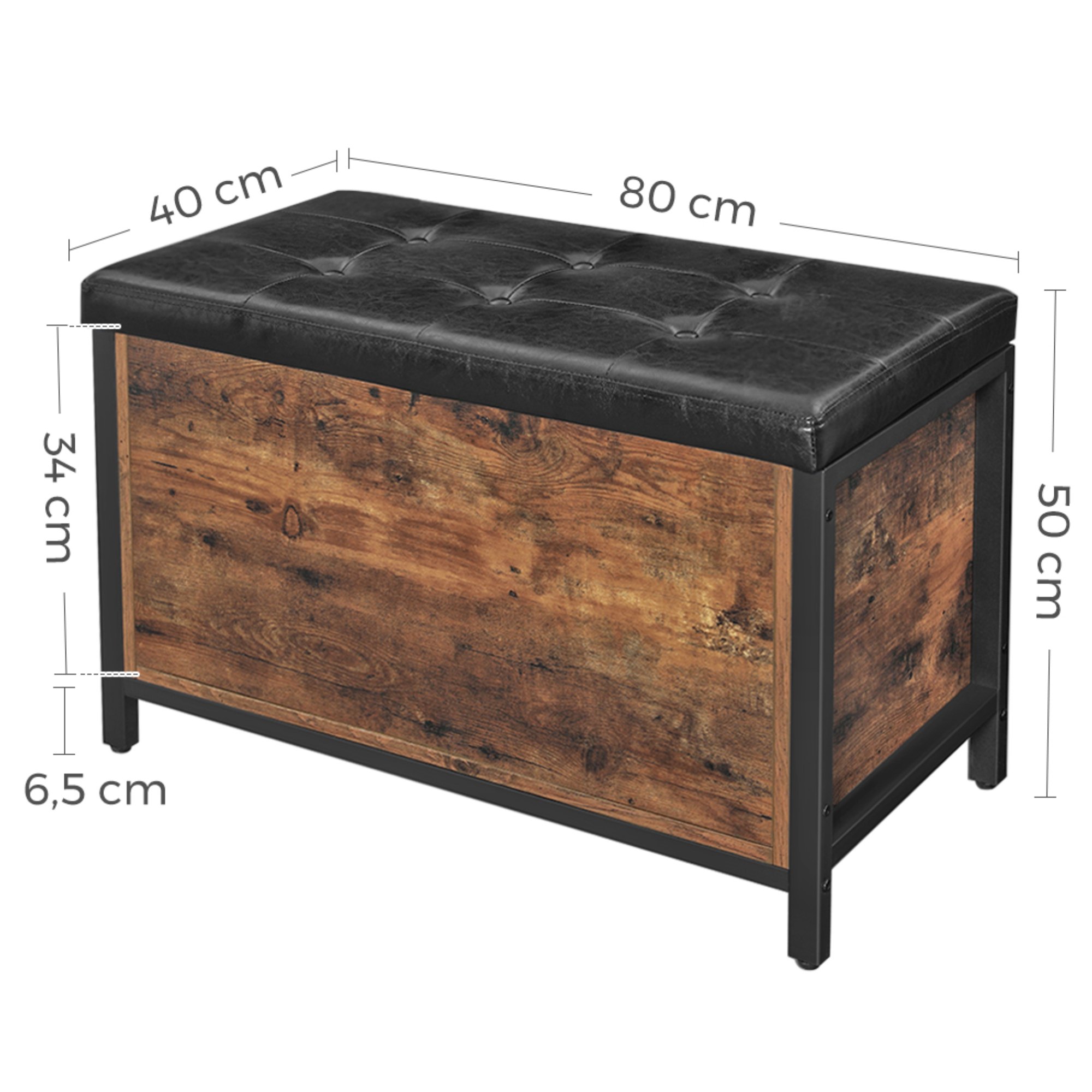 Truhla FREN v industriálnom vyhotovení ponúka univerzálne riešenie do vášho interiéru. Kombinácia čiernej kovovej konštrukcie s rustikálnou hnedou farbou vytvára príjemnú a živú atmosféru v celej miestnosti. Na odloženie všetkého potrebného je tu uzatvárateľný úložný priestor s nosnosťou až 20 kg. Ten je chránený vekom, ktorého povrch je potiahnutý syntetickou kožou s vnútrom vyplneným PU penou. Vďaka namontovanému vnútornému piestu sa s vekom jednoducho manipuluje. Nosnosť konštrukcie je až 90 kg, takže truhlu môžete využiť aj na čiastočné sedenie.