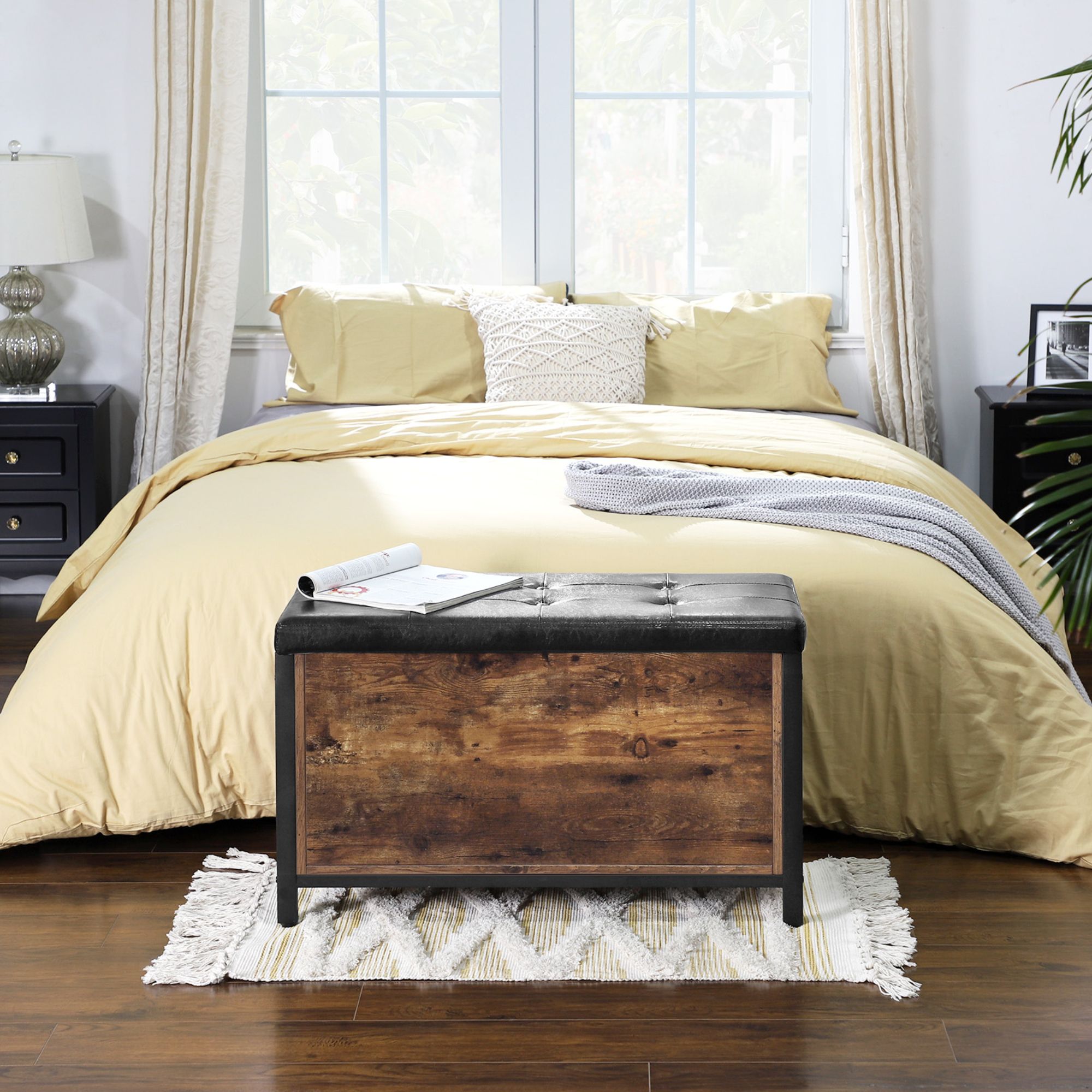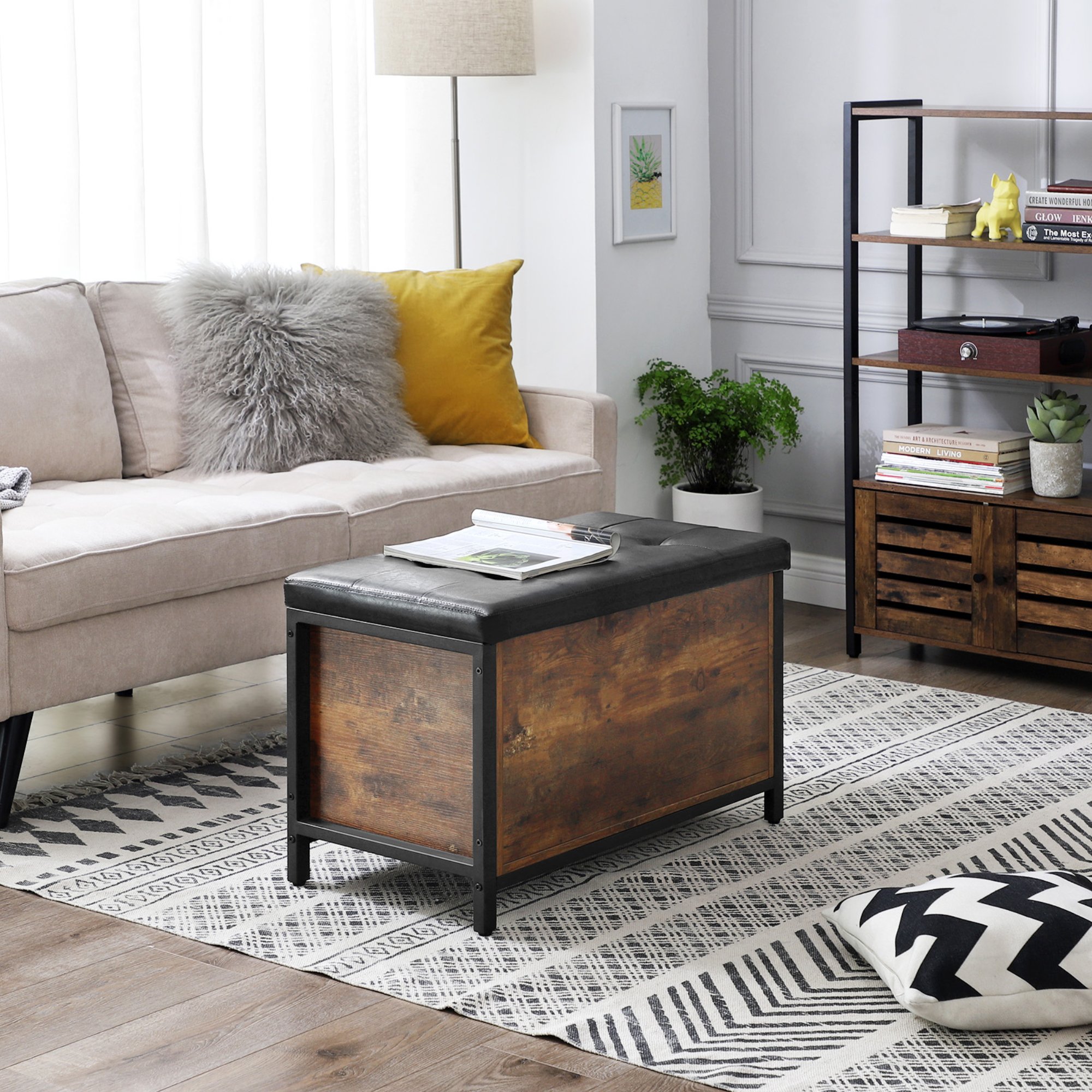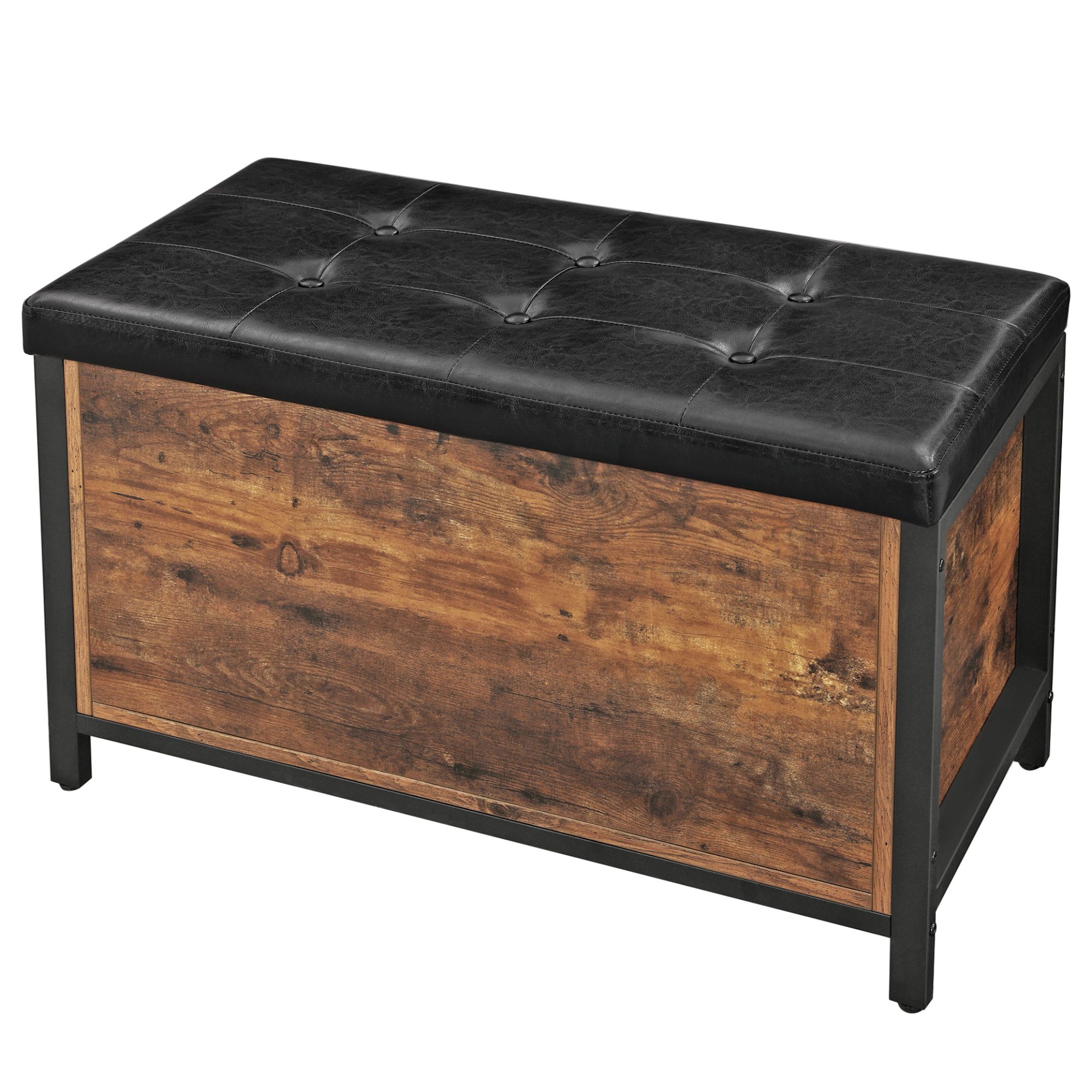 Truhla FREN v industriálnom vyhotovení ponúka univerzálne riešenie do vášho interiéru. Kombinácia čiernej kovovej konštrukcie s rustikálnou hnedou farbou vytvára príjemnú a živú atmosféru v celej miestnosti. Na odloženie všetkého potrebného je tu uzatvárateľný úložný priestor s nosnosťou až 20 kg. Ten je chránený vekom, ktorého povrch je potiahnutý syntetickou kožou s vnútrom vyplneným PU penou. Vďaka namontovanému vnútornému piestu sa s vekom jednoducho manipuluje. Nosnosť konštrukcie je až 90 kg, takže truhlu môžete využiť aj na čiastočné sedenie.