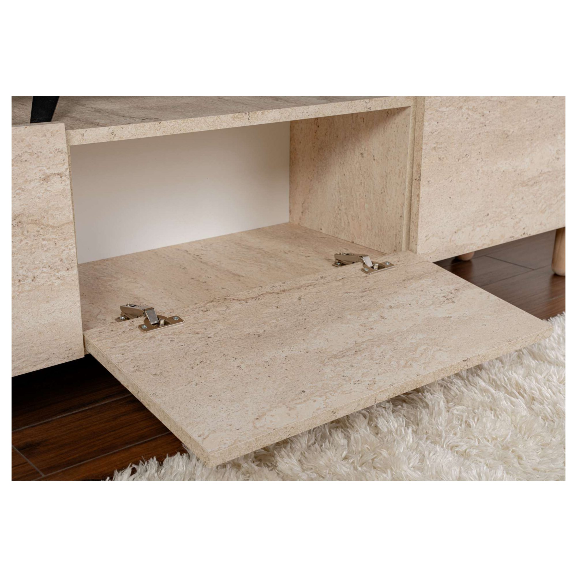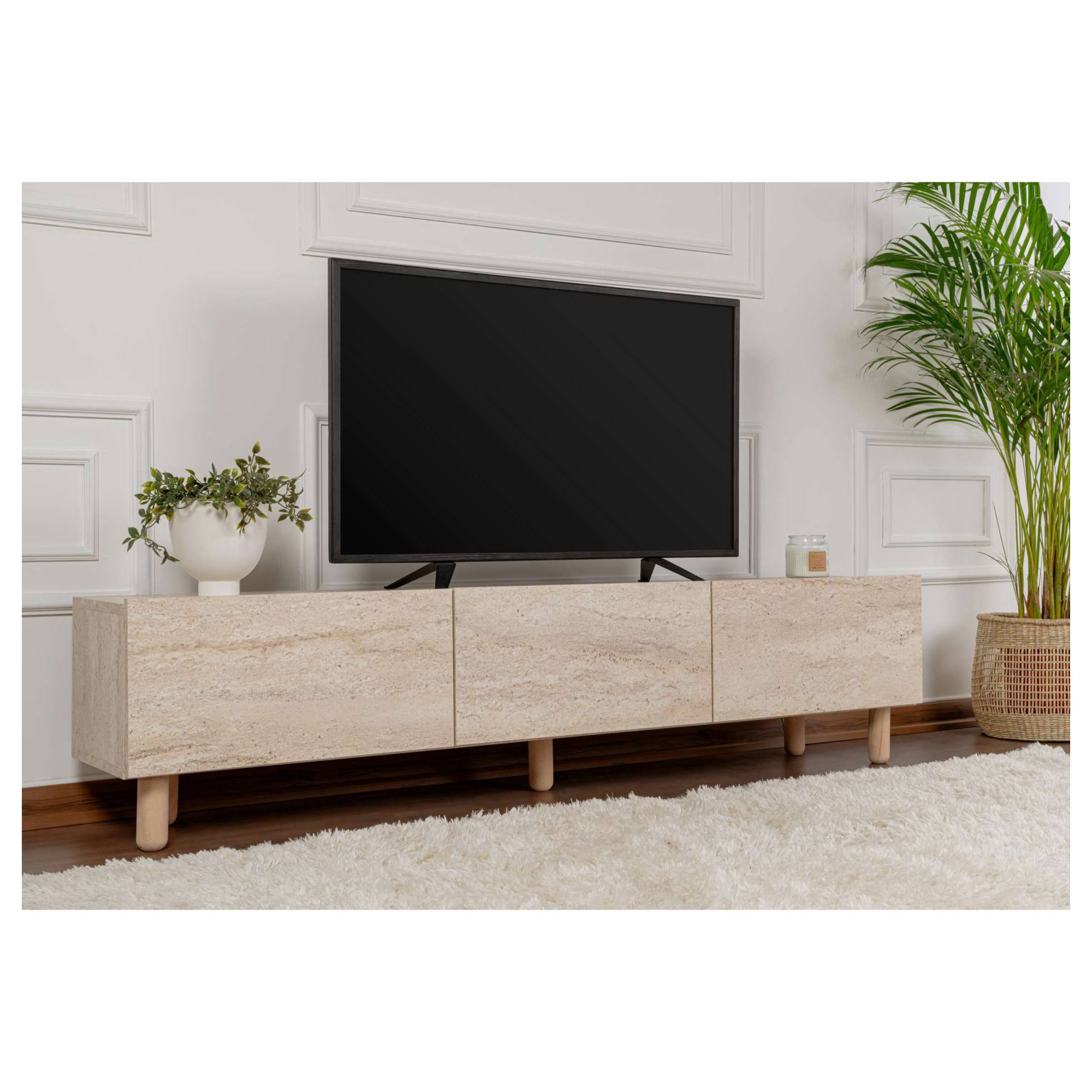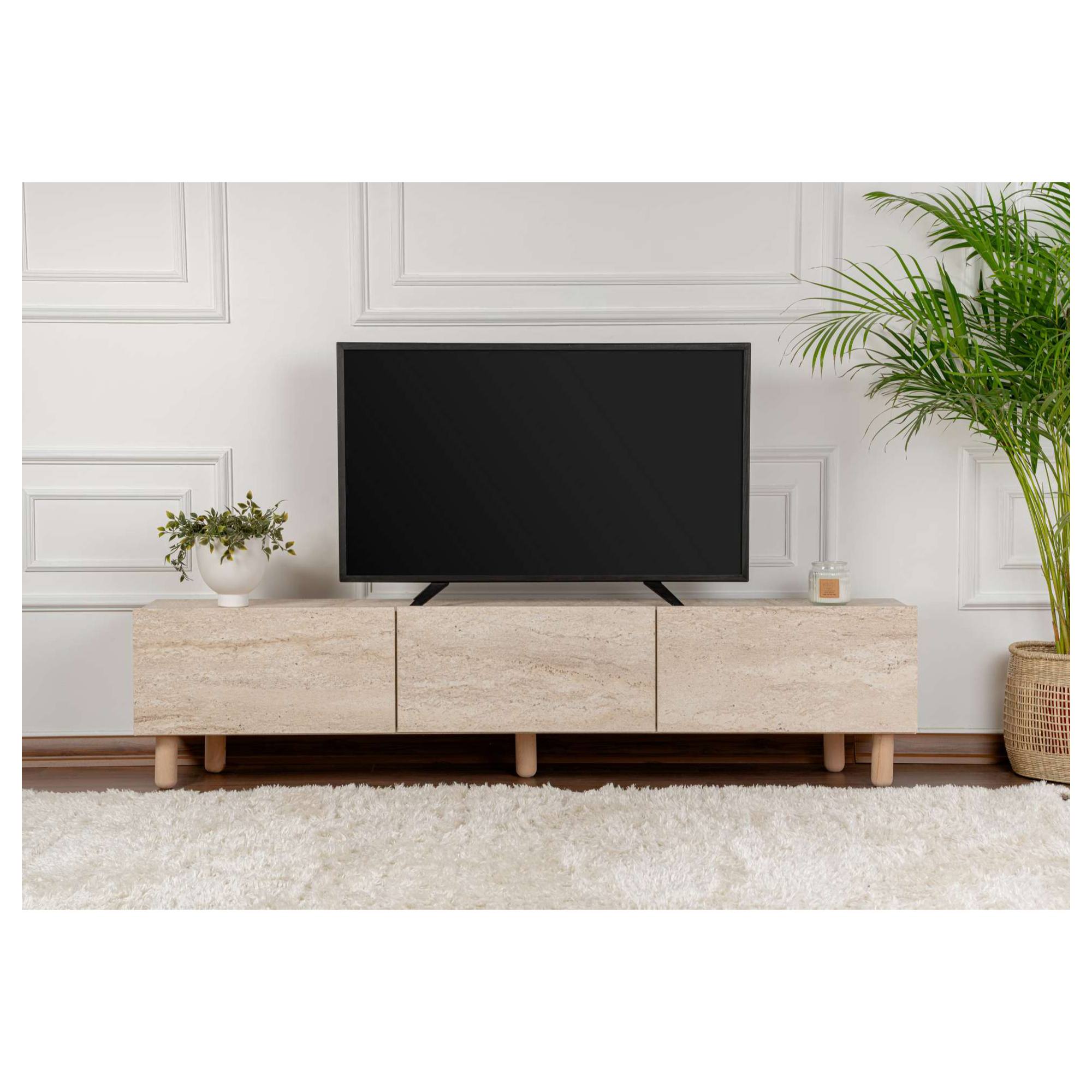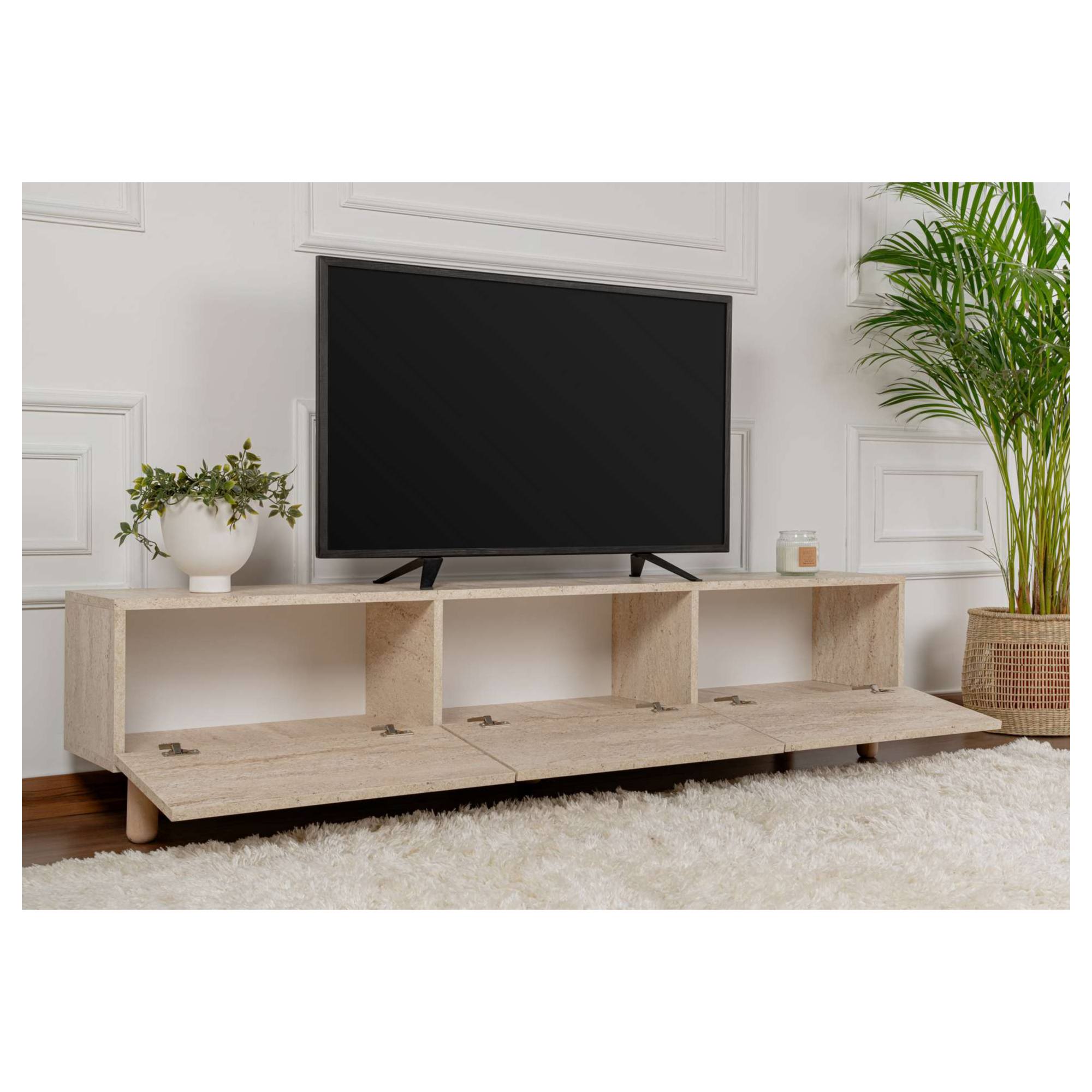 Disponuje 3 výklopnými dvierkami, ktoré odkrývajú 3 oddelené úložné priestory. Tie vytvárajú dostatok miesta na odloženie všetkého, čo potrebujete mať poruke. Vrchná doska so šírkou 180 cm ponúka priestor pre televízor, elektroniku či dekorácie. Prevedenie bez úchytiek podčiarkuje čistý vzhľad komody, zatiaľ čo dekor travertínu dodáva dizajnu osobitý charakter.