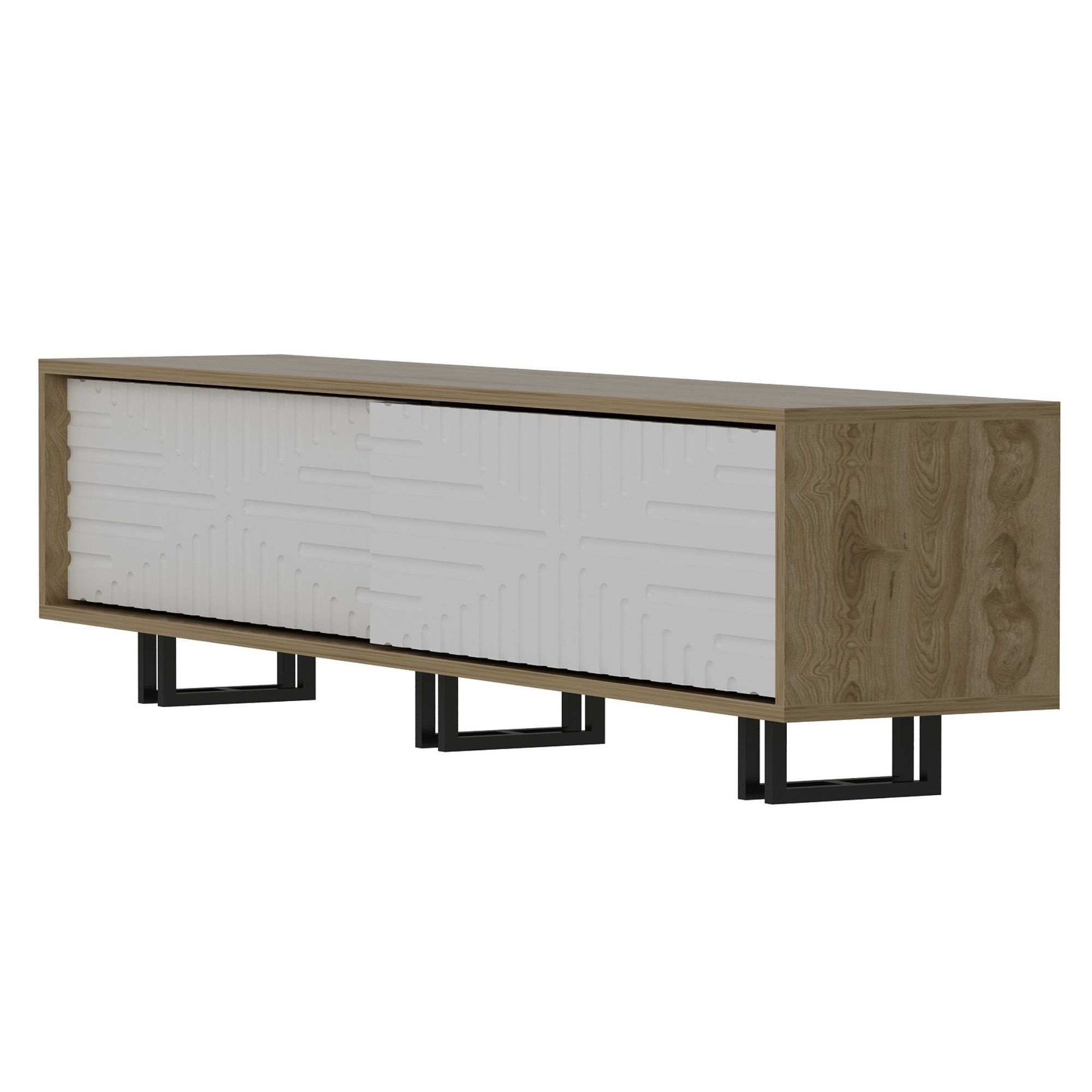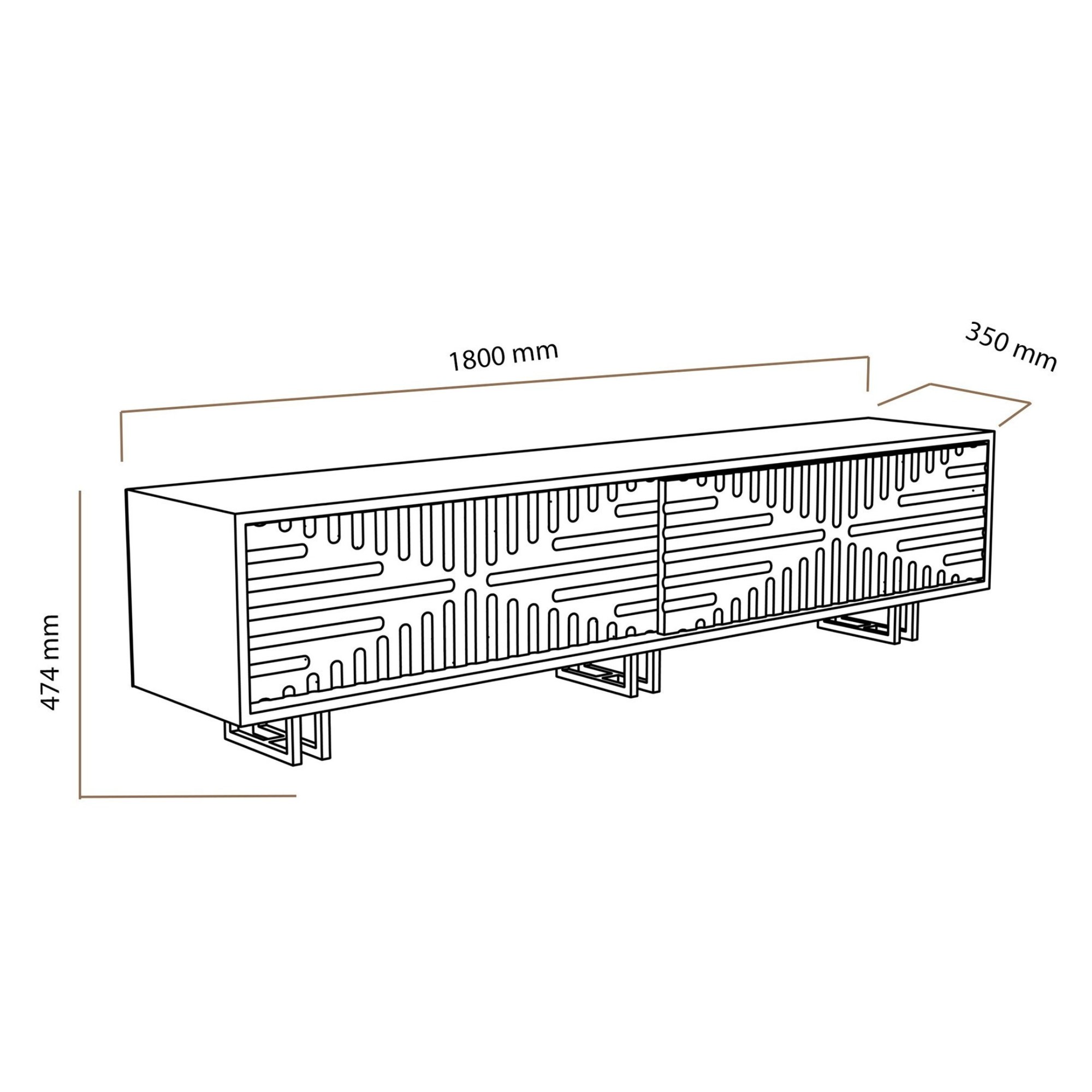 Disponuje 2 posuvnými dvierkami, ktoré odkrývajú veľký úložný priestor. Ten ponúka dostatok miesta na odloženie všetkého, čo potrebujete mať poruke. Vrchná doska so šírkou 180 cm ponúka priestor pre televízor, ovládače aj dekorácie. Dvierka sú doplnené zaujímavým dizajnom, ktorý oživuje inak jednoduchý vzhľad. Vďaka prevedeniu bez úchytiek dizajn pekne vyniká.