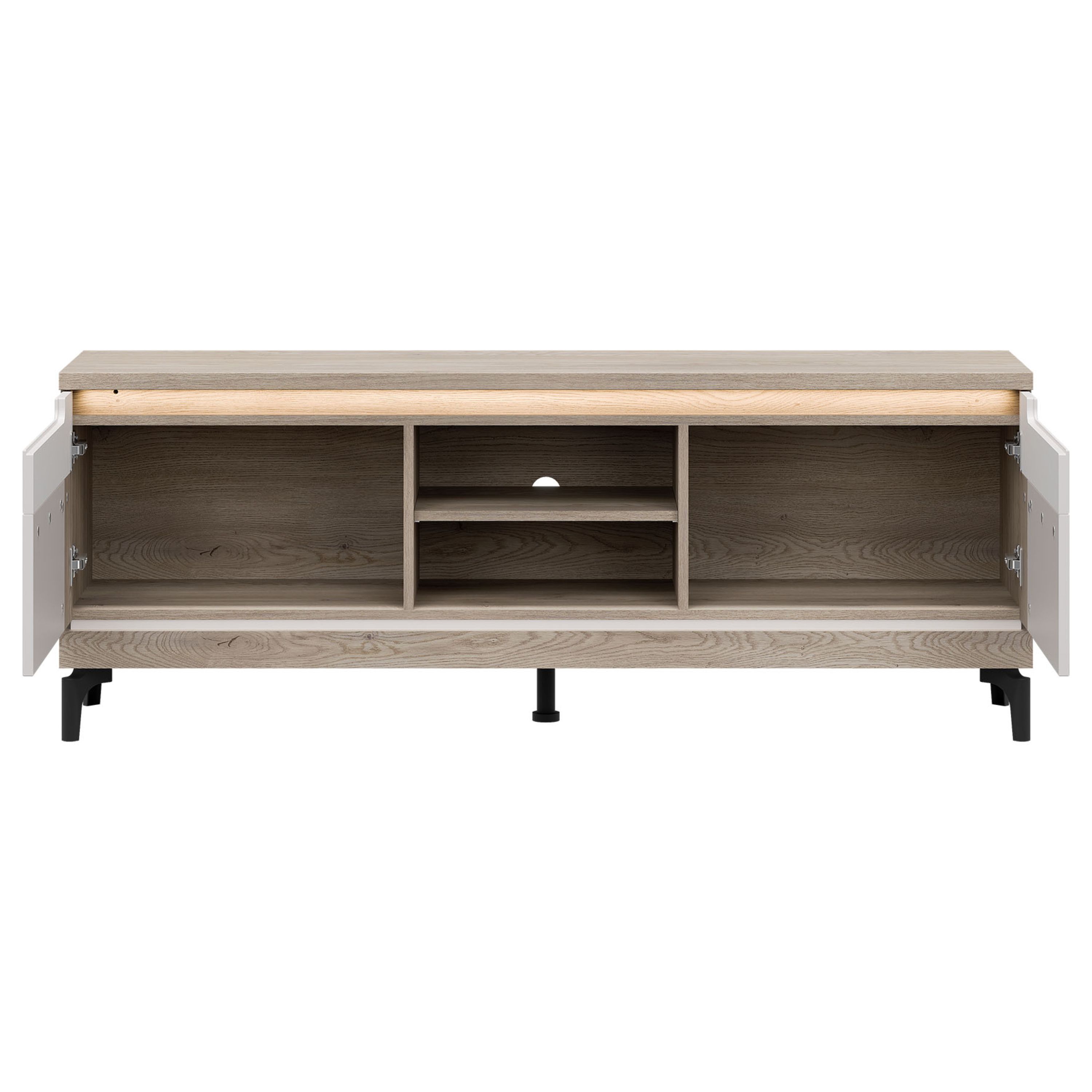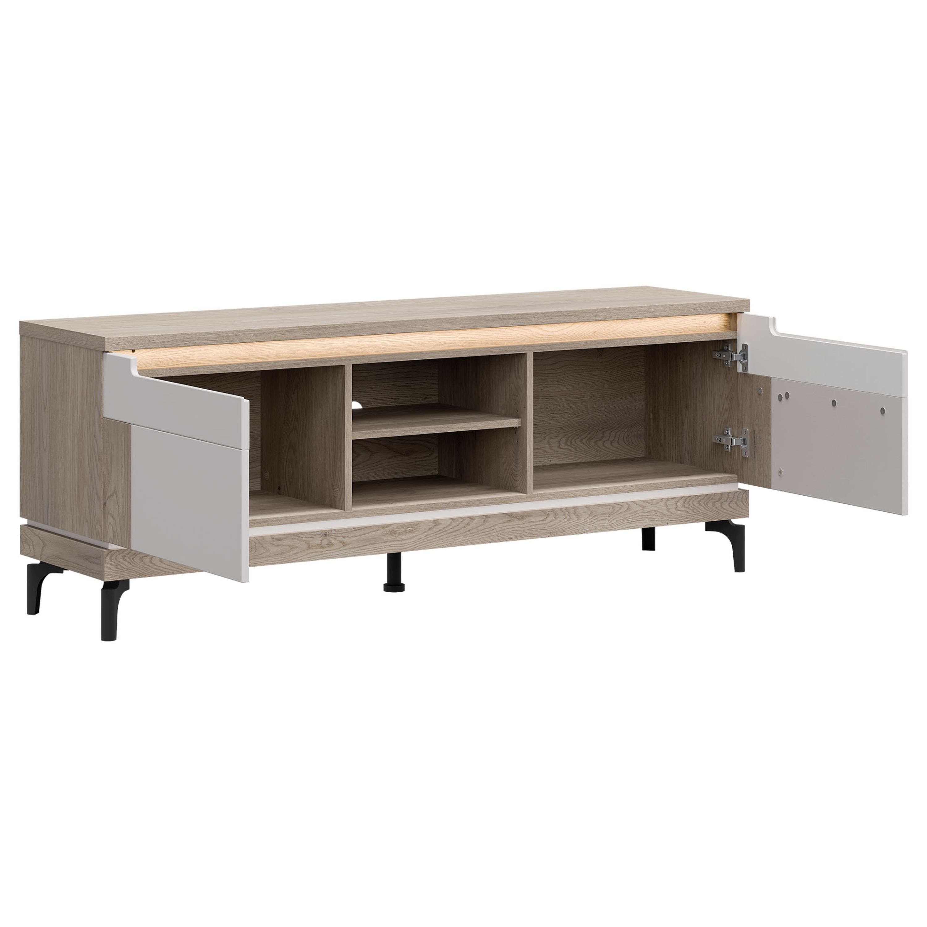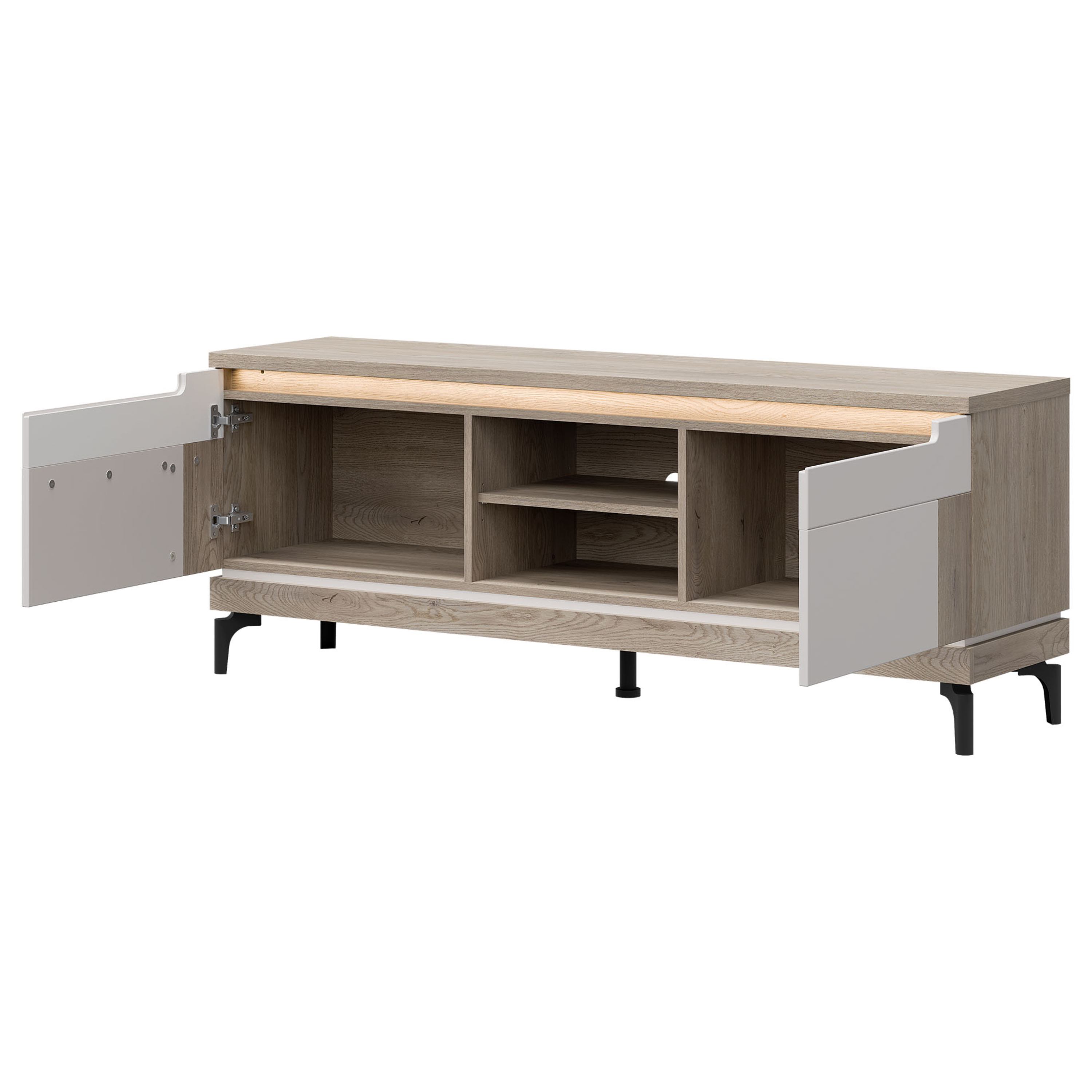 Uzatvára sa pomocou otočných dvierok, za ktorými sa nachádza priestor s vloženými policami. Na odloženie TV príslušenstva alebo vystavenie dekorácií slúži otvorená priehradka. Povrch komody sa vyznačuje jednoduchou údržbou. LED osvetlenie je možné dokúpiť samostatne.