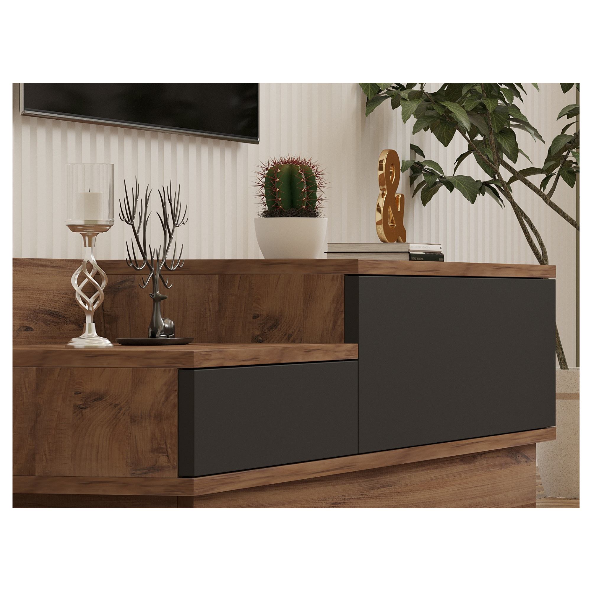 Disponuje 2 výklopnými dvierkami, ktoré odkrývajú 2 oddelené úložné priestory. Tie vytvárajú dostatok miesta na odloženie všetkého, čo potrebujete mať po ruke. Pravá strana ponúka priestor na umiestnenie televízie a ľavá na elektroniku, ovládače či dekorácie. Vyhotovenie bez úchytiek podčiarkuje jej jednoduchý vzhľad.